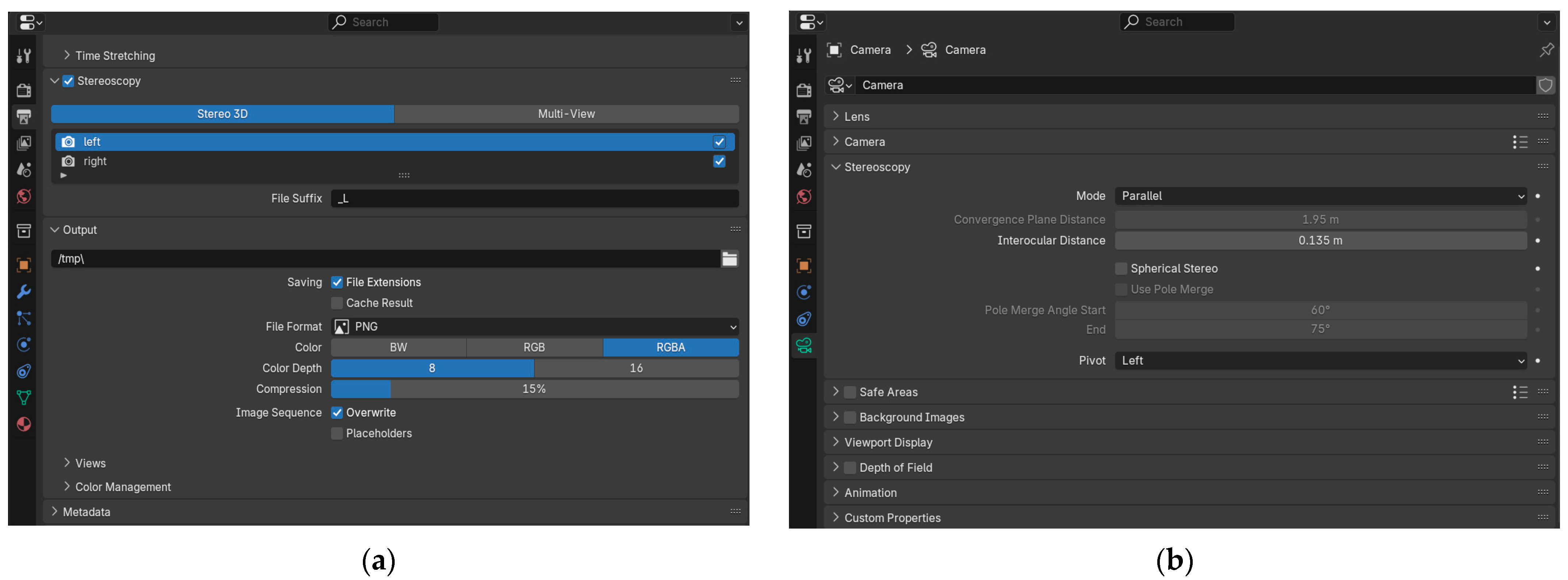 The implementation procedure is as follows. First, the stereoscopy function is enabled in Blender’s rendering settings, and the stereo imaging mode is set to Parallel in the camera parameters. This configuration allows the automatic generation of corresponding left and right images during the rendering process. To ensure consistency in camera parameter settings and to avoid errors caused by manual adjustment of camera position and orientation, the rendering workflow is automated through scripting. During rendering, the camera rotates around its initial position as the rotation center at fixed angular intervals, and at each rotation angle, a pair of left and right images is synchronously generated. The resulting stereo image pairs are subsequently used for component segmentation and spatial geometric computation, providing the data foundation for three-dimensional coordinate measurement and floor plan reconstruction of indoor components, with the configuration results shown in