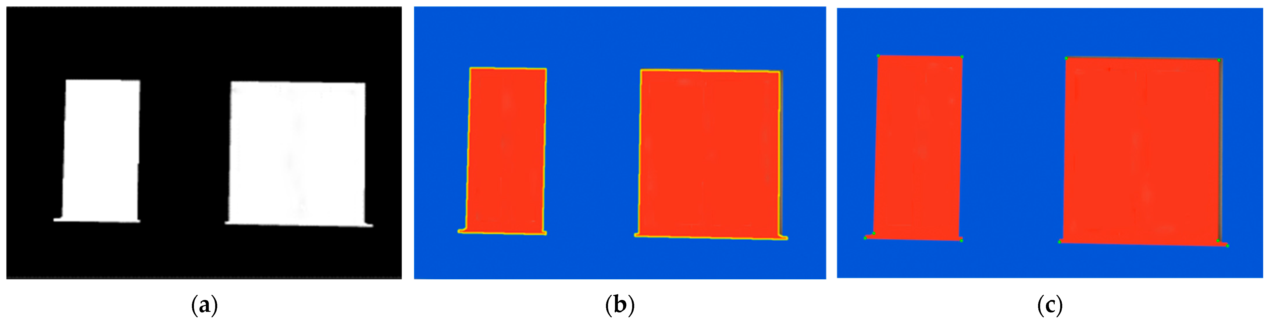 Figure 13. The experiment first involved calibrating the stereo camera used in the study to obtain the intrinsic parameters, distortion coefficients of the left and right cameras, as well as the relative pose between them. The calibration results were employed to establish an accurate imaging model, providing geometric constraints for the subsequent three-dimensional reconstruction of component corner points. The calibration accuracy was evaluated based on the estimated parameter uncertainties, and the relatively small deviations of both intrinsic and extrinsic parameters indicate that the calibration is stable and sufficiently accurate for reliable stereo matching and 3D reconstruction. After calibration, the stereo camera was positioned at an appropriate location inside the classroom to conduct multi-view image acquisition of the indoor environment. Paired left and right images were captured to ensure that major components such as walls, doors, and windows were effectively covered. For the acquired stereo image pairs, the previously trained model was applied to perform semantic segmentation of indoor components, obtaining segmentation results for three categories: walls, doors, and windows. Based on these results, further processing was conducted on the segmented images, including binarization, component contour extraction, and corner detection, in order to extract the key feature points required for subsequent spatial computation.