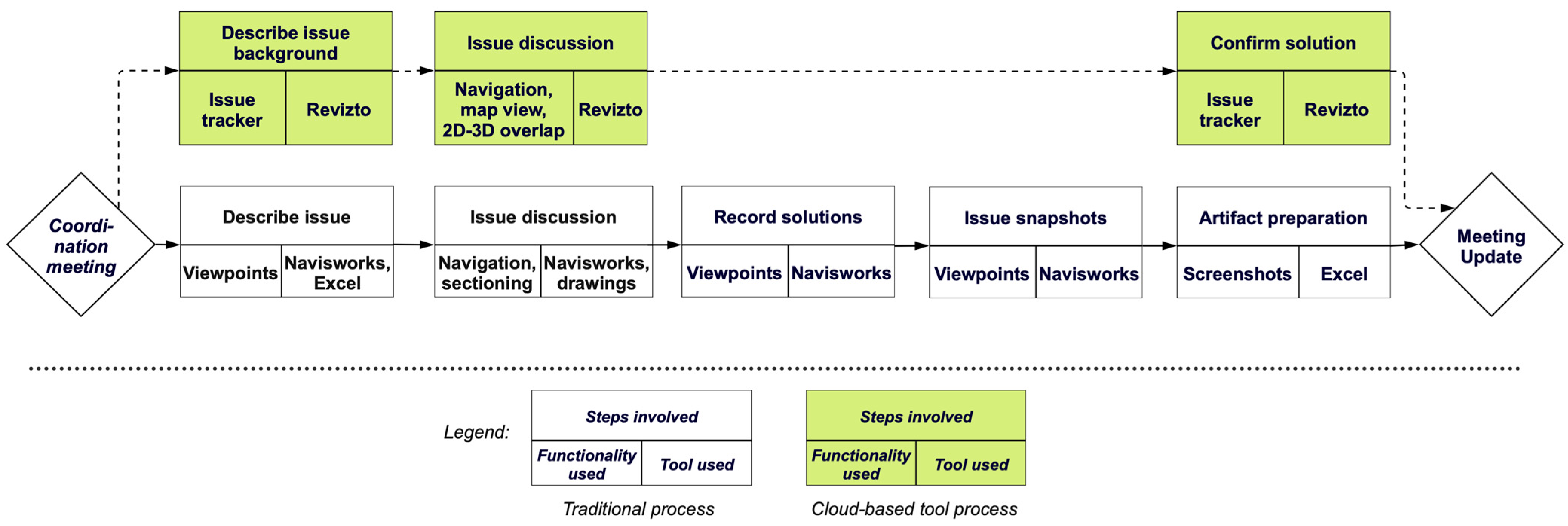 | Issue Resolution | The transitions required between Excel issue tracker and model are removed The transitions between 2D drawings and 3D model viewing are eliminated Meeting notes are added to the comment log | The common data environment of the cloud-BIM tool collates the meeting notes, model information, and issues for discussion The 2D-3D overlap feature enables viewing the 2D drawings for an area where the issue is located | Cloud-tool is the only tool used during the discussion in comparison to using 2D drawings, 3D models, and Excel tracker | Reduced transitions: For discussing issues during coordination meeting Increased information access: Cloud tool collates the 2D, 3D, and issue information | Meeting protocol: Setting issue discussion process—navigating by issues in each room vs. issues with a given priority Model size: Uploading drawings leading to large file sizes and slower navigation | Activity lens—medium (in-built features reduce the steps involved around discussing an Issue) Functionality lens—high (cloud tool enables functionalities such as 2D-3D model data overlap that was unavailable earlier) Artifact lens—high (need for external Excel issue tracker and 2D drawings eliminated) |