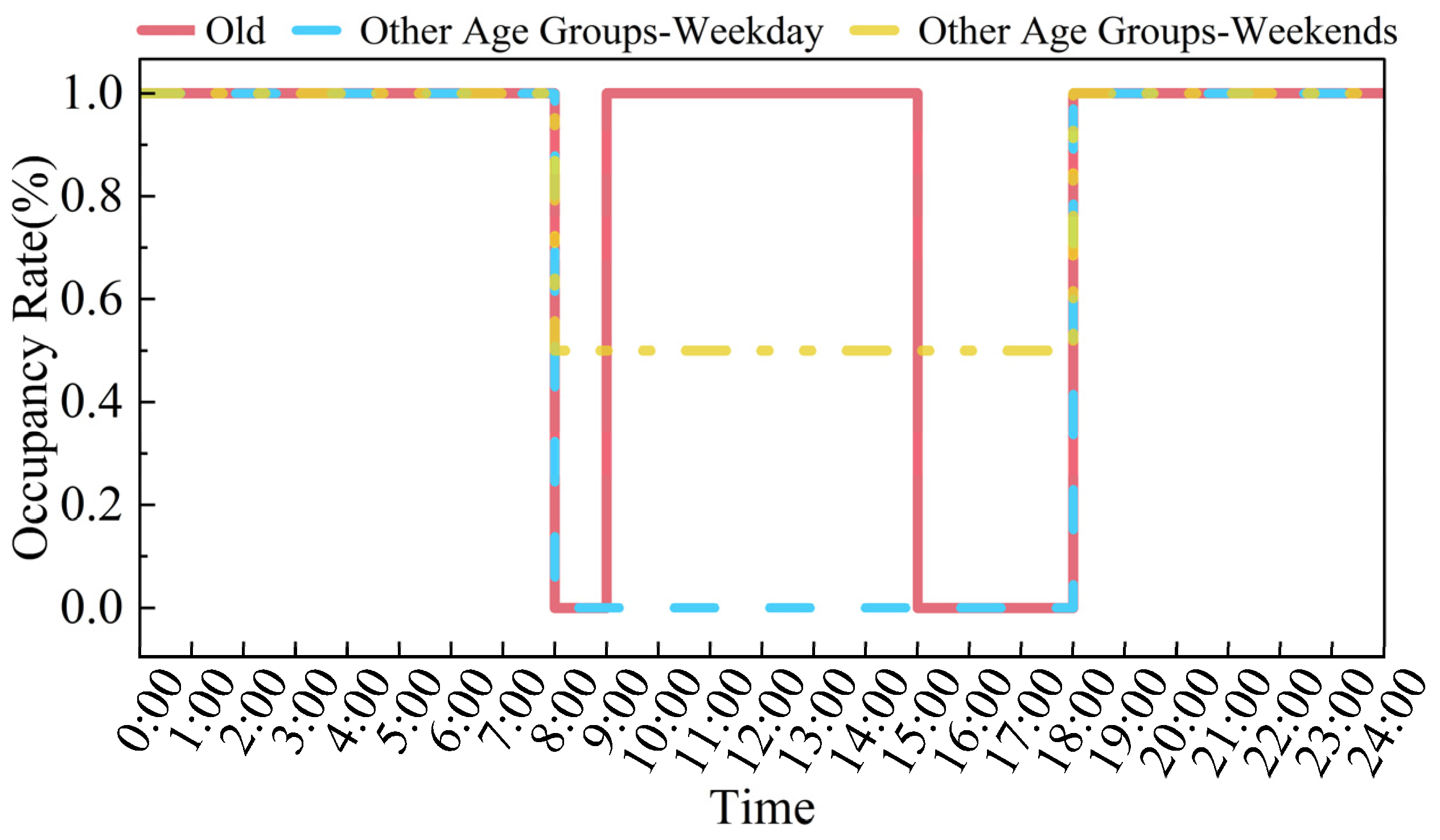| Occupancy rate | time-use survey/residential occupancy model | age definition clear, residential context | keep common trend, avoid extremes | hourly weekday/weekend schedule |