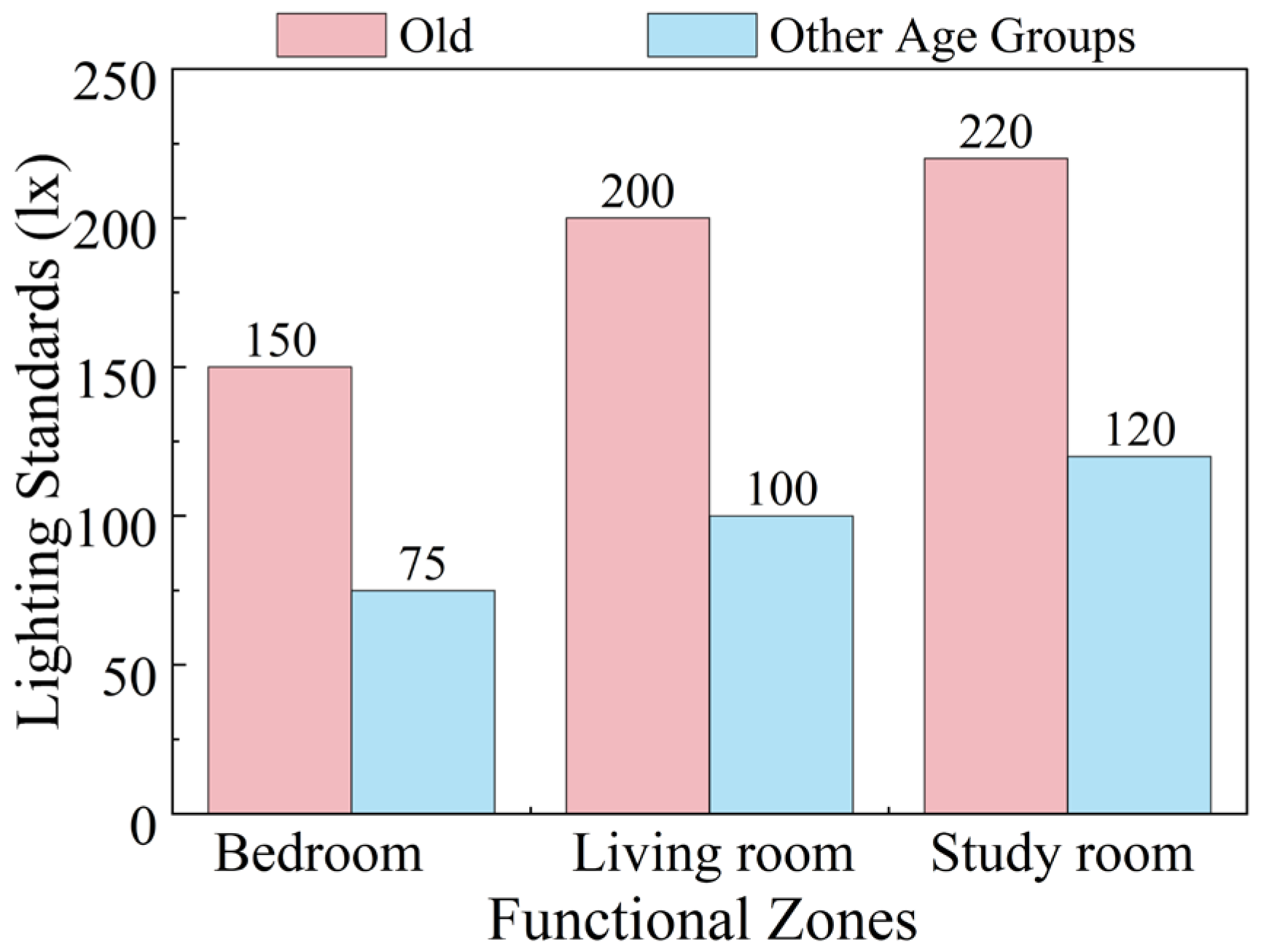 | Illuminance requirement | standards + empirical studies | zone-specific and age-relevant | choose representative value/range | zone illuminance threshold |