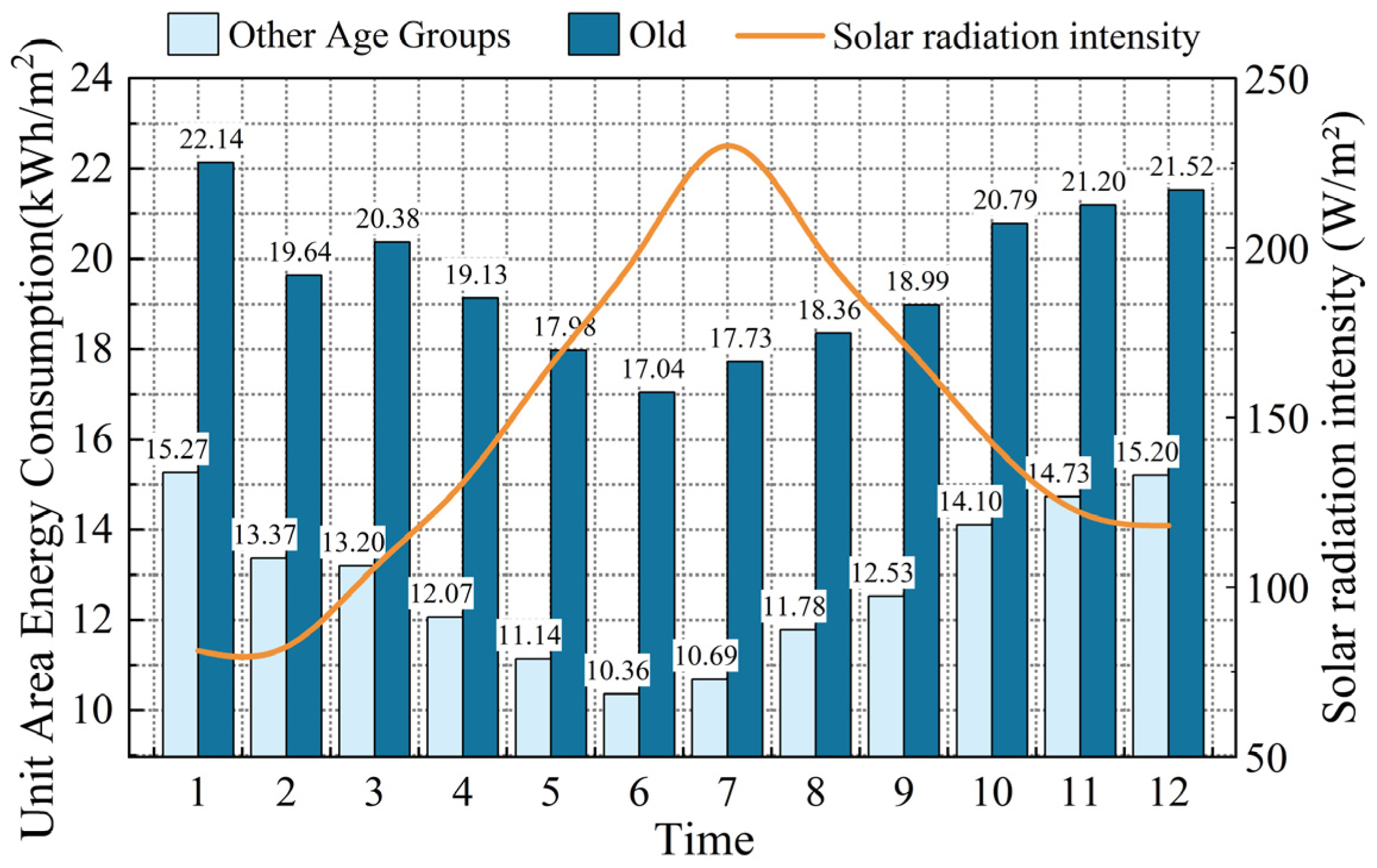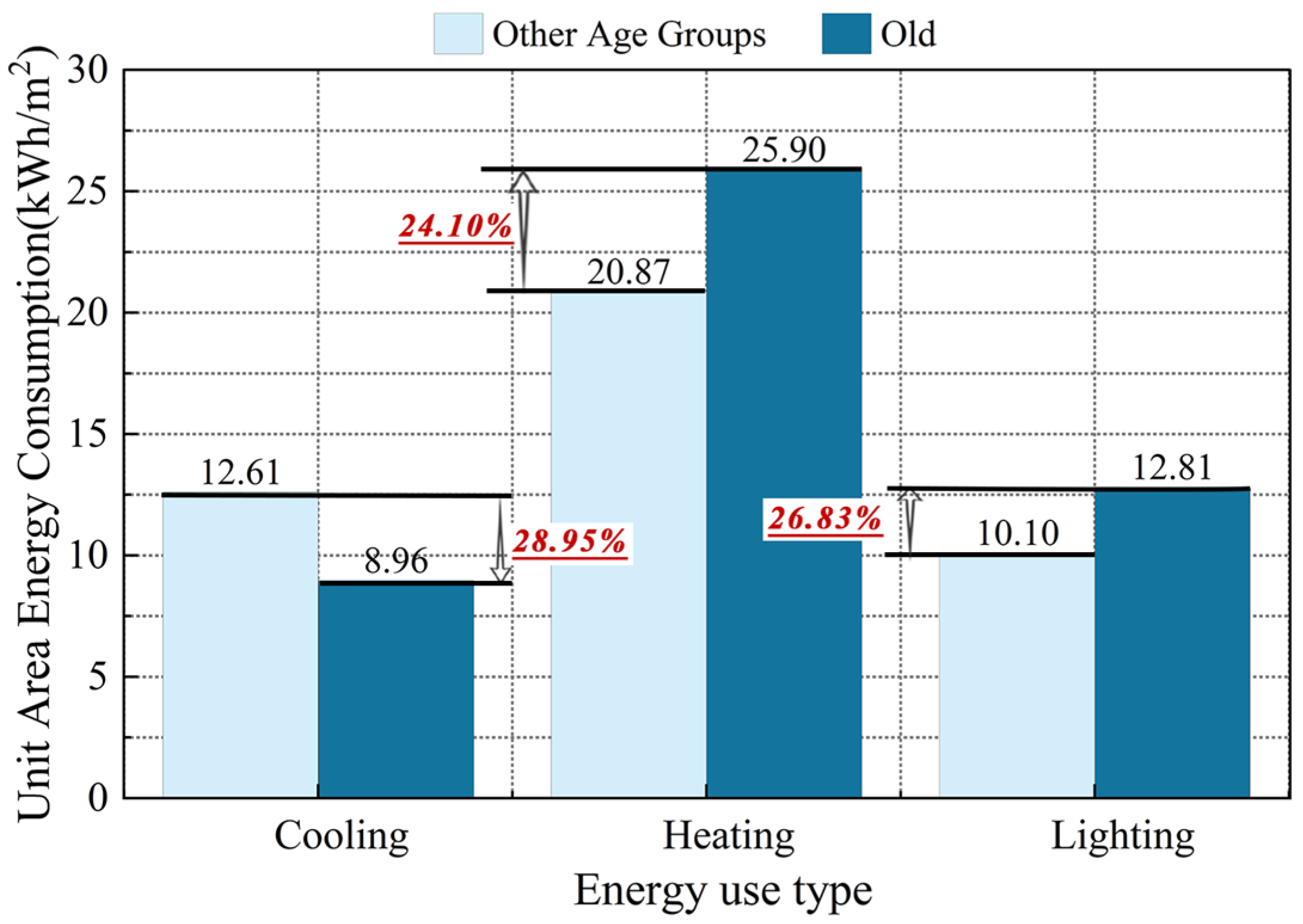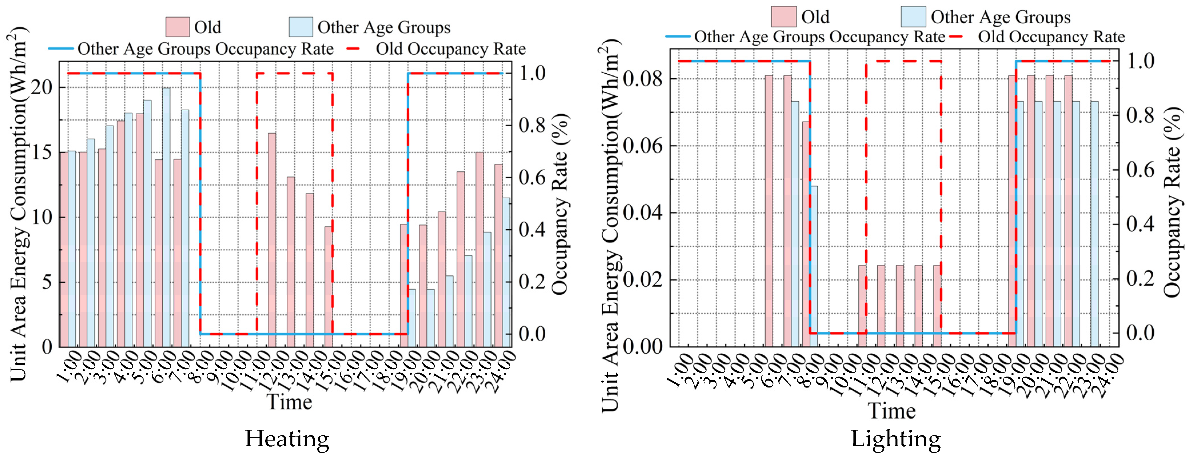 - Elderly-oriented occupancy produces a distinct baseline residential energy-use structure. Compared with the non-elderly comparison group, elderly-oriented dwellings exhibit higher heating demand, higher lighting demand, and relatively lower cooling demand. As a result, annual energy use is governed more strongly by persistent winter heat losses and age-related visual comfort requirements than by short-duration summer cooling peaks.