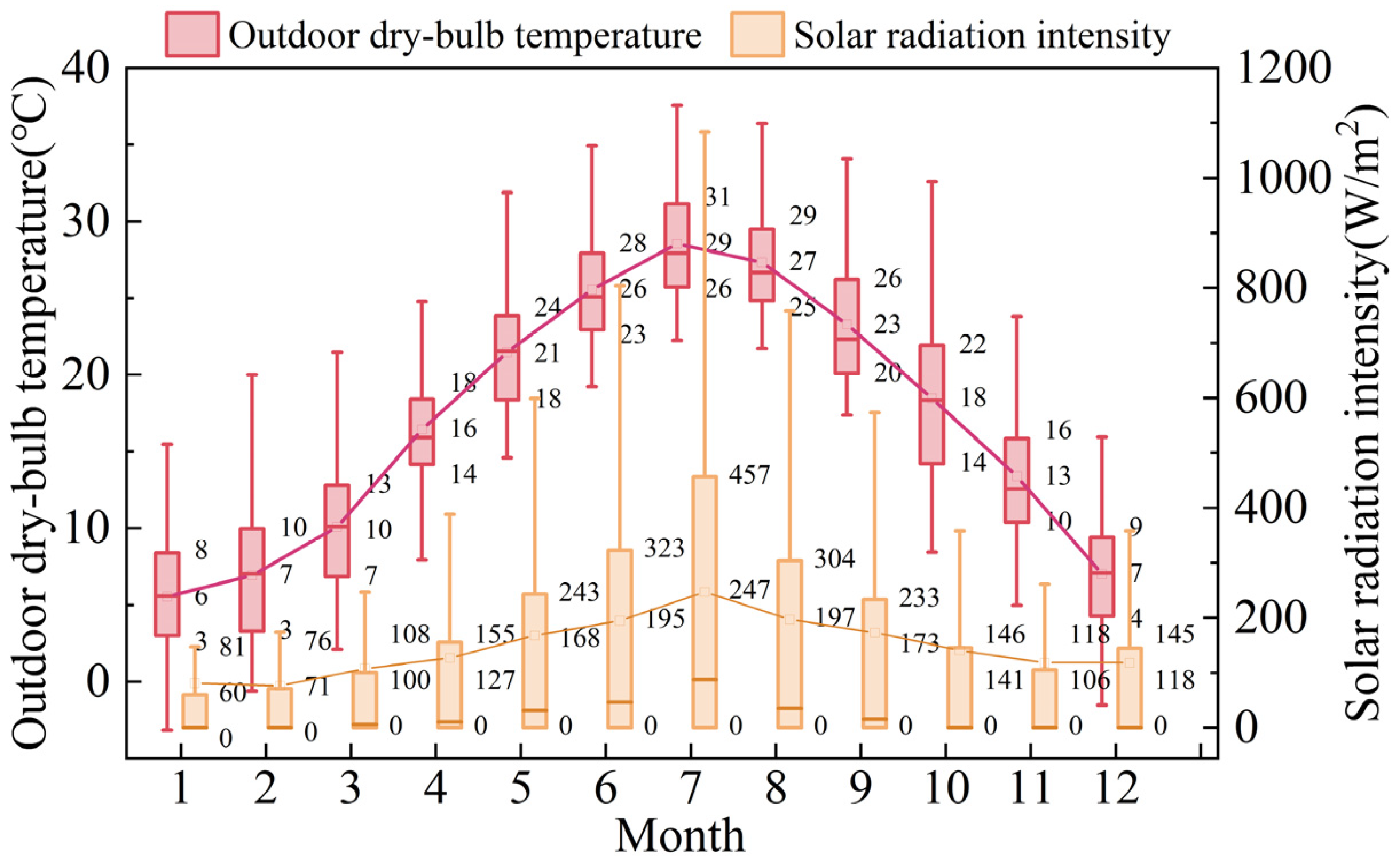 | Exterior wall | 20 mm cement mortar + 200 mm sintered perforated brick + 20 mm cement mortar + 15 mm flame-retardant extruded polystyrene (XPS) board + 15 mm cement mortar + 5 mm paint finish | Thermal transmittance, K = 1.0 [W/(m2·K)] |