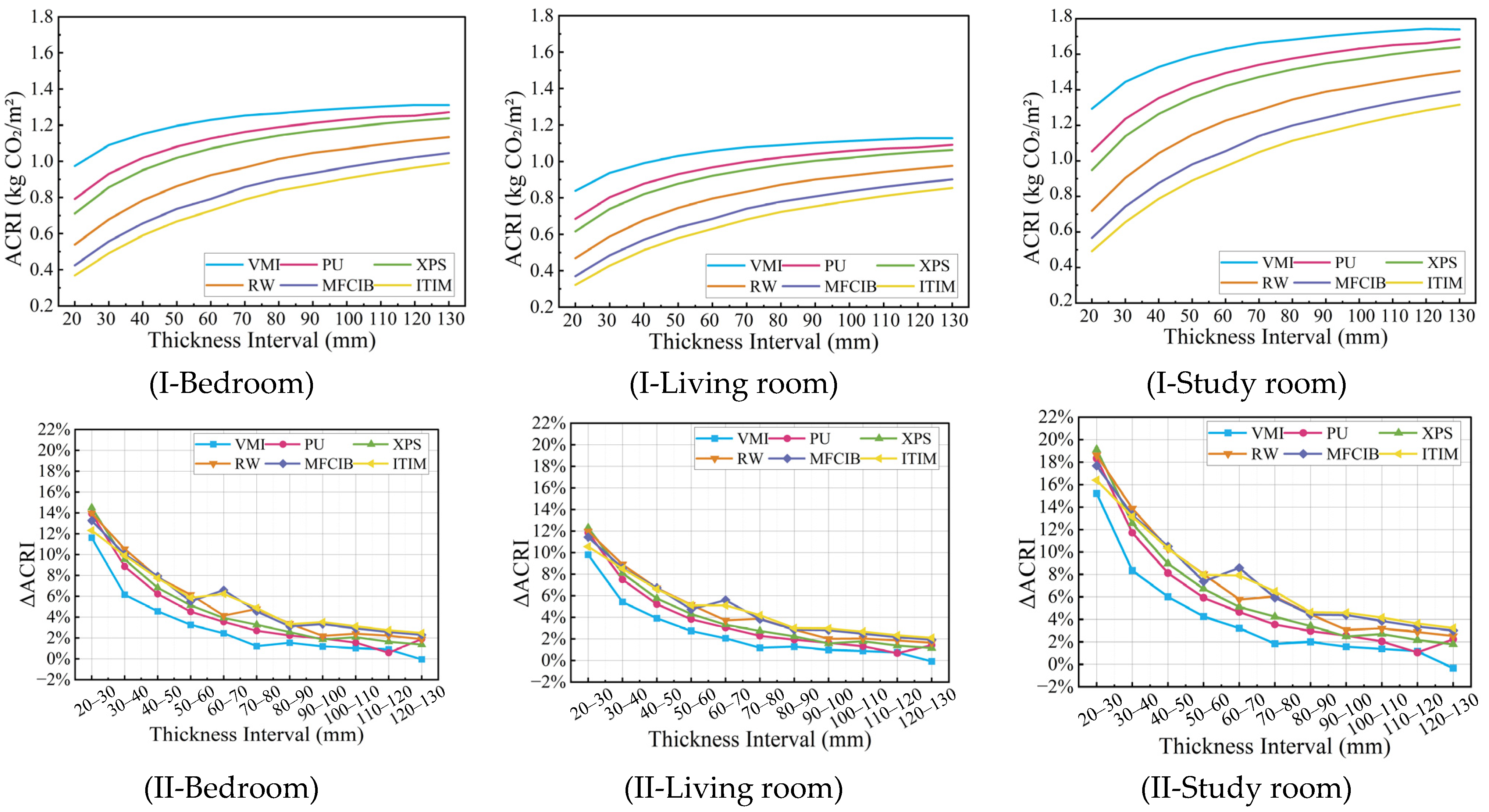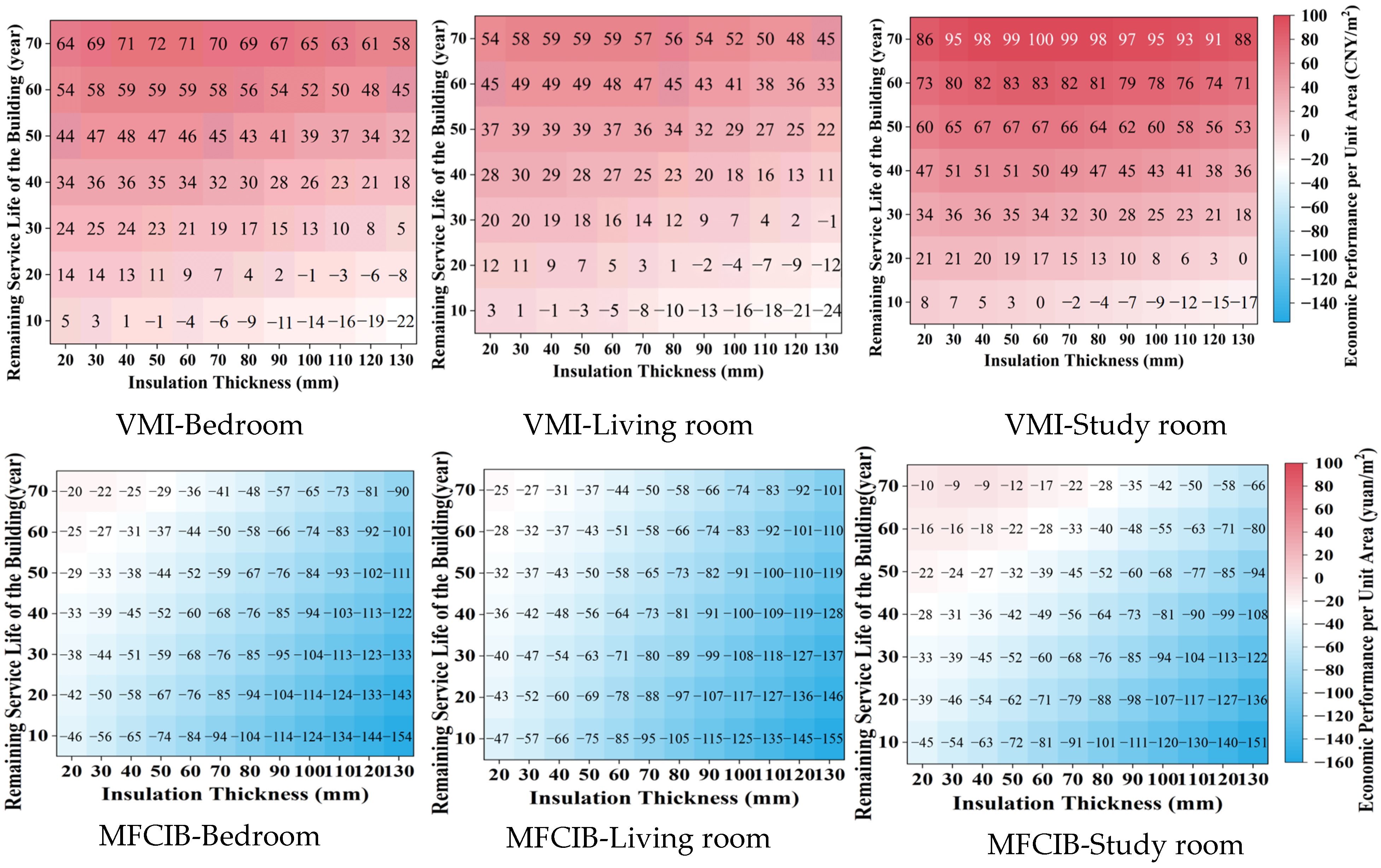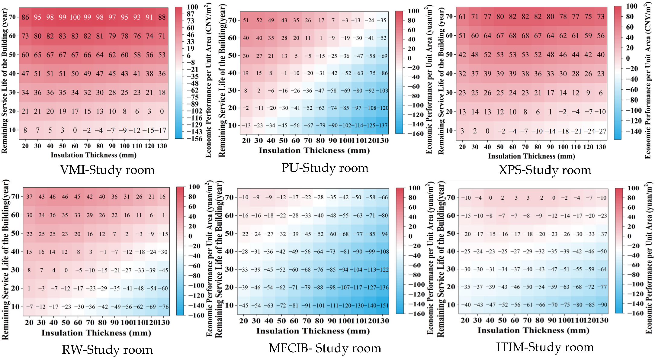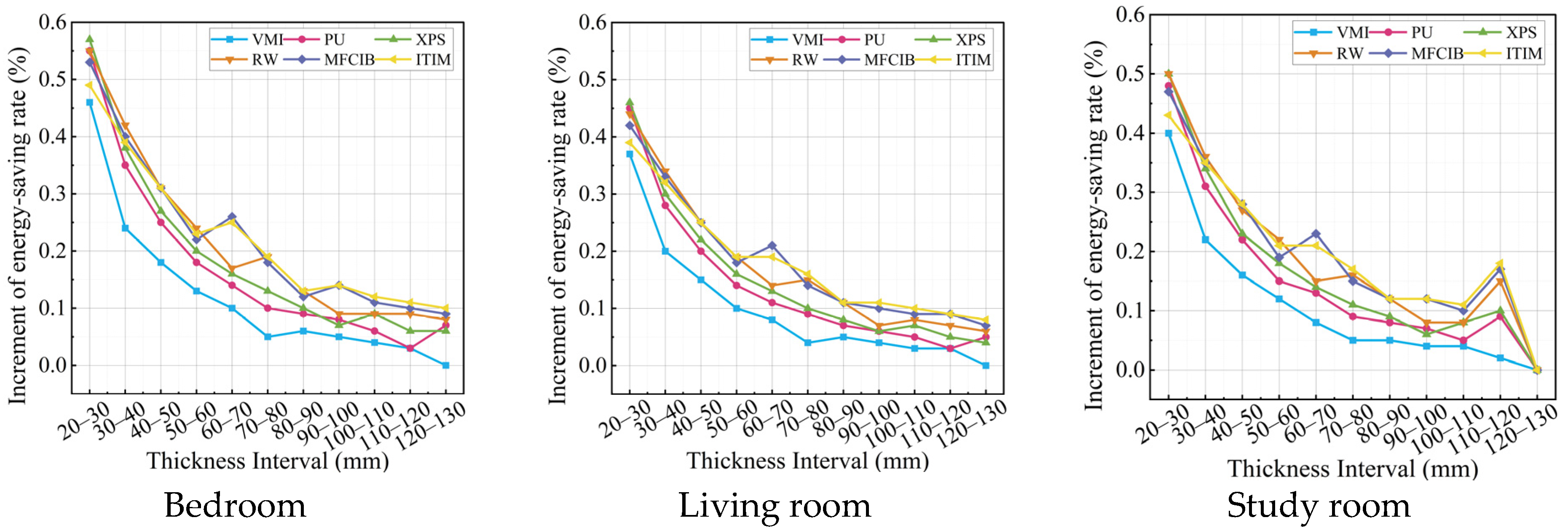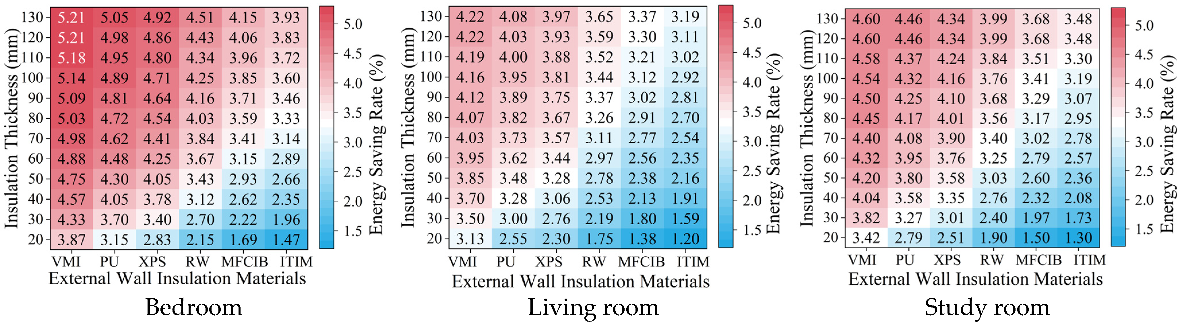 - Exterior wall insulation retrofits show the most robust overall performance under elderly-oriented occupancy. Across energy, economic, and environmental evaluations, moderate insulation thicknesses—especially 40–60 mm—provide the best overall balance between technical performance and lifecycle feasibility. Among the evaluated materials, vitrified microbead insulation performs best overall, while the study room and bedroom exhibit higher retrofit sensitivity than the living room.