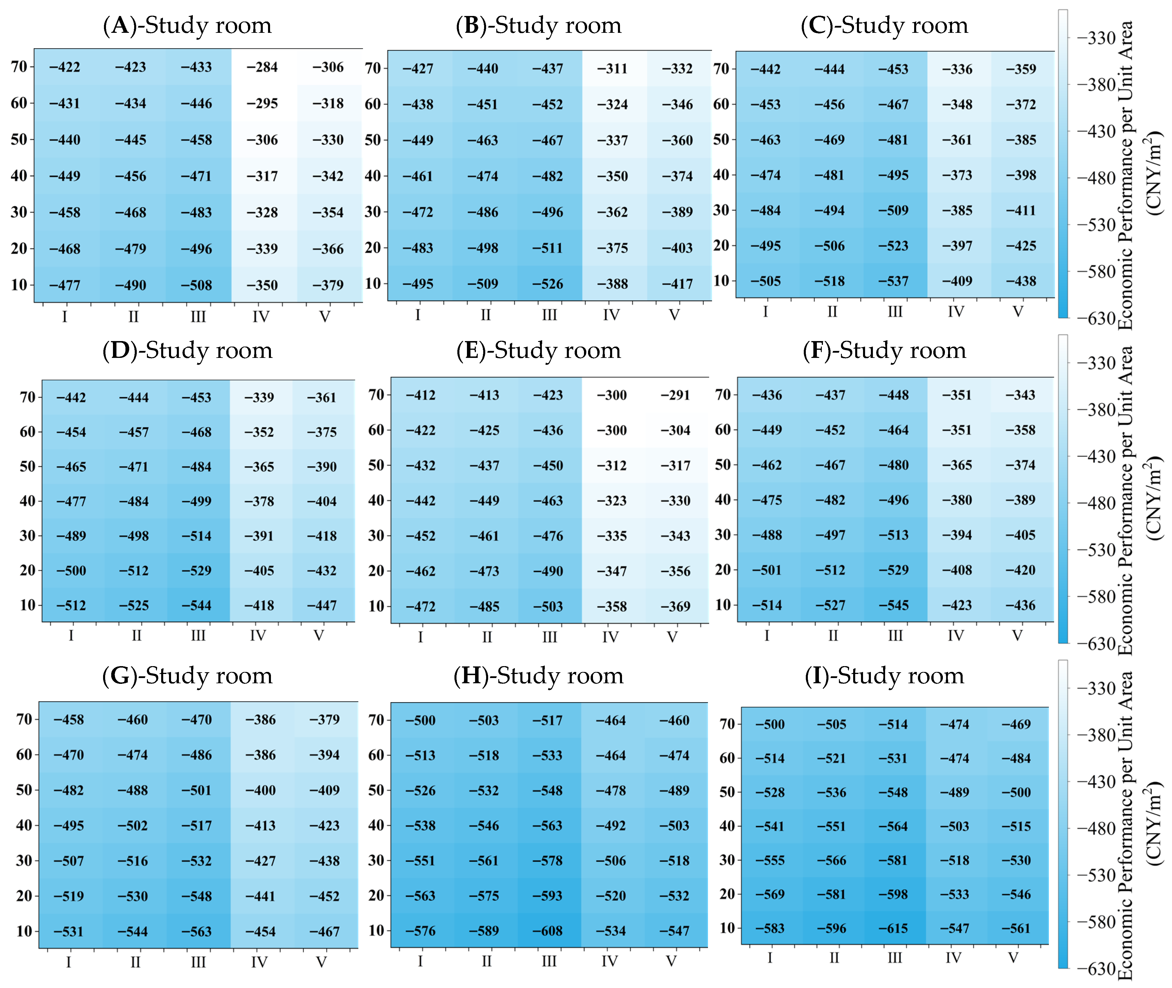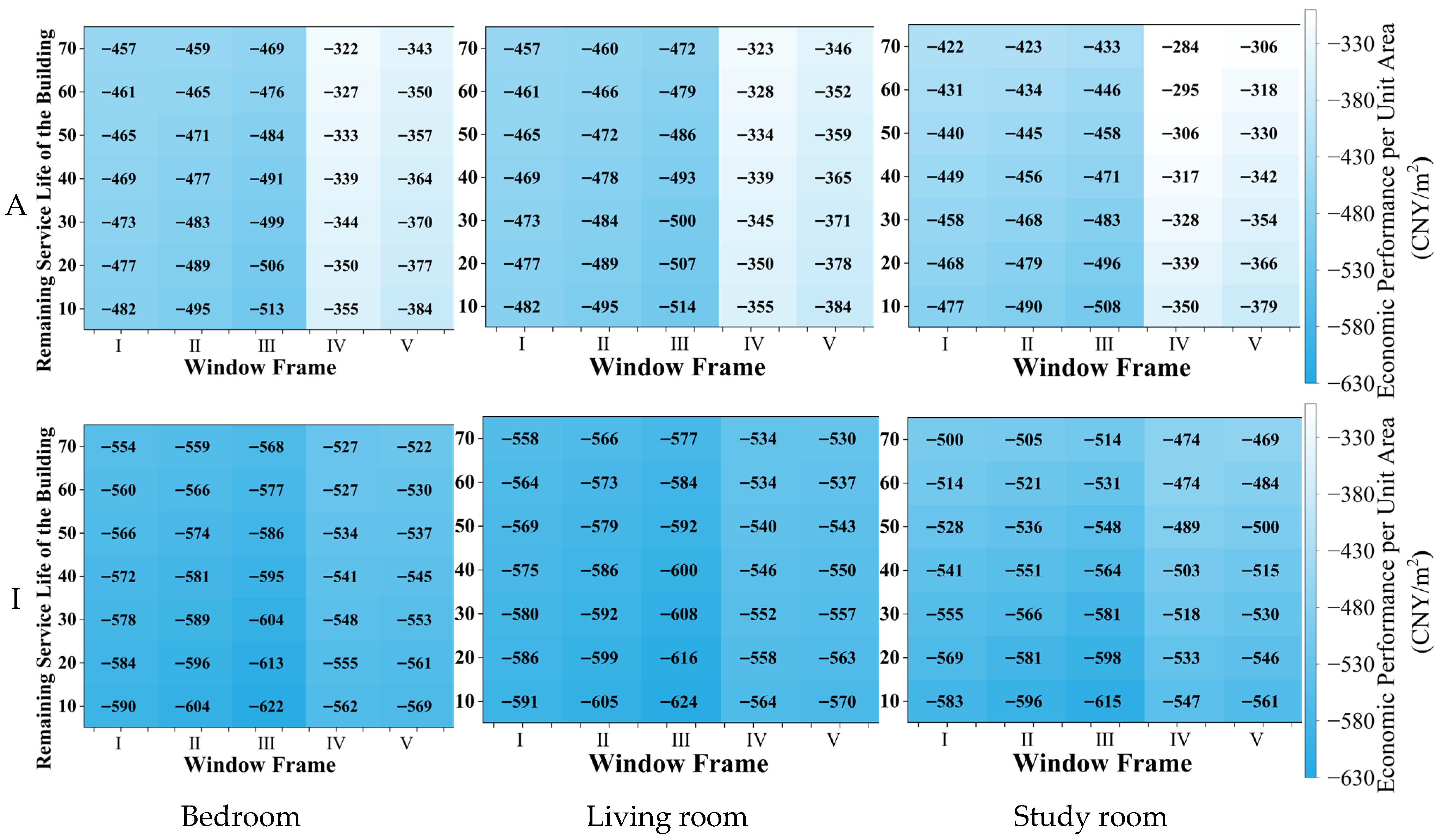 - Window retrofit measures yield only limited overall benefits under the evaluated conditions. Although window upgrades can reduce energy consumption to a certain extent, their effects are substantially weaker and less stable than those of exterior wall insulation. Under the assumed cost conditions and elderly-oriented demand profile, all evaluated window retrofit schemes remain economically unfavorable, even under long-remaining service-life scenarios.