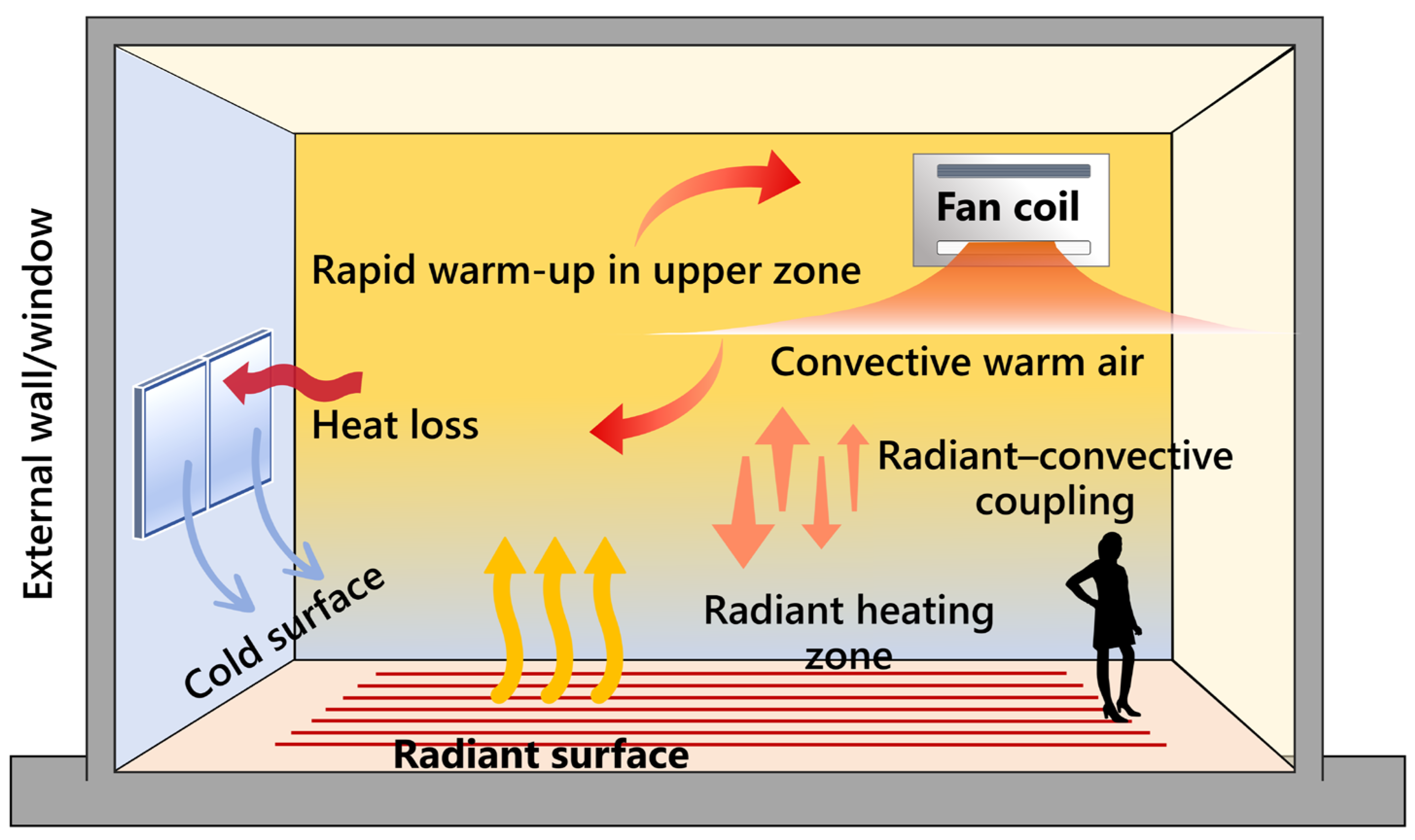 Despite the reported advantages of combined RF + FCU heating systems, their operation involves a complex heat transfer process. As illustrated in