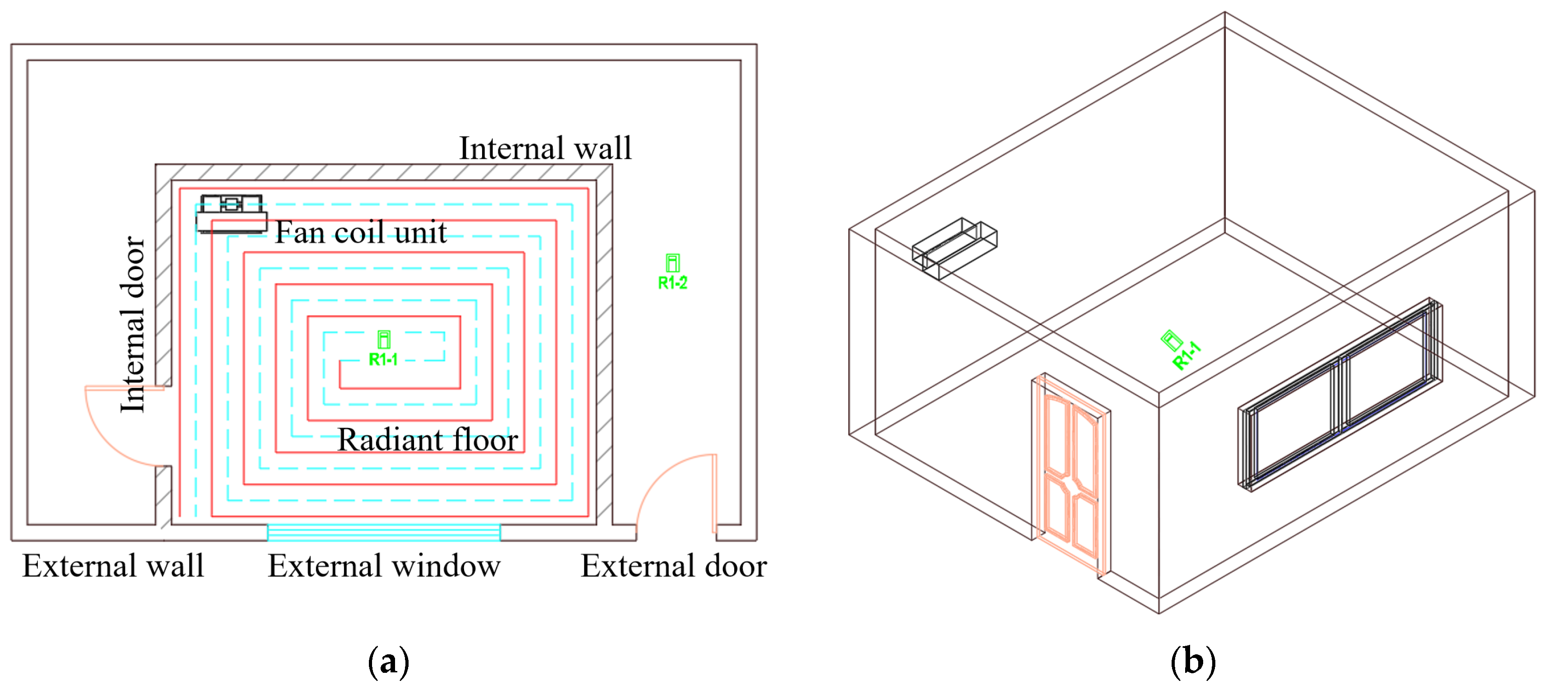 - Zhu, X.; Wang, H.; Han, X.; Zheng, C.; Liu, J.; Cheng, Y. Experimental study on the operating characteristic of a combined radiant floor and fan coil heating system: A case study in a cold climate zone. Energy Build. 2023, 291, 113087. [Google Scholar] [CrossRef]