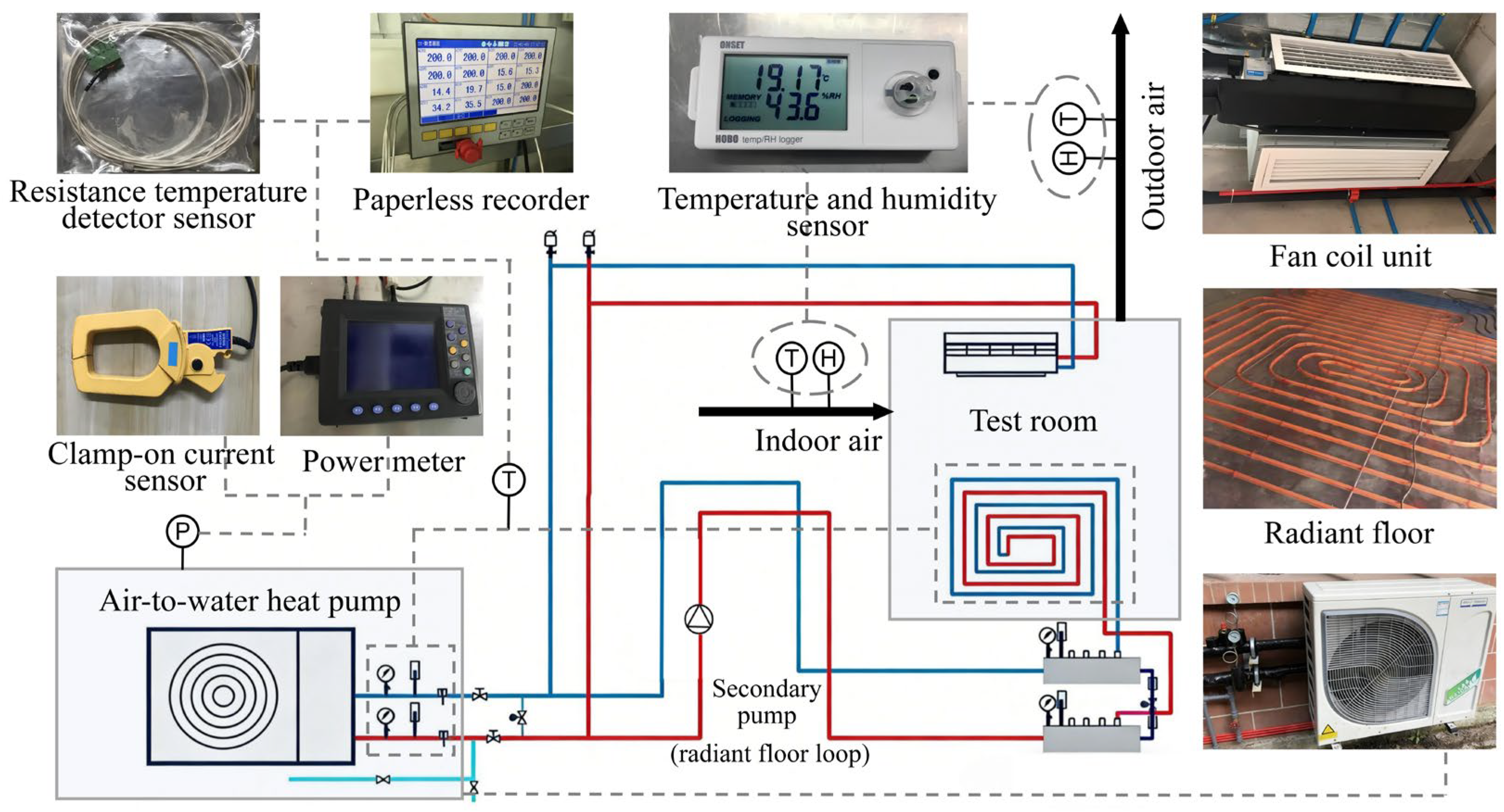 To achieve the research objectives, an experimental platform featuring an ASHP-driven combined RF and FCU heating system was established. The system primarily consists of an ASHP outdoor unit and two types of terminal units, as well as relevant piping, described as follows.