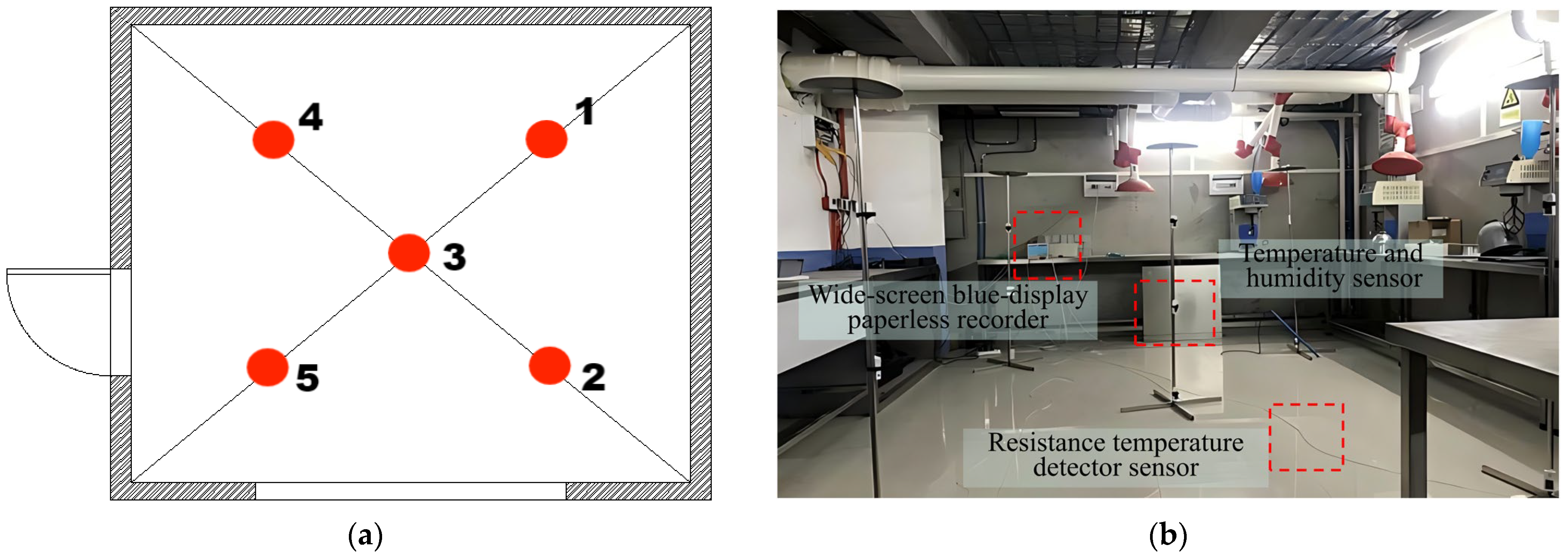 In terms of the indoor environment, a dense array of measurement points was deployed within the room. Five representative horizontal positions were selected at equidistant points along two floor diagonals, as illustrated in
