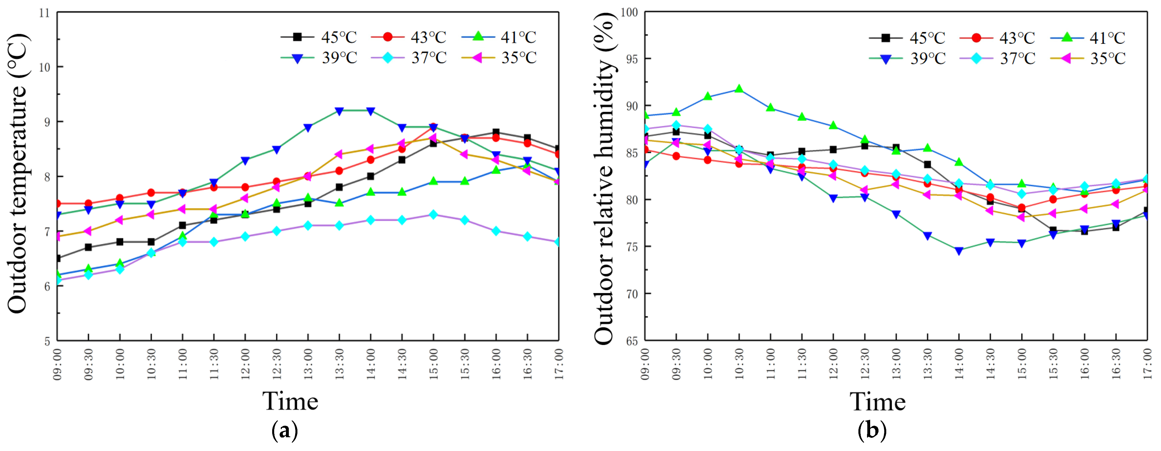 29]. Although the supply water temperature was the primary control variable in this study, slight variations in outdoor conditions were unavoidable among different test days. Therefore, outdoor temperature and RH were monitored to ensure the comparability of the experimental results.