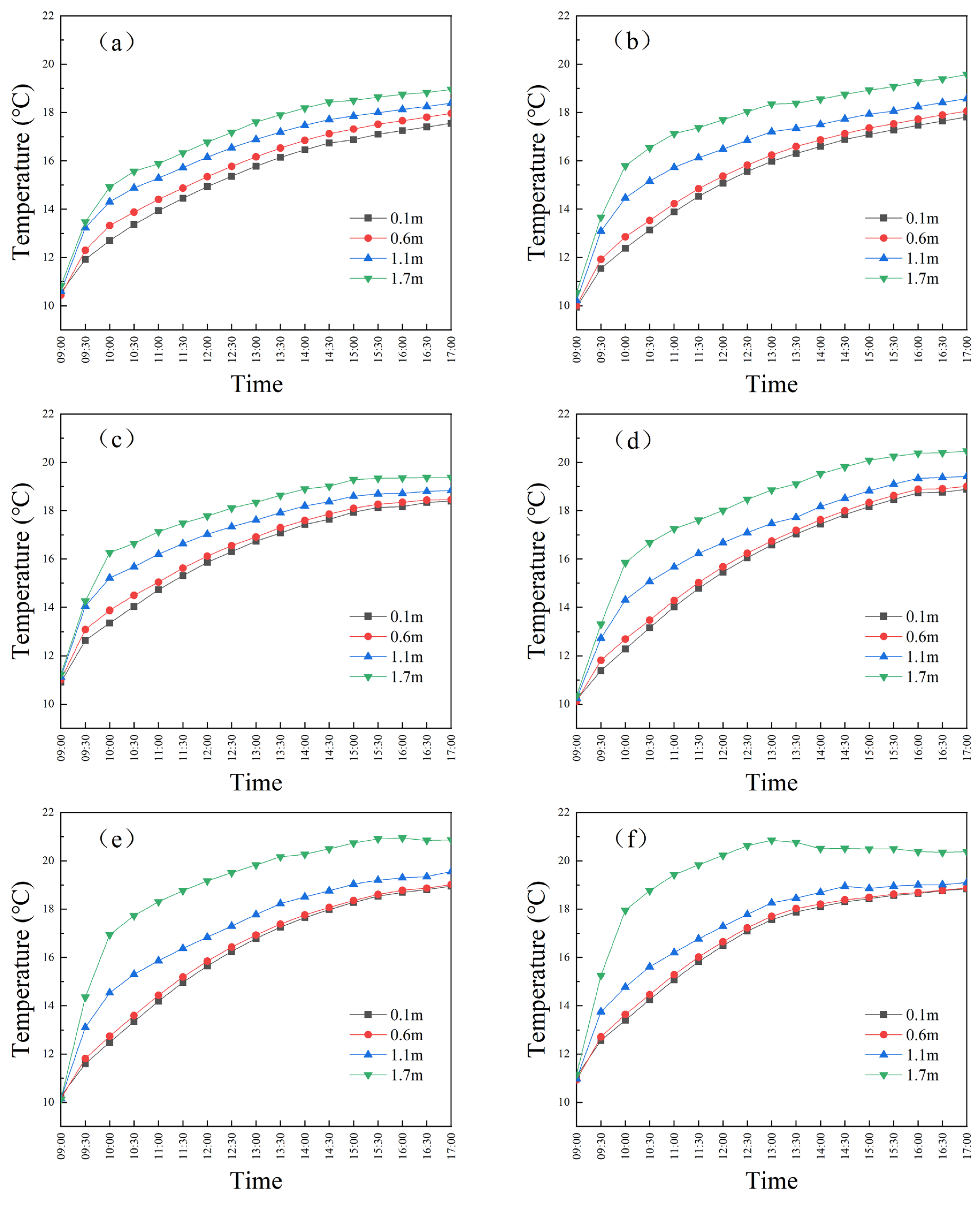 Figure 6a–f. It is noted that the temperature data are the average values of the five horizontal measurement points at a specified height.