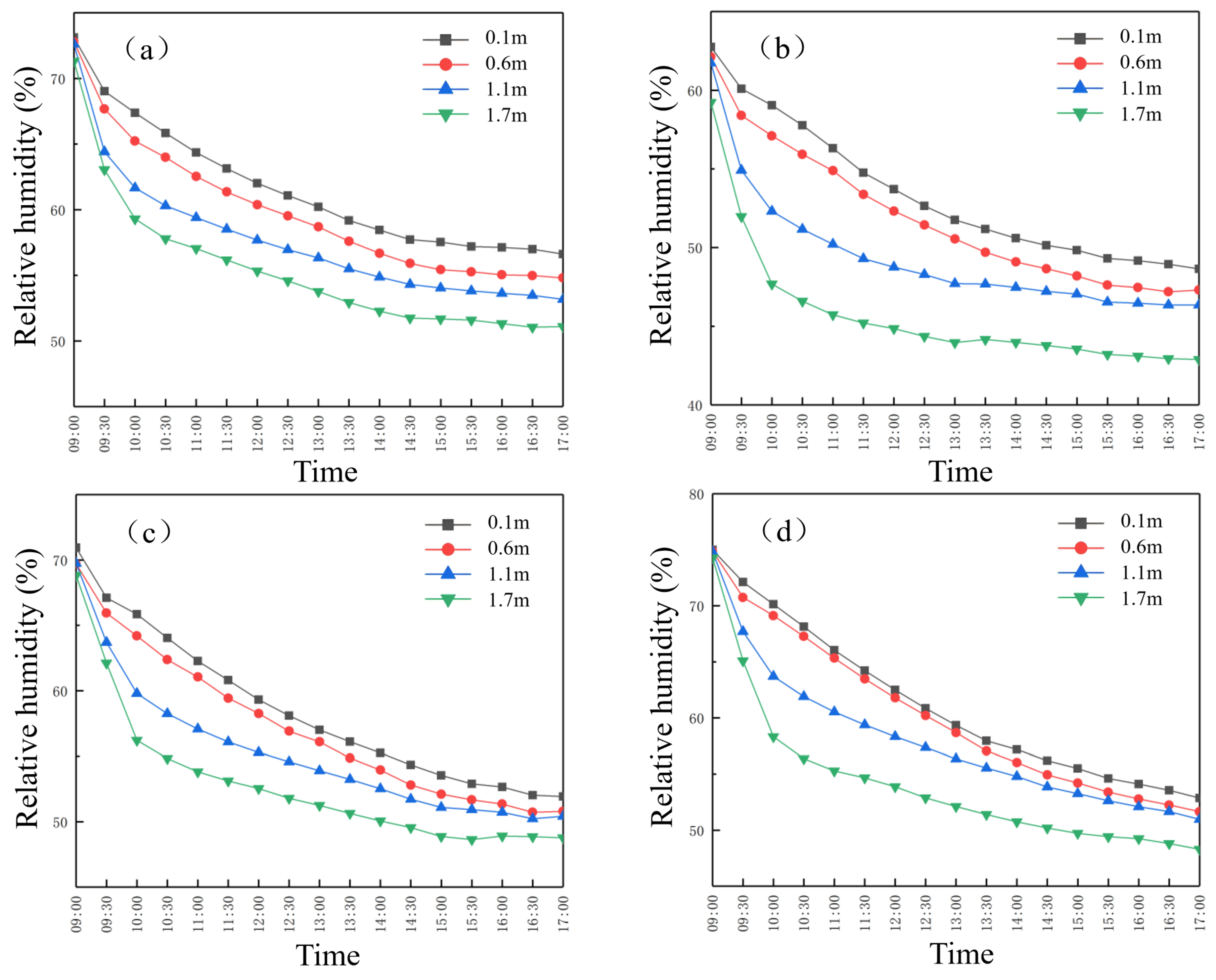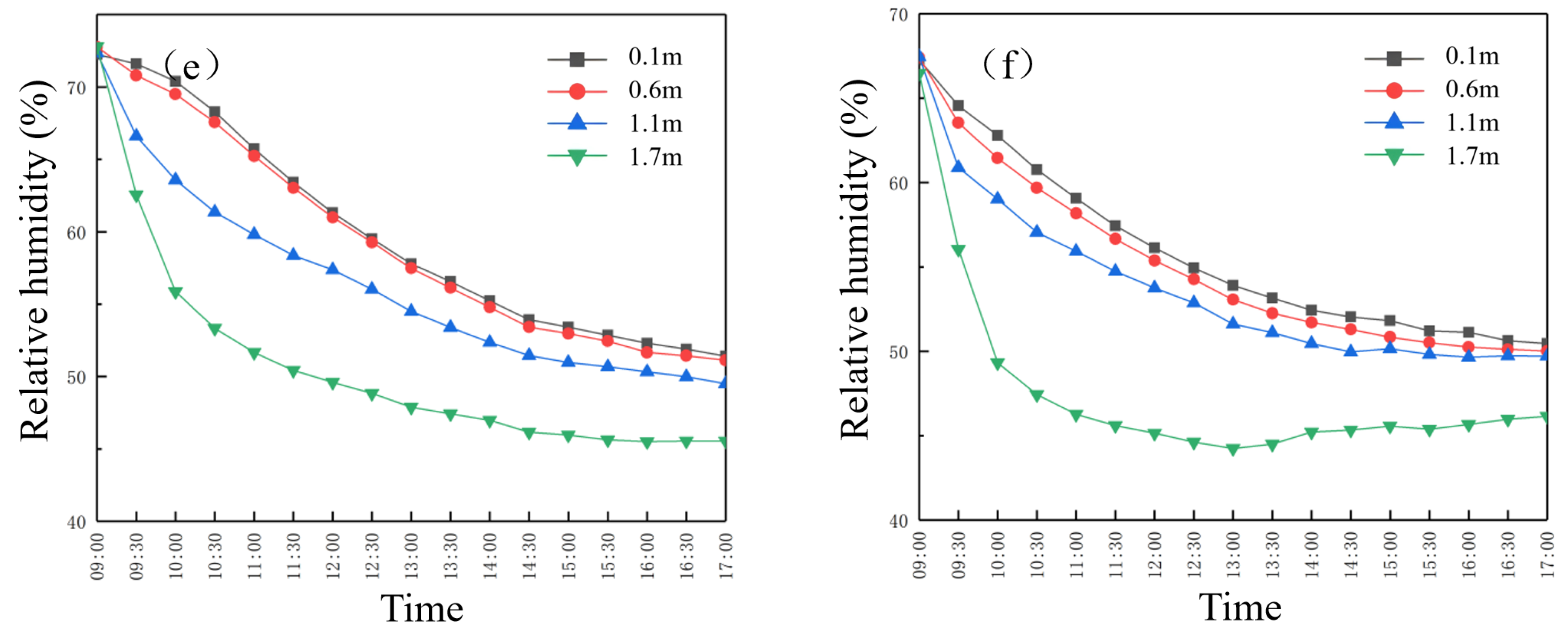 Figure 7a–f illustrate the vertical indoor relative humidity (RH) responses under different supply water temperature conditions. The data are the average values of the five horizontal measurement points at a specified height. In contrast to air temperature, RH exhibited a decreasing trend throughout the operating period at all heights, with the most rapid reduction occurring during the initial 1–2 h. This behavior corresponds to the temperature evolution observed in