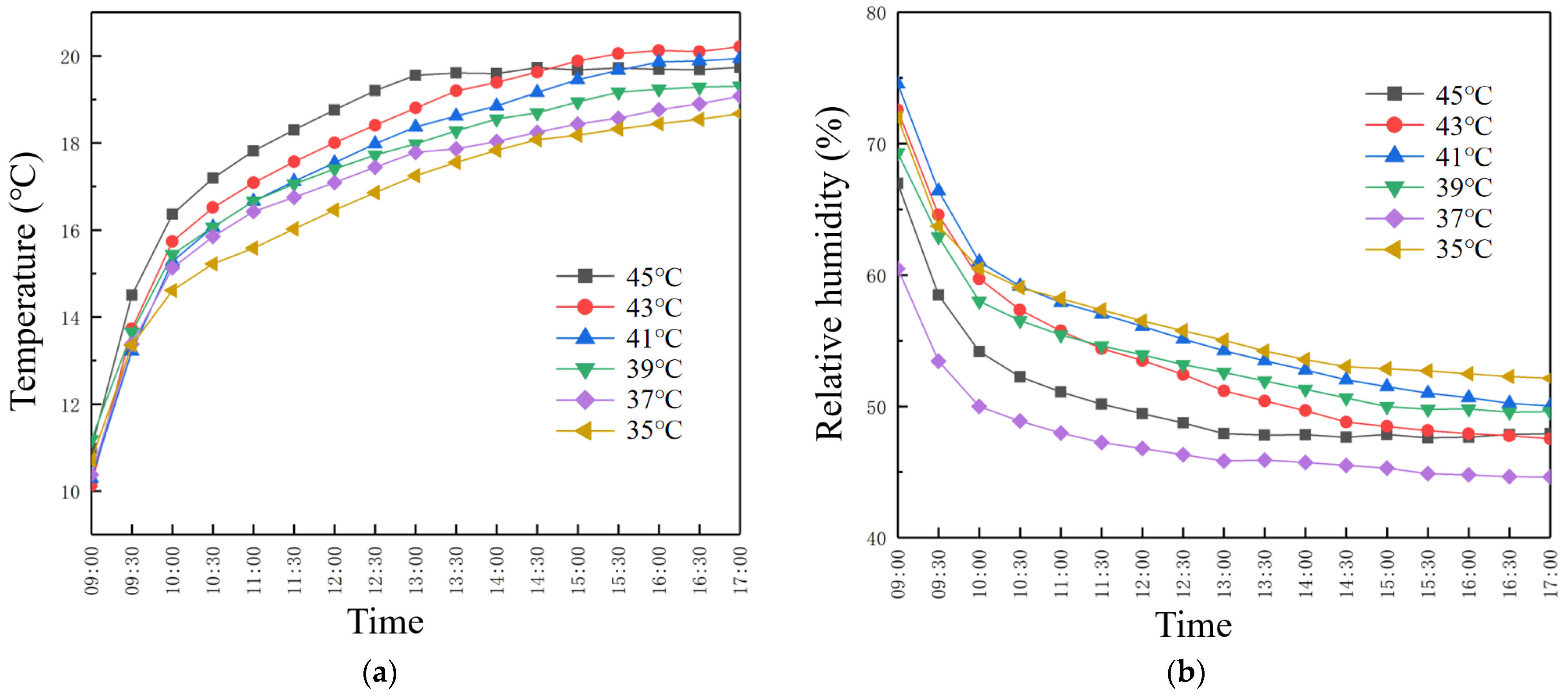 Figure 5a,b presents the measured outdoor temperature and RH profiles for all operating cases. During the experimental period, outdoor temperature ranged from 6.1 °C to 9.2 °C, while RH varied between 74.6% and 91.7%, which is representative of the cold and humid winter conditions in Chongqing. Across all test days, the outdoor temperature and RH profiles exhibited similar temporal trends. The average outdoor temperature varied between 6.85 °C (for the 37 °C supply condition) and 8.28 °C (for the 39 °C supply condition), while the average RH ranged from 79.76% (39 °C supply condition) to 85.67% (41 °C supply condition). In summary, although outdoor air temperature and relative humidity varied slightly across different test days, the magnitude of these variations was limited. These data provide an appropriate condition for comparing the indoor thermal response and system behavior under different test settings.