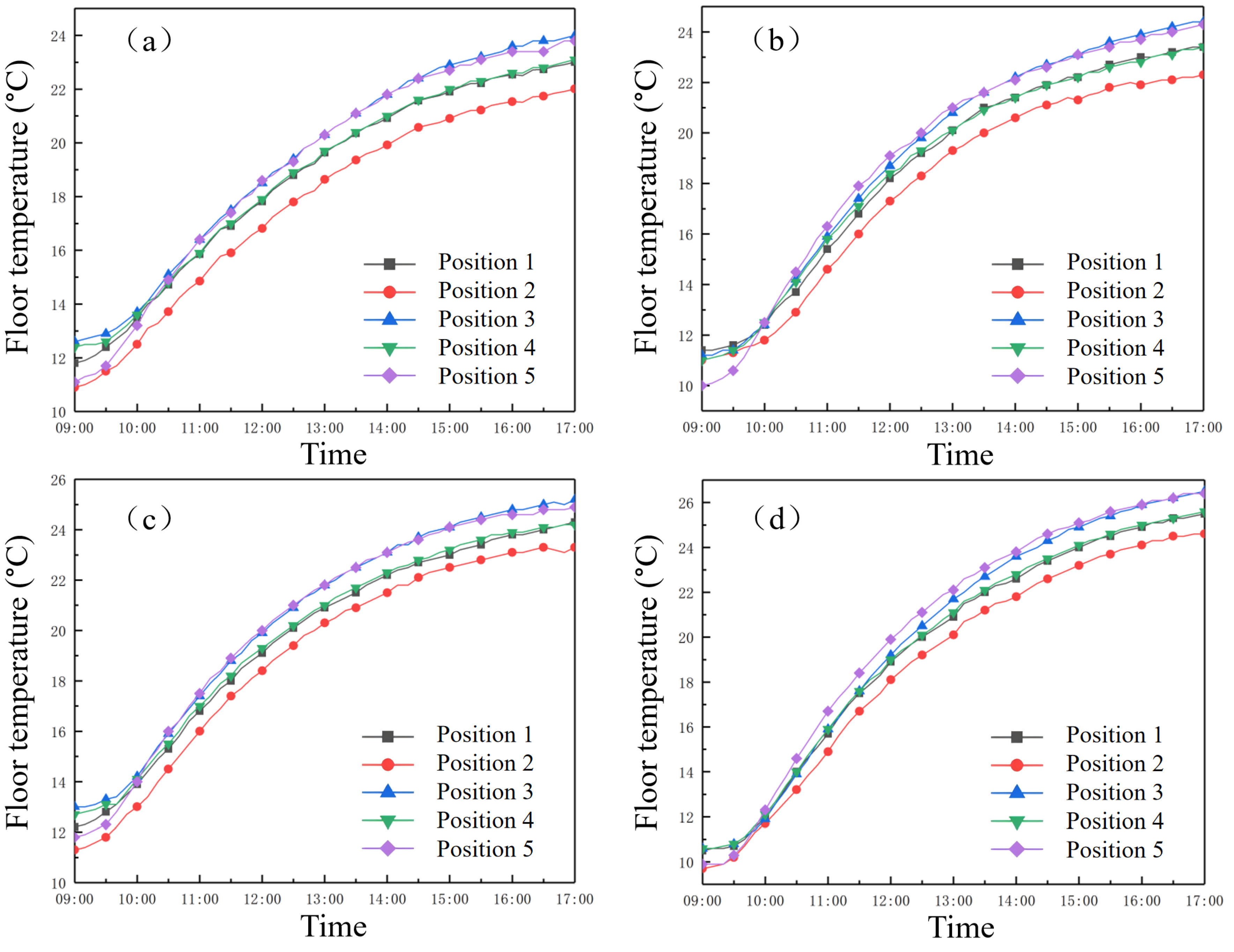 Figure 4a, five floor temperature measurement points were positioned directly beneath each vertical sensor stack. Measurement points for the supply and return water temperatures were respectively installed on the corresponding outdoor pipelines. A total of seven measurement points (comprising five for FST and two for supply/return water temperatures) were monitored in real time using resistance temperature detector (RTD) sensors. Data acquisition was performed via a wide-screen blue-display paperless recorder (Model MR4300, Hangzhou Mengkong Instrument Technology Co., Ltd., Hangzhou, China), with a sampling interval set to 1 min. Furthermore, all RTD sensors were calibrated in a high-precision constant-temperature water bath prior to installation to ensure that the measurement uncertainty remained below ±0.1 °C.