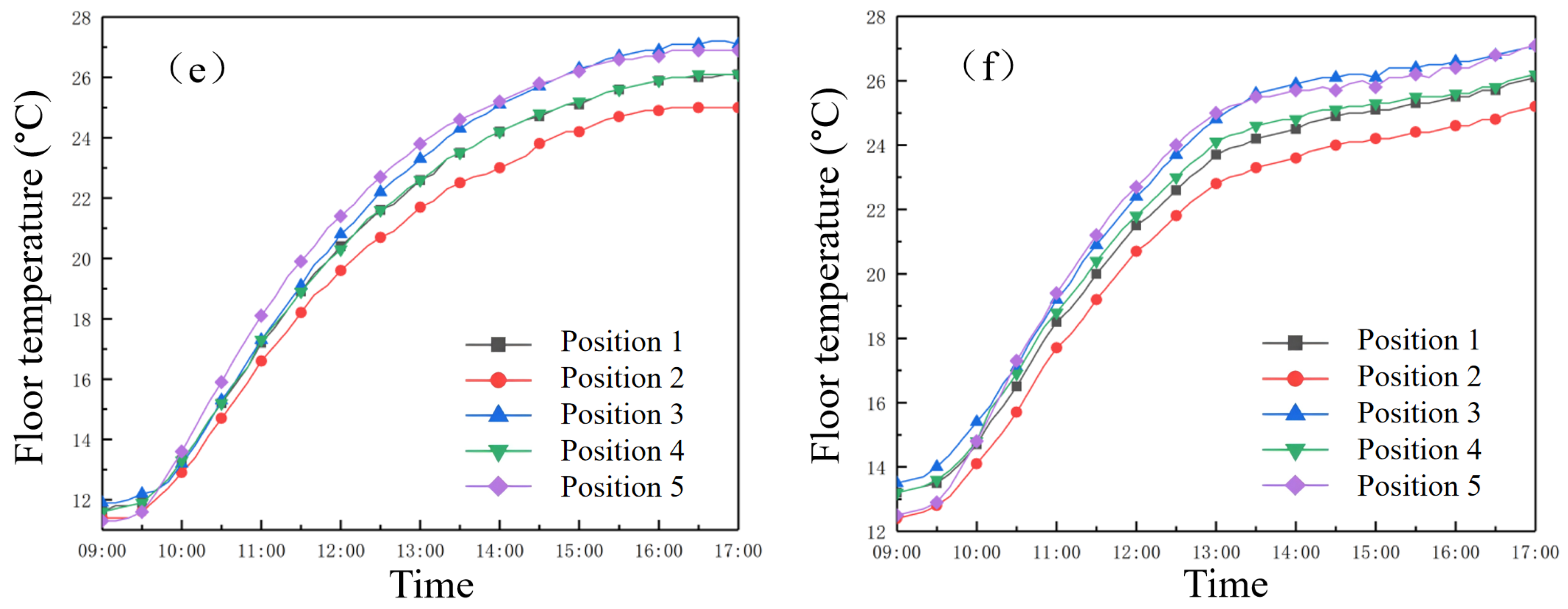 Figure 6f), the temperature difference between 1.7 m and 0.1 m reached 2.62 °C within the first 30 min. With continued operation, temperatures at lower heights (0.1–1.1 m) increased steadily, and vertical temperature differences within the occupied zone gradually decreased, with the growing contribution of the radiant floor. However, this improvement required a prolonged operating period and was not achieved immediately.