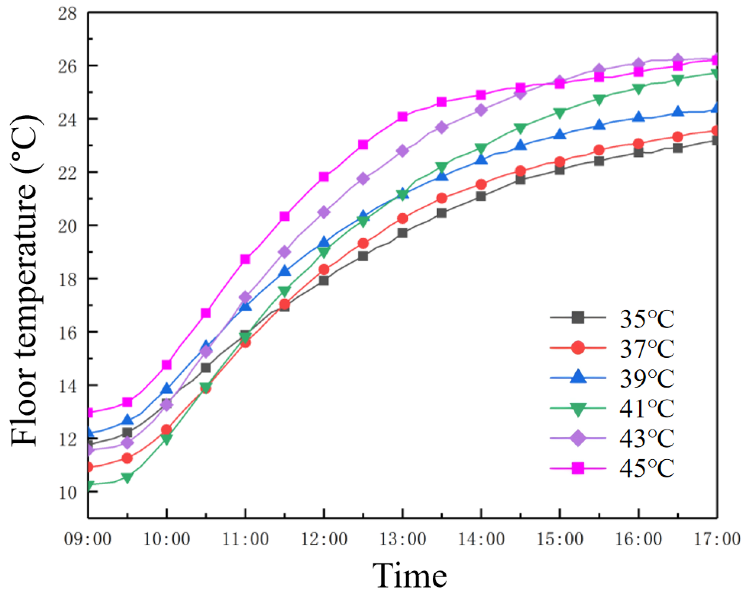 Supply water temperature mainly affected the rate of temperature rise and the upper zone response. Higher supply temperatures accelerated warm-up at all heights but also caused stronger transient temperature overshoot at 1.7 m. In the 45 °C case, the upper zone temperature showed an early peak followed by stabilization. This suggests that excessive supply temperature can intensify transient stratification rather than uniformly improve vertical temperature distribution.