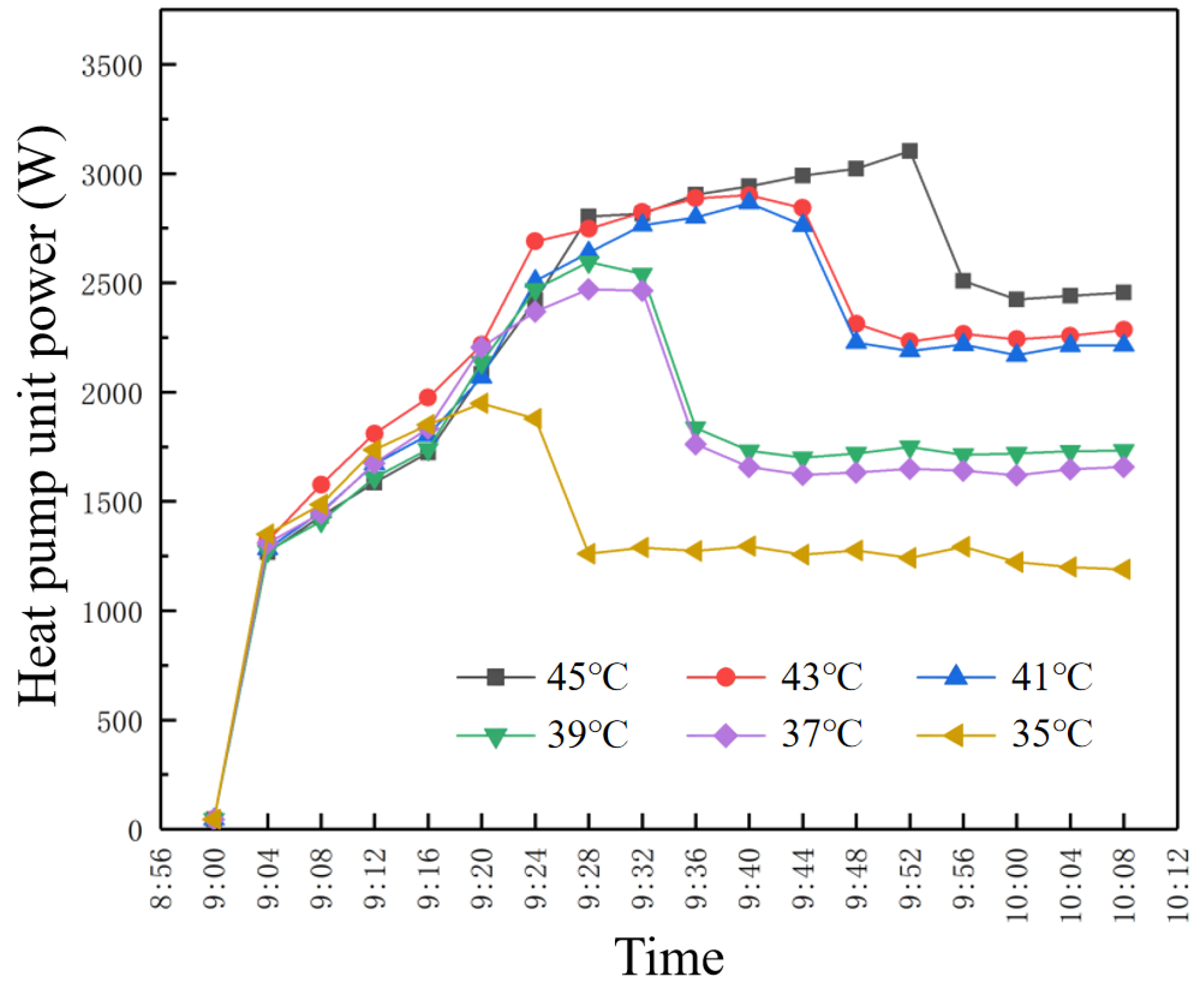 ASHP power input profiles during the start-up phase under various supply water temperatures.