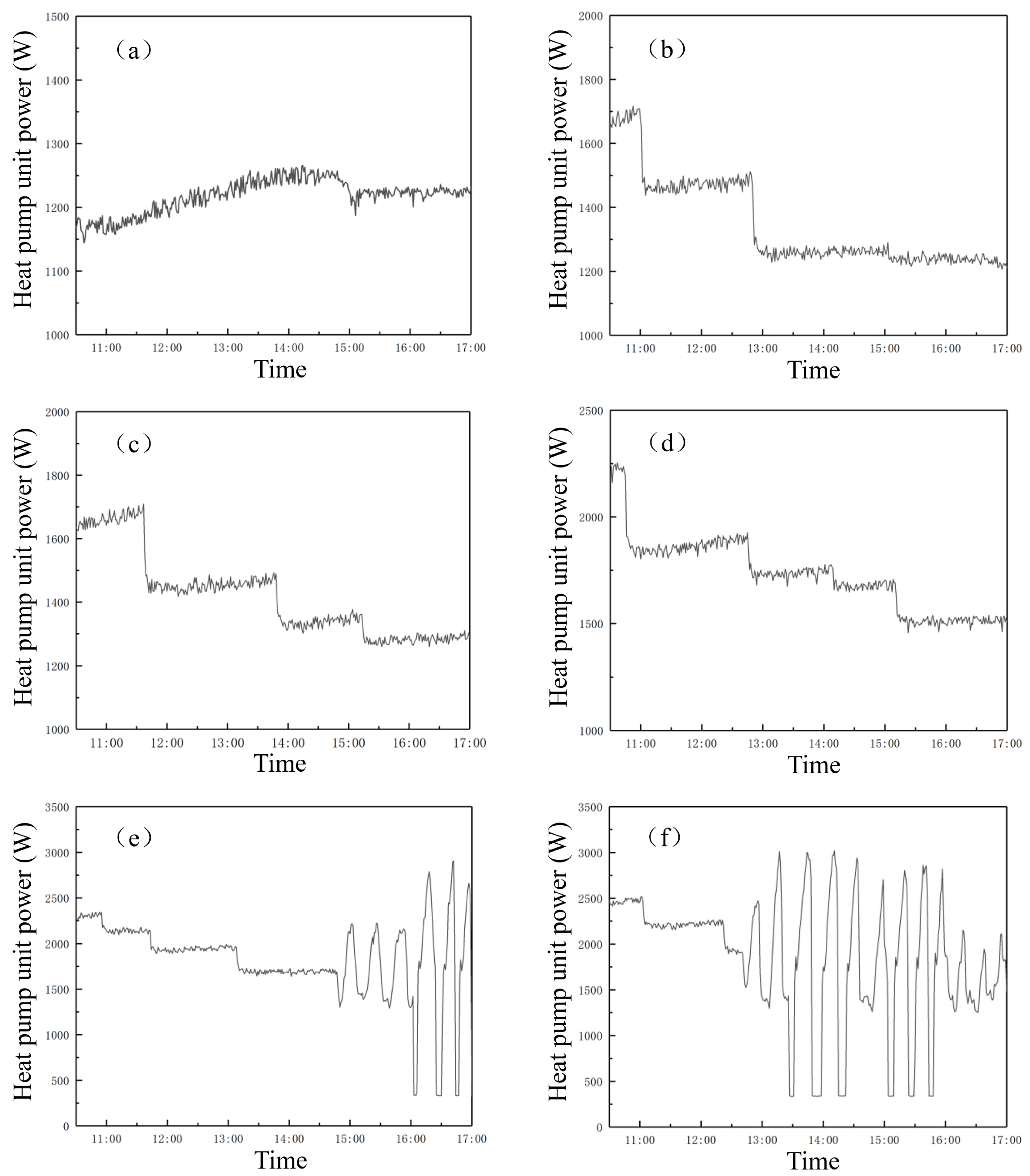 ASHP unit power input profiles after the initial stage under various supply water temperatures: (a) 35 °C; (b) 37 °C; (c) 39 °C; (d) 41 °C; (e) 43 °C; (f) 45 °C.