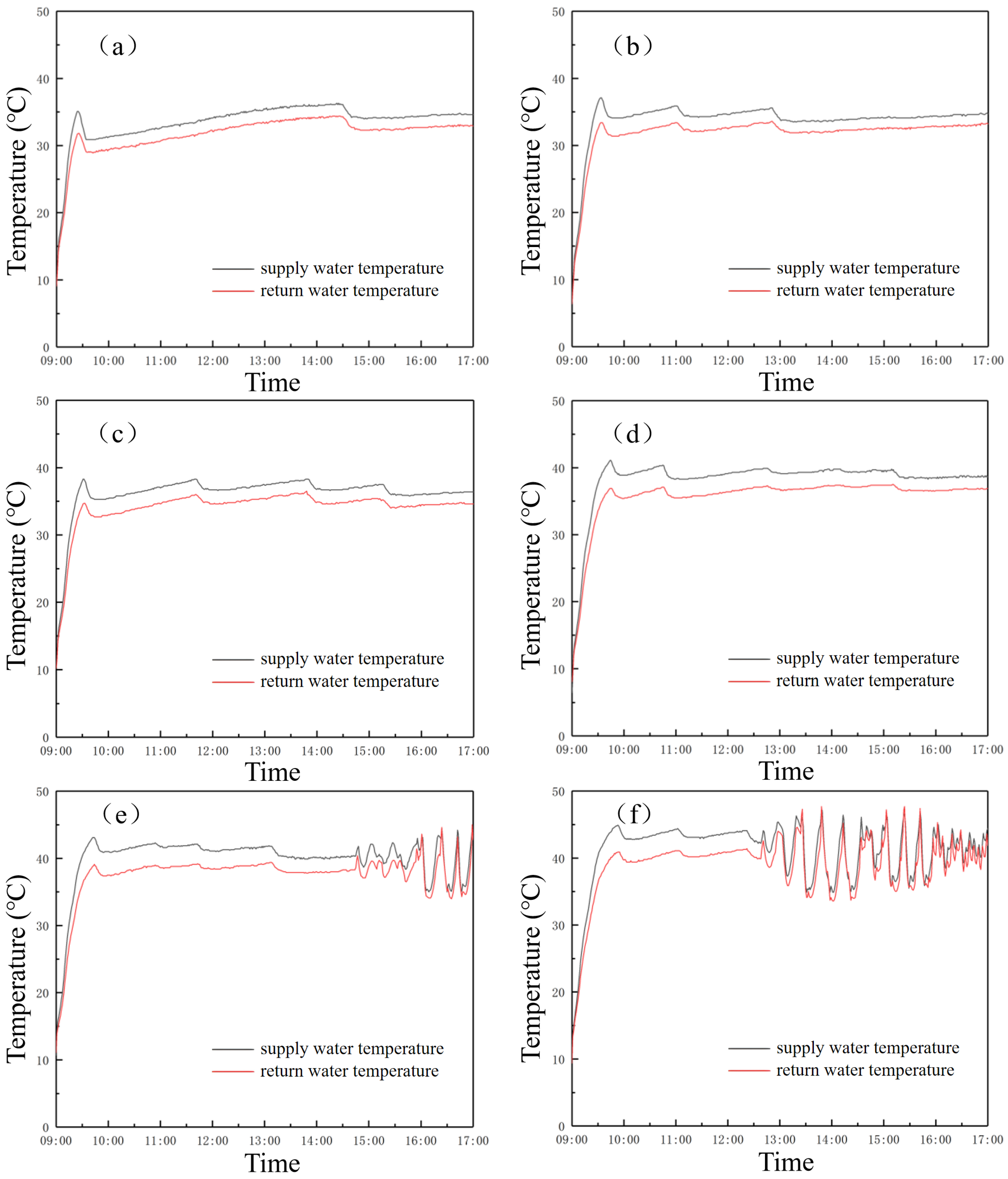 Supply and return water temperature profiles under various supply water temperature conditions: (a) 35 °C; (b) 37 °C; (c) 39 °C; (d) 41 °C; (e) 43 °C; (f) 45 °C.