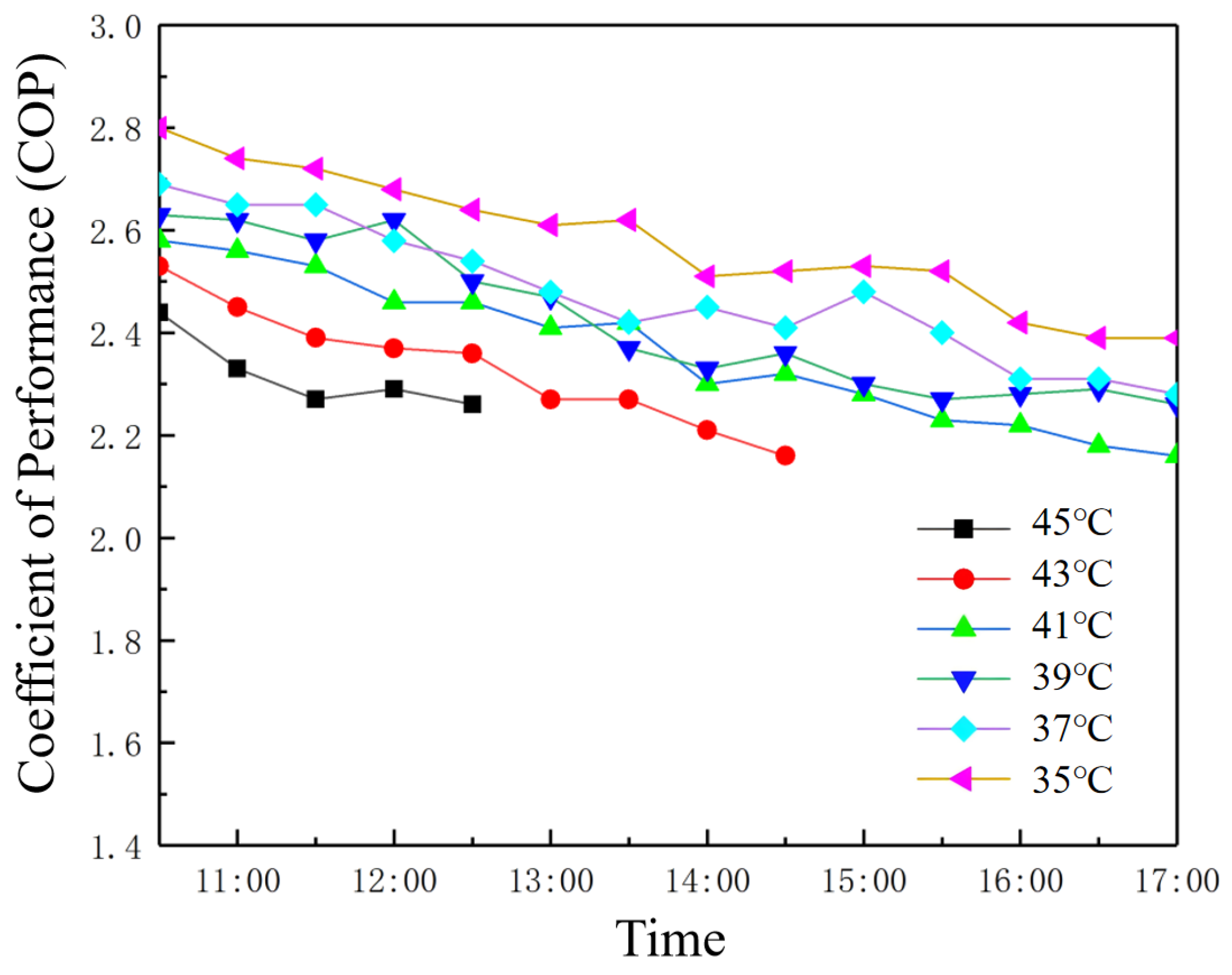 The ASHP unit COP during steady-state operation under different supply water temperature conditions.