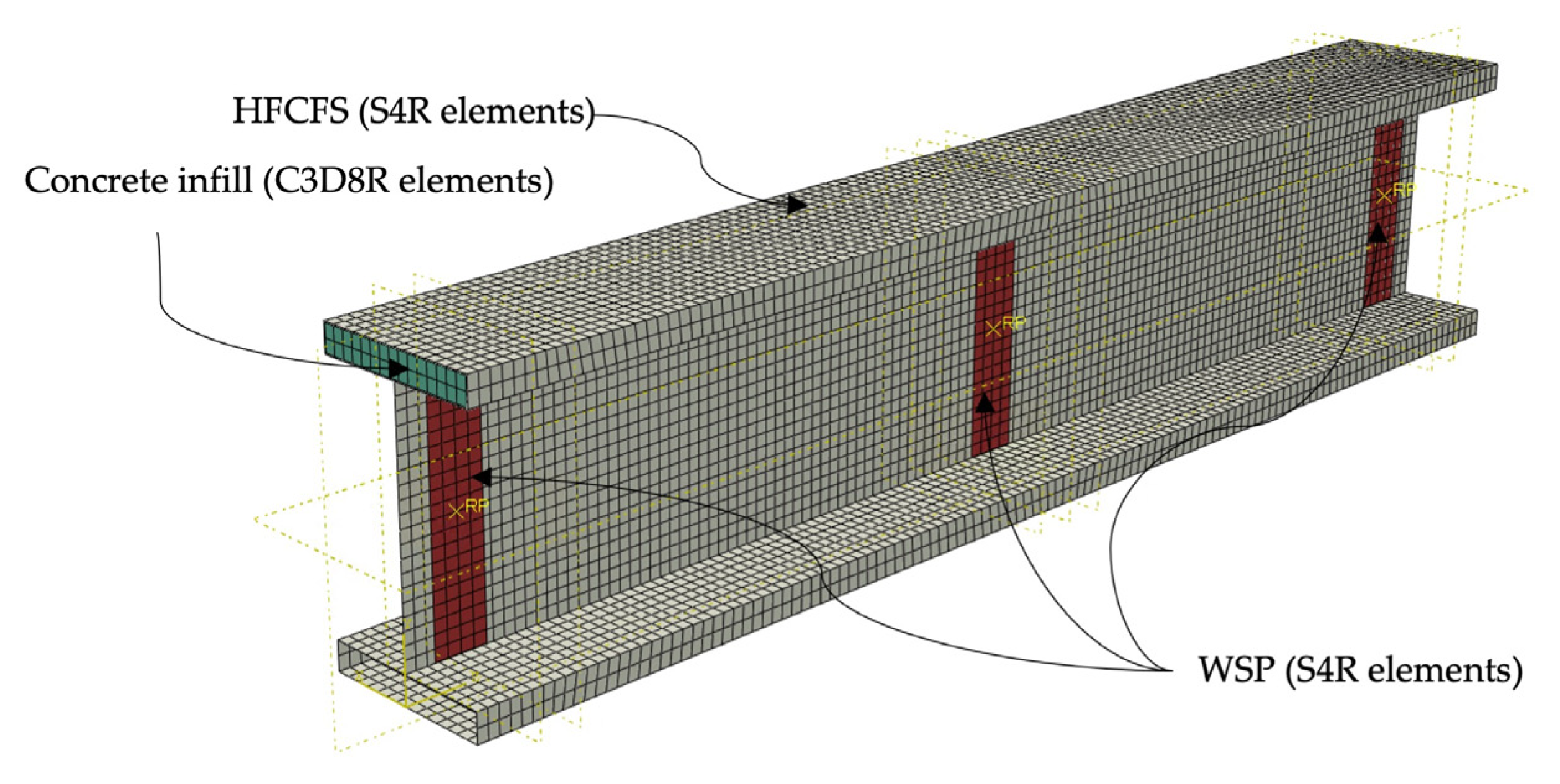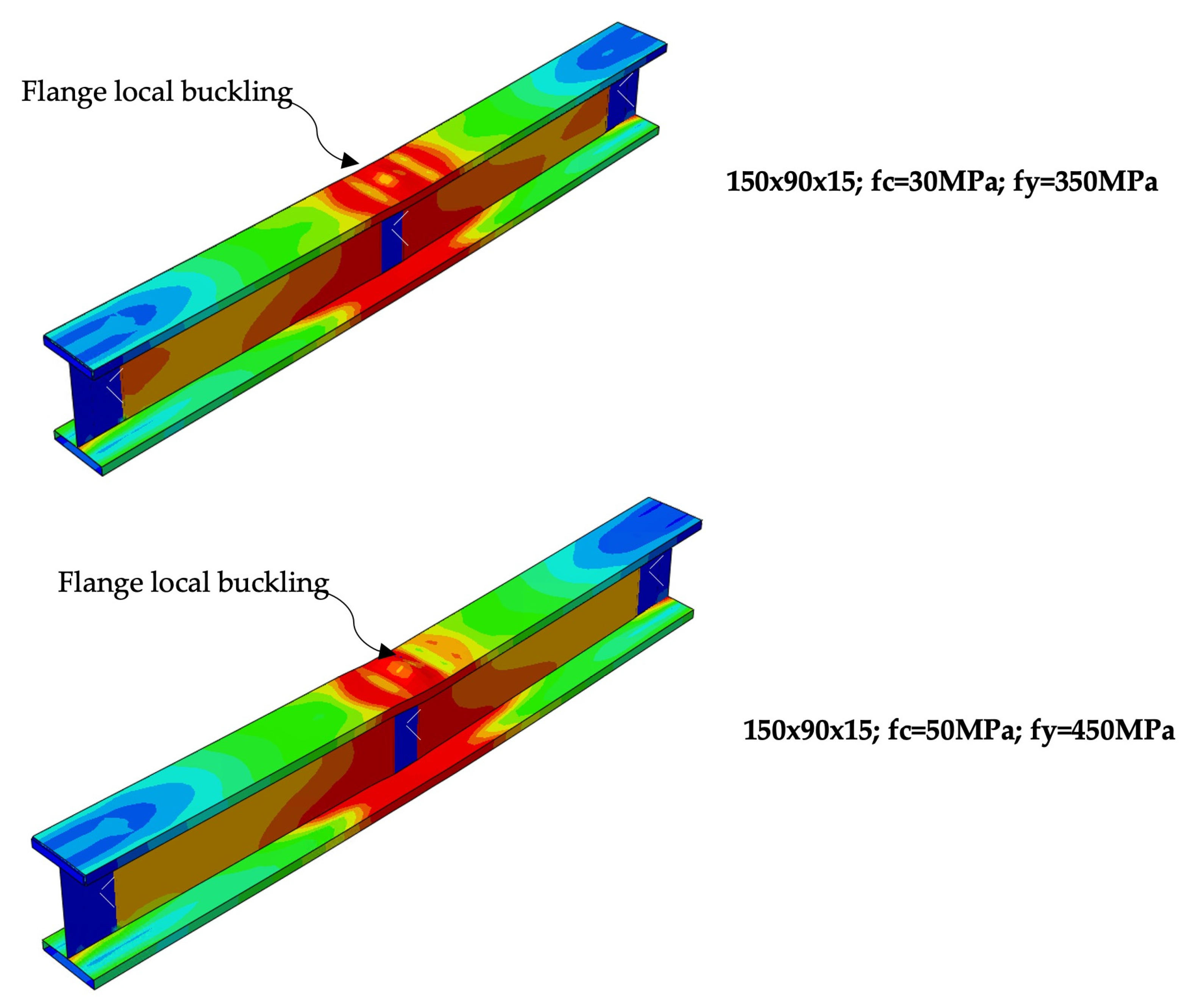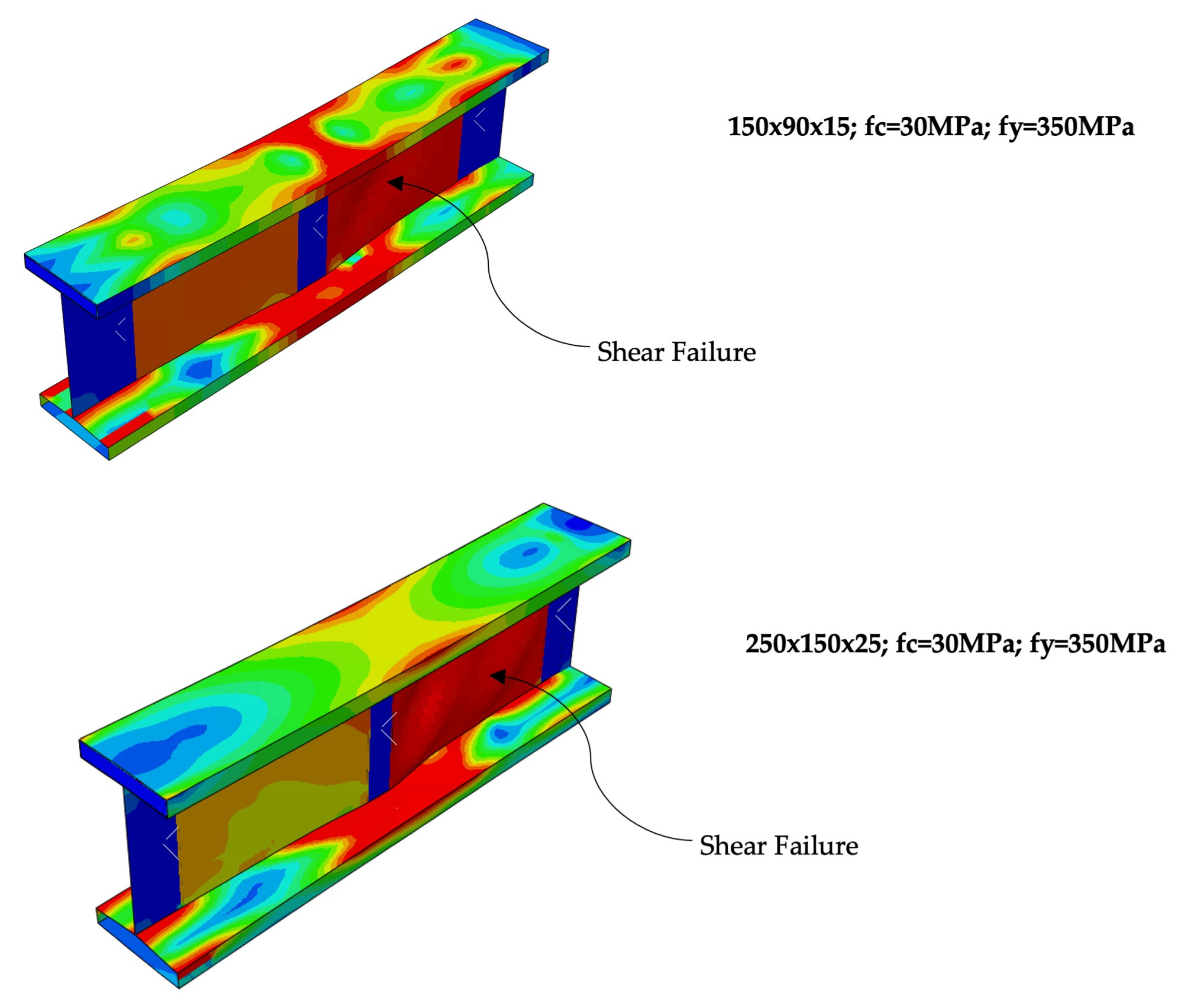 - A preliminary bending–shear interaction relationship was proposed based on the FE results, enabling a simplified assessment of the combined utilisation of shear and bending resistance. This interaction representation provides a useful basis for future development of unified design approaches for CF-HFCFS beams.