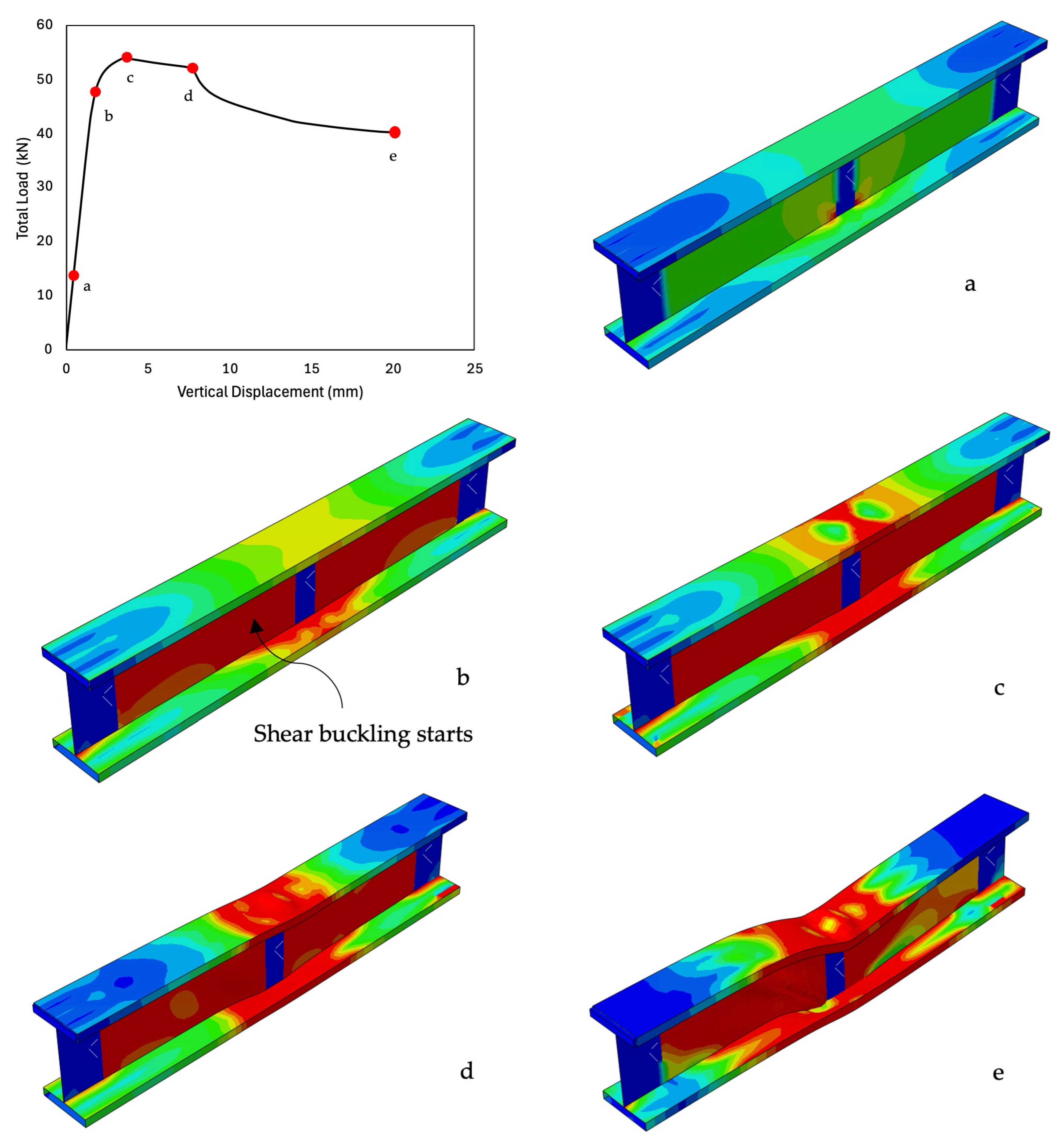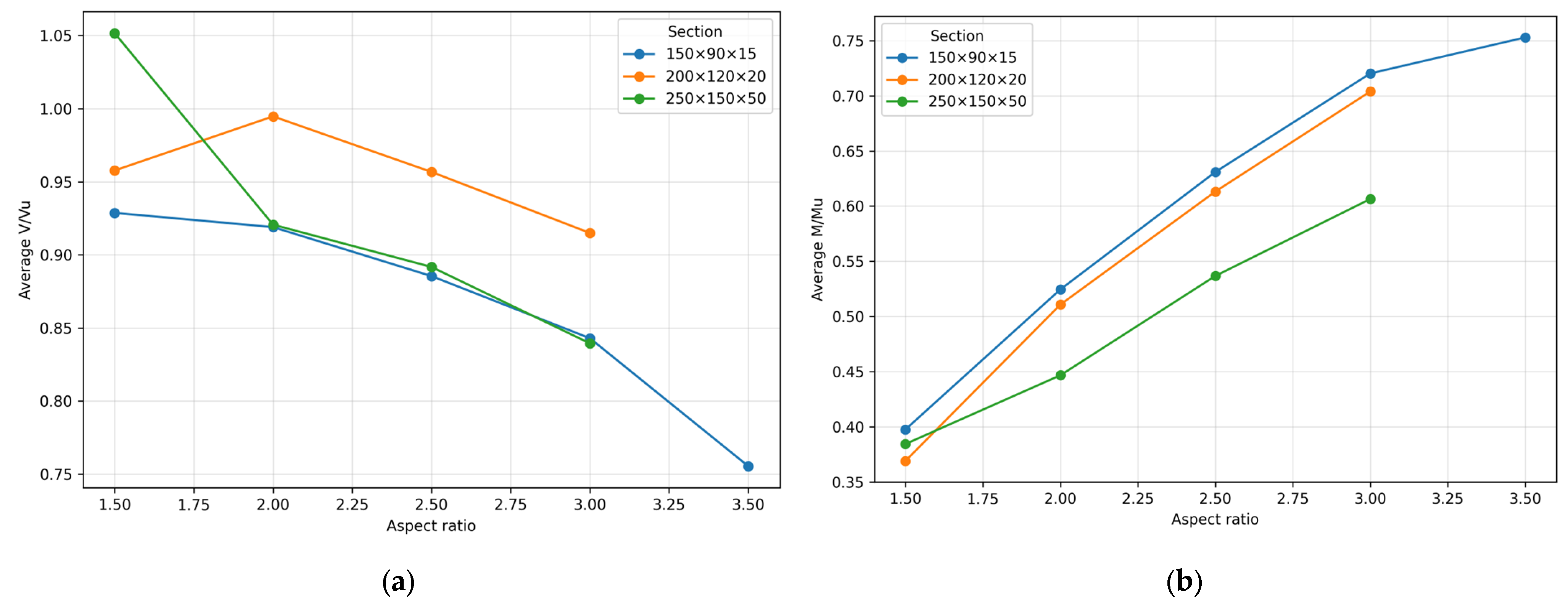 - With the aspect ratio of 2.5, V/Vu and M/Mu values converged (typically 0.80–0.99 vs. 0.46–0.65), indicating a coupled shear–flexure failure mechanism. Both web shear deformation and flange local buckling contributed significantly to the ultimate capacity.
