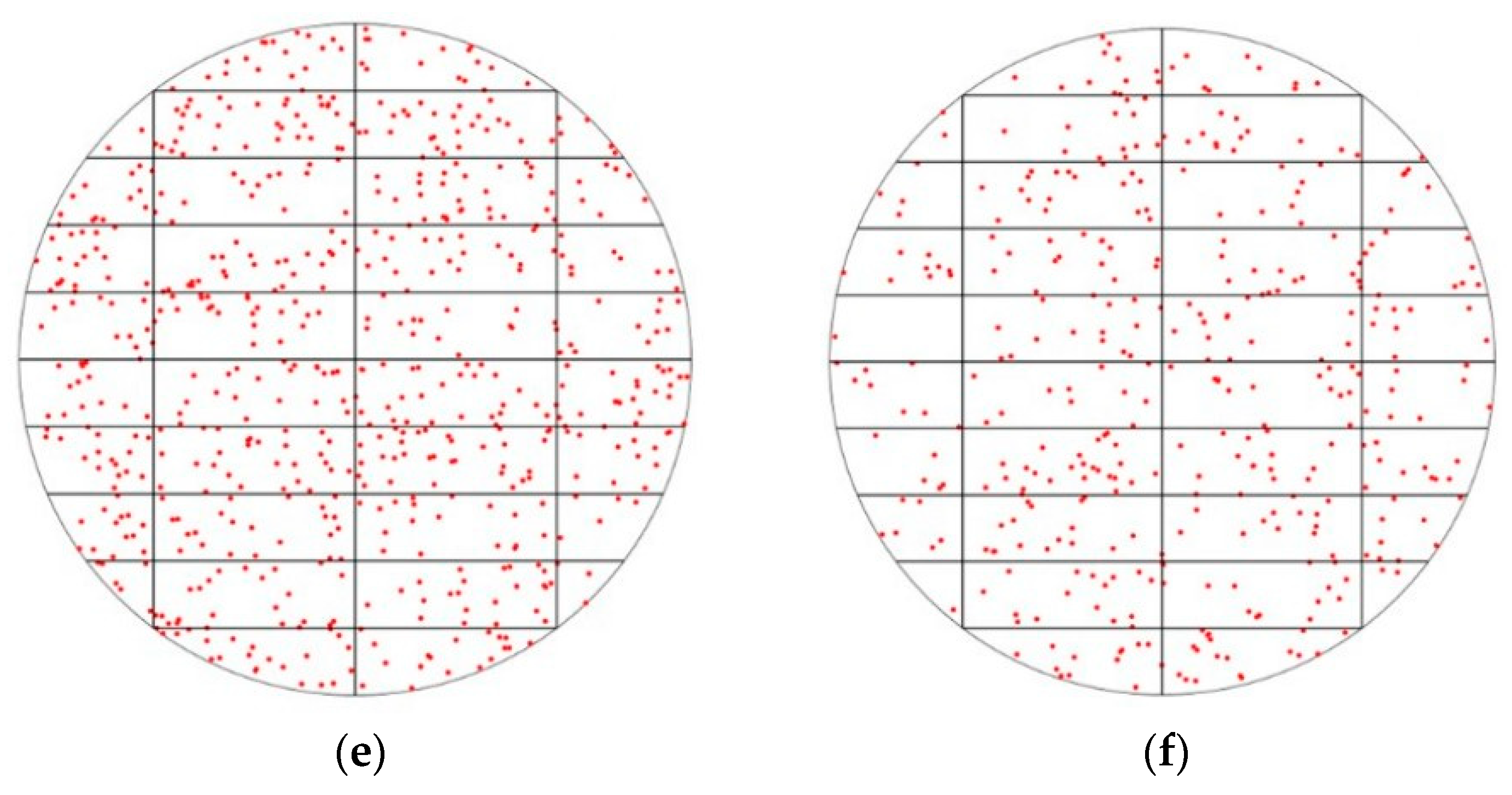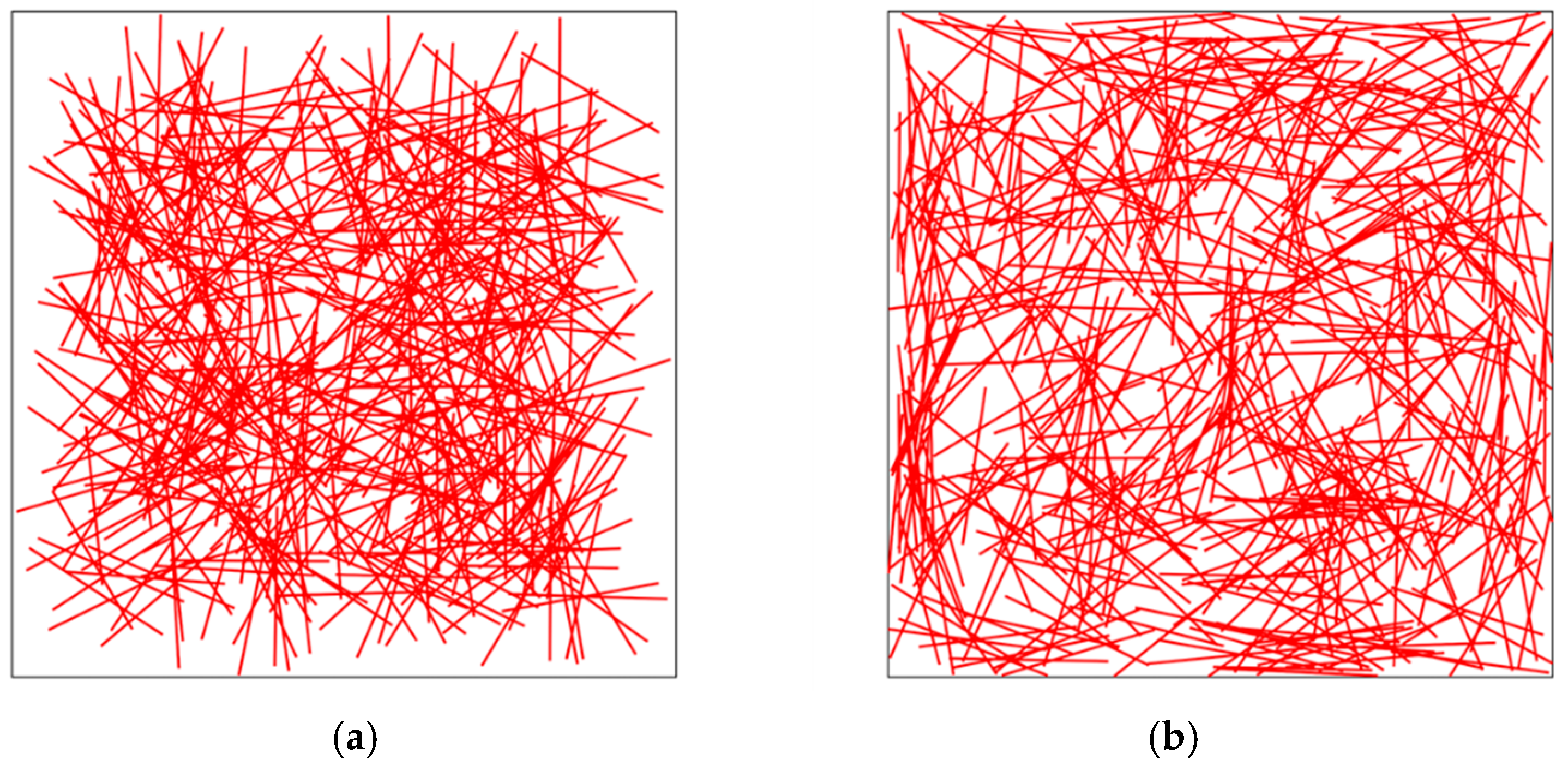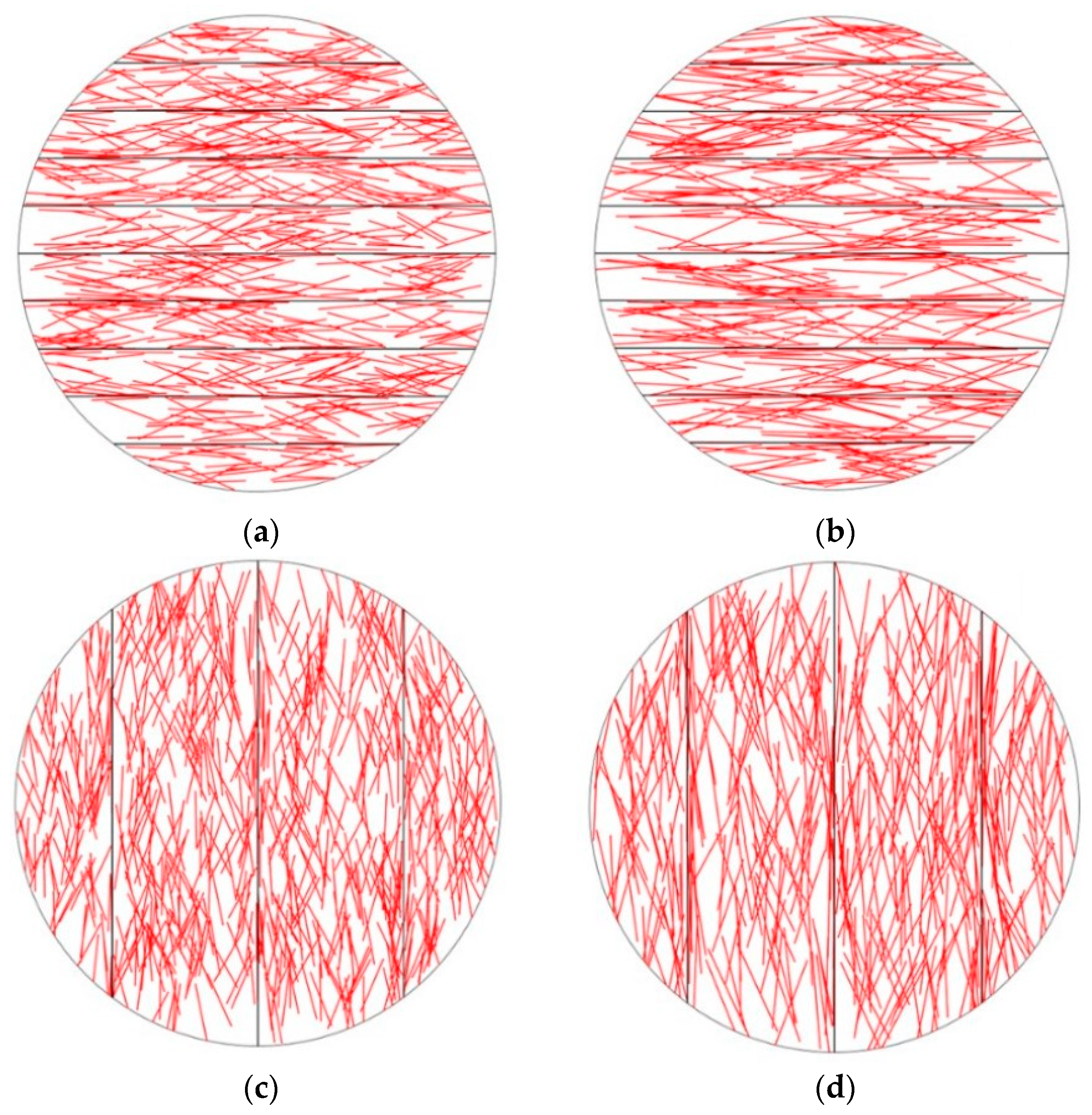 Figure 11a–f present the random distribution of fibers for the disk splitting test in different cases, P-XOZ-6, P-XOZ-10, P-XOY-6, P-XOY-10, P-YOZ-6, and P-YOZ-10, respectively.