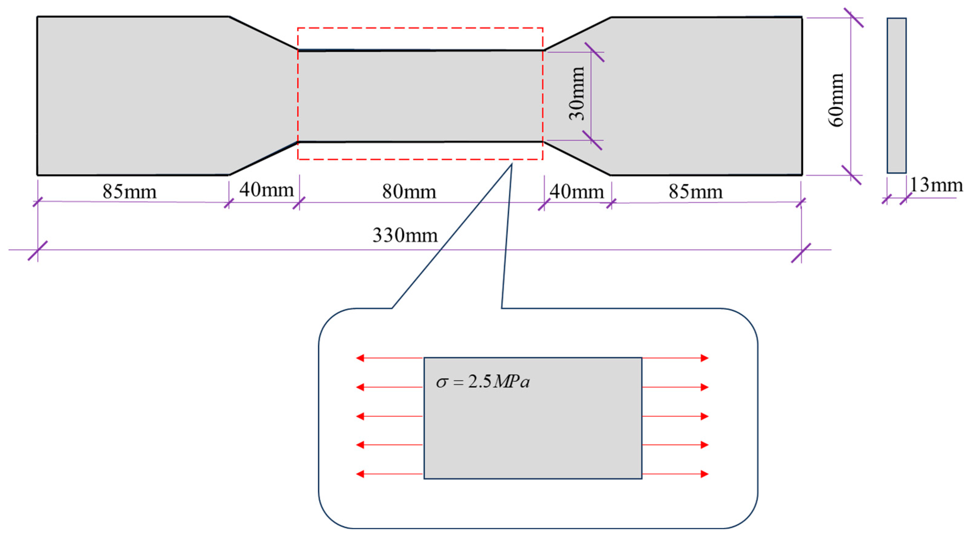51]. It is assumed to be a plane stress problem, with a load of 2.5 MPa applied at both ends of the specimen. The concrete matrix has an elastic modulus of 22.35 GPa, a Poisson’s ratio of 0.2, a density of 2380 kg/m