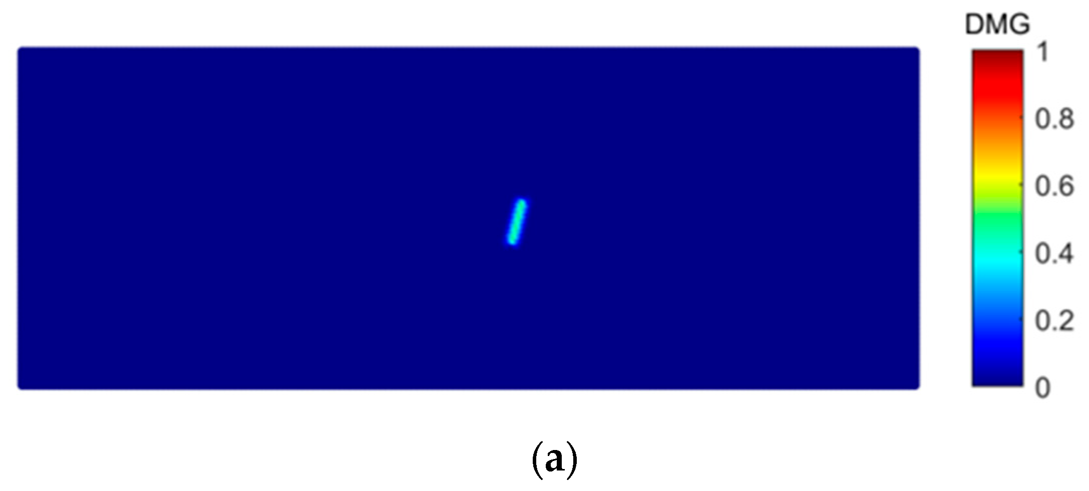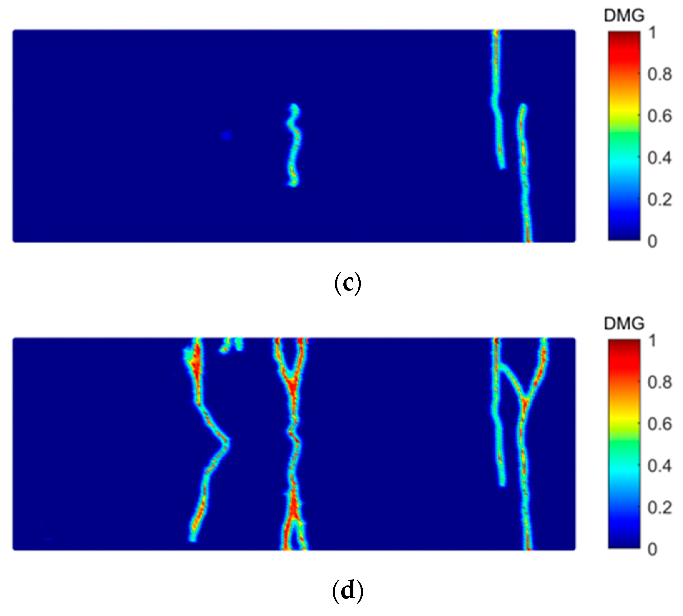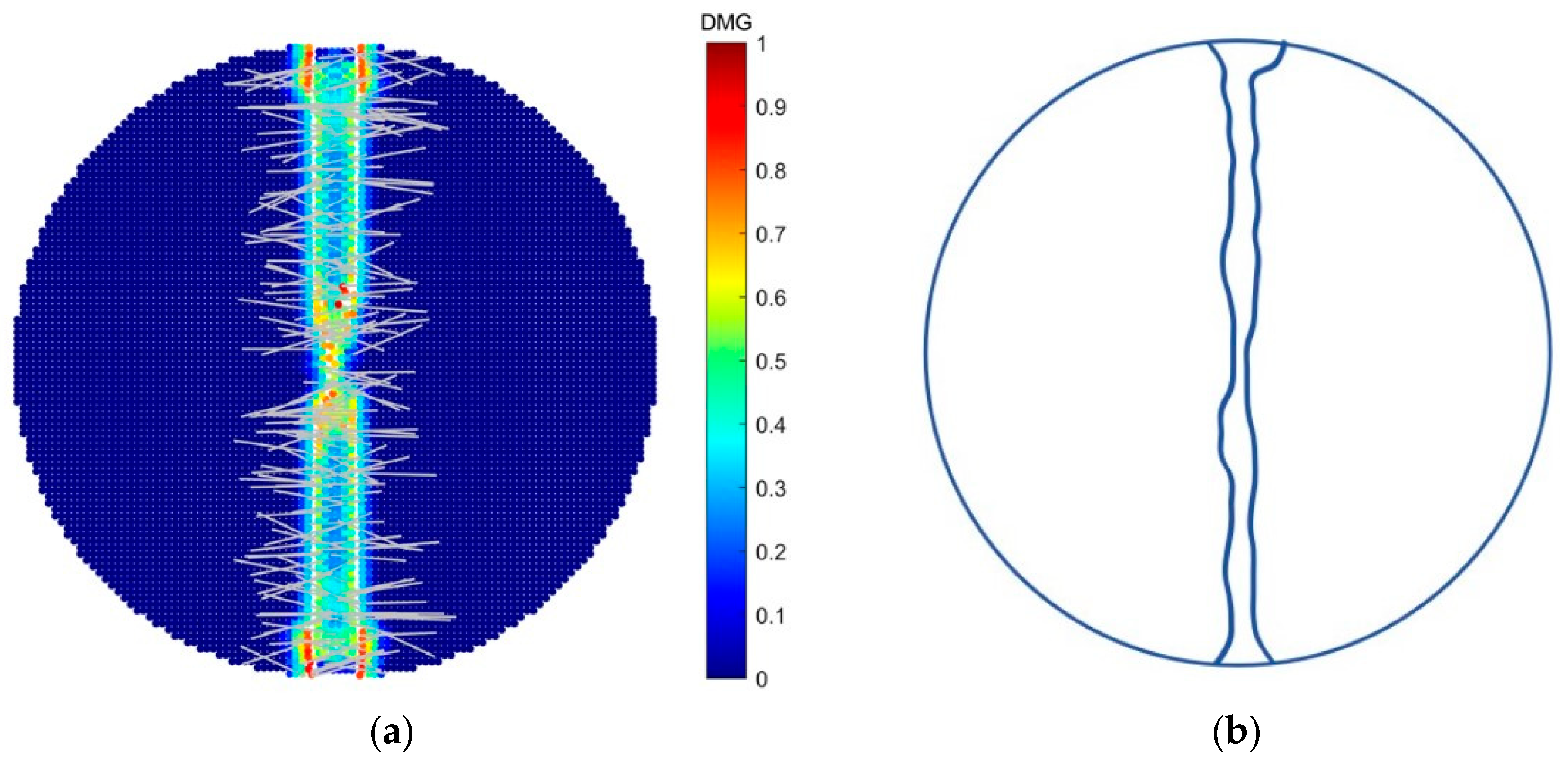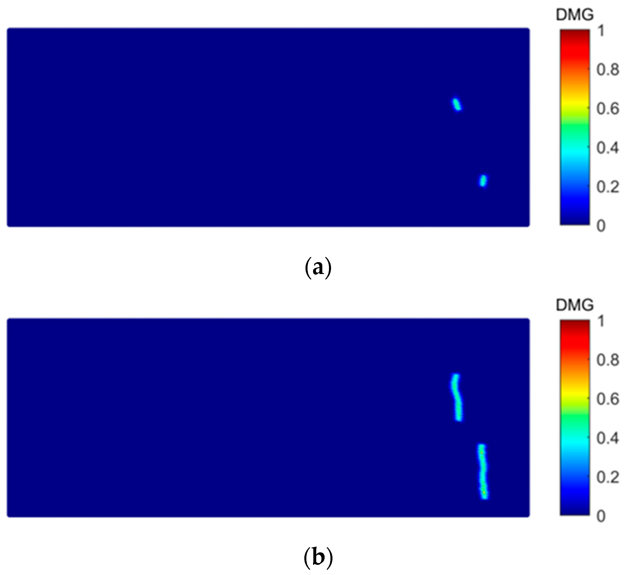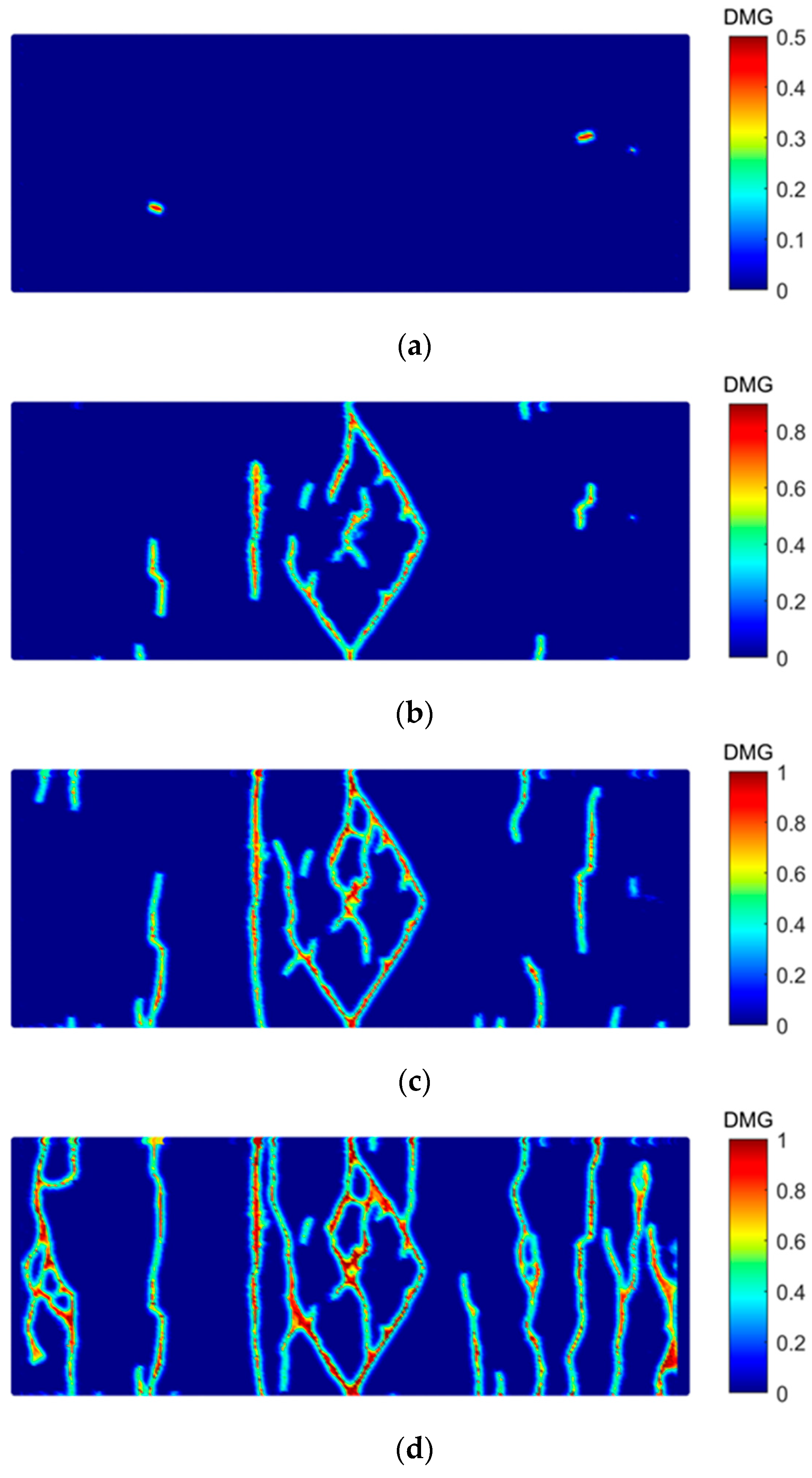 Figure 12. At the 2500th time step, stress concentration-induced damage initiates at both loading points, activating surrounding fibers to generate fiber-bridging forces. At the 4000th time step, cumulative damage forms distinct propagation paths extending from the loading points toward the center, with sequential fiber activation along these paths. At the 6000th time step, increased damage values at both loading points cause the propagation paths to approach convergence. At the 7500th time step, the intersecting damage paths form a central crack propagation that is maintained due to fiber reinforcement. The final damage distribution at the 8000th time step, compared with experimental results, is presented in