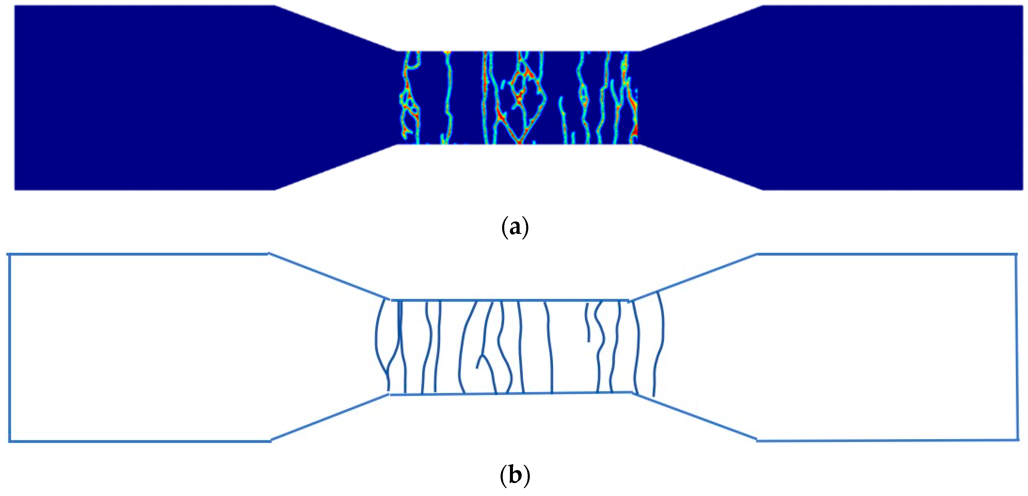 Figure 6a–d. It is indicated that crack propagation remains within a controlled range, with no evidence of rapid unstable crack growth. Initial defects serve as preferential sites for crack initiation, though not exclusively. The final crack count ranges between 4 and 5, in good agreement with the experimental result, as shown in