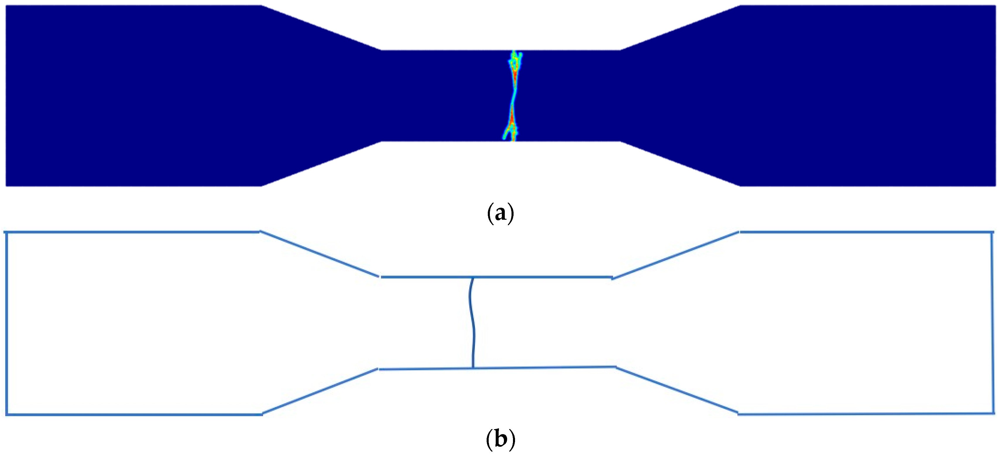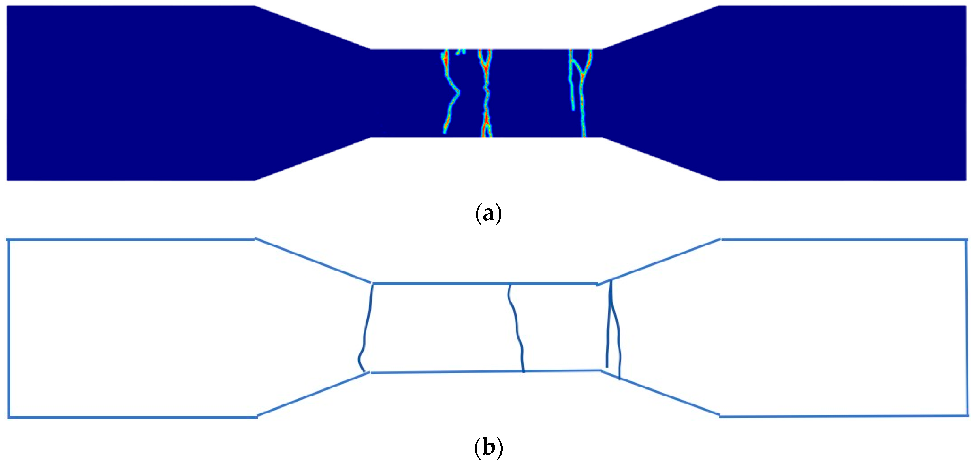 Figure 8a–d, the crack initiates from the initial defect and propagates toward the specimen edge, where fine branching begins to emerge. Overall, the simulation results closely match the experimental observations, as shown in