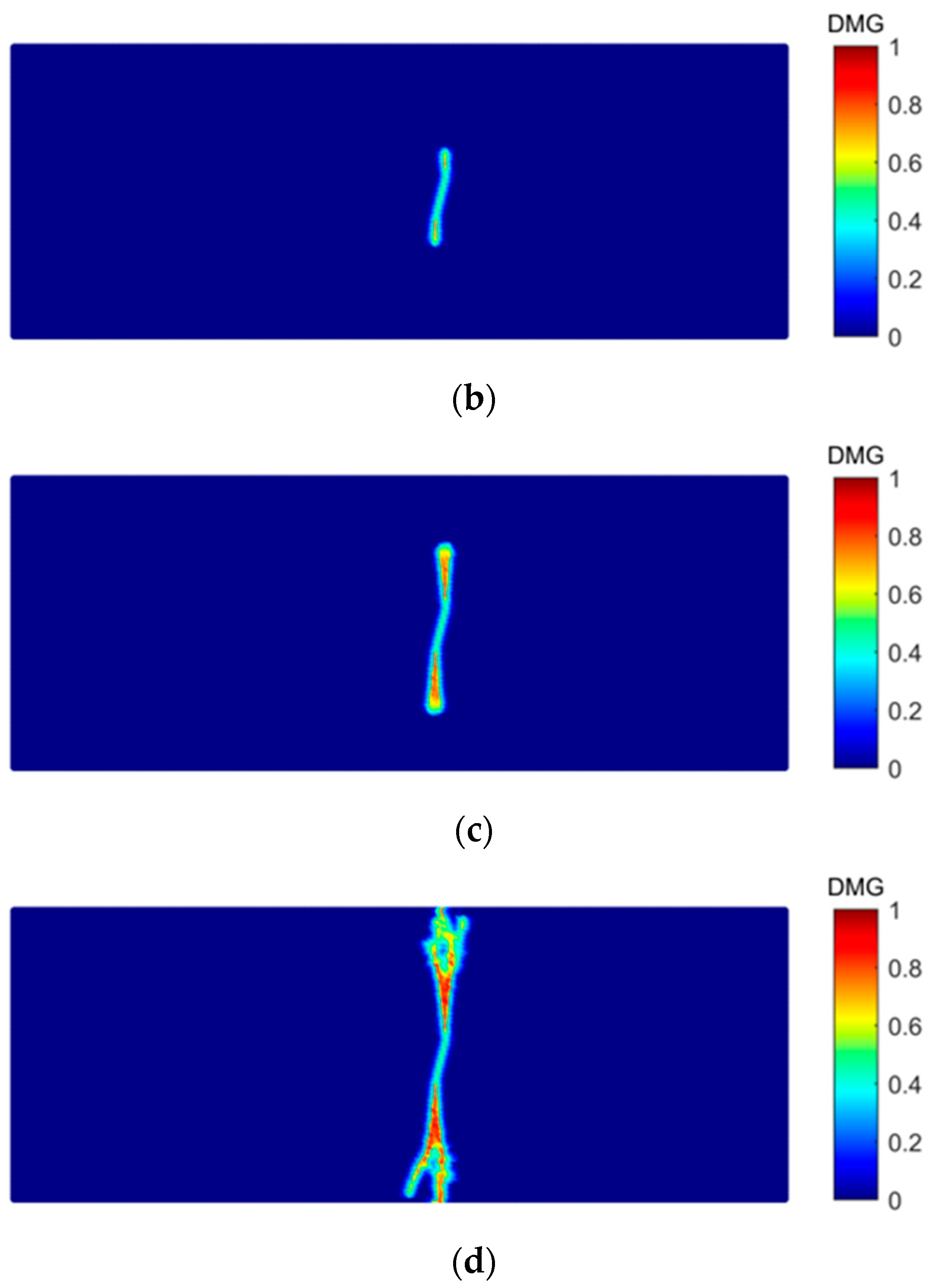 th time steps, respectively. It is observed that initial defects serve as nucleation points for crack initiation to some extent, though cracks do not exclusively propagate from these defects. The cracks emerging at both ends of the test region undergo transient development before bifurcating, ultimately forming a diamond-shaped crack pattern at the center. Subsequently, these central cracks merge with the end cracks through coalescence, creating a dominant central crack zone. Notably, even after crack formation, the specimen maintains load-bearing capacity due to fiber bridging effects. This is followed by the emergence of multiple vertical crack propagation, effectively demonstrating the multiple cracking characteristic of Engineered Cementitious Composites (ECC).