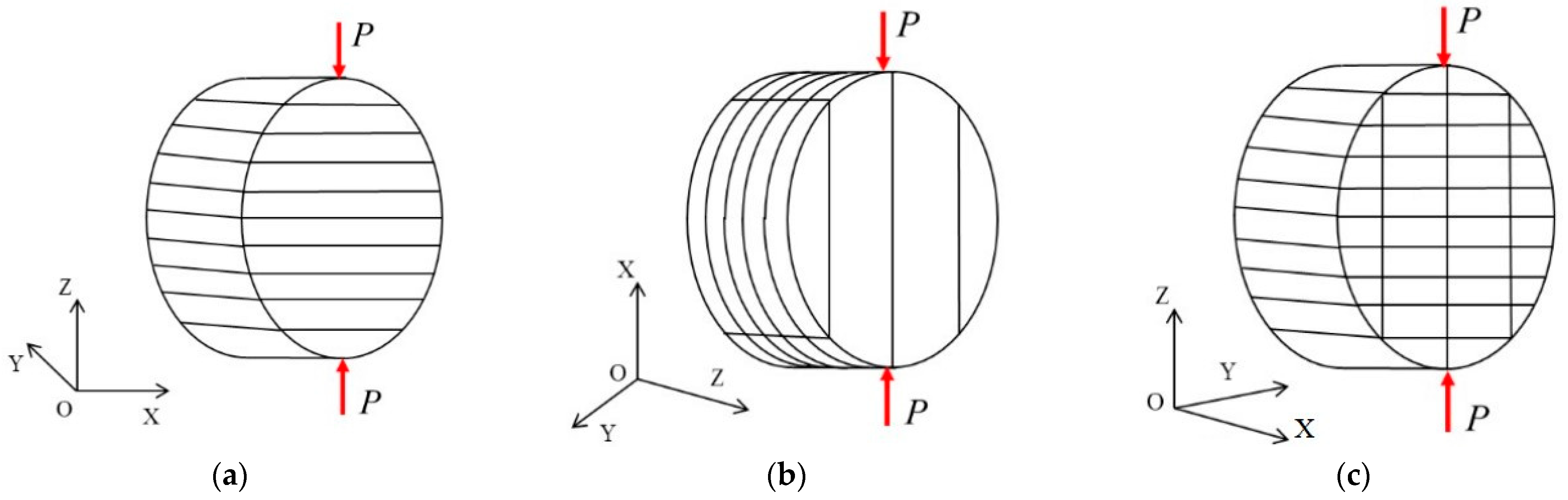 Figure 10a–c present the 3D-printed fiber-reinforced specimens of the disk splitting test. The elastic modulus of the concrete matrix is set to be 46.65 GPa, Poisson ratio 0.2, compression strength 131.49 MPa, tensile strength 10.11 MPa, fracture energy 318 N/m, and time increment 2 × 10