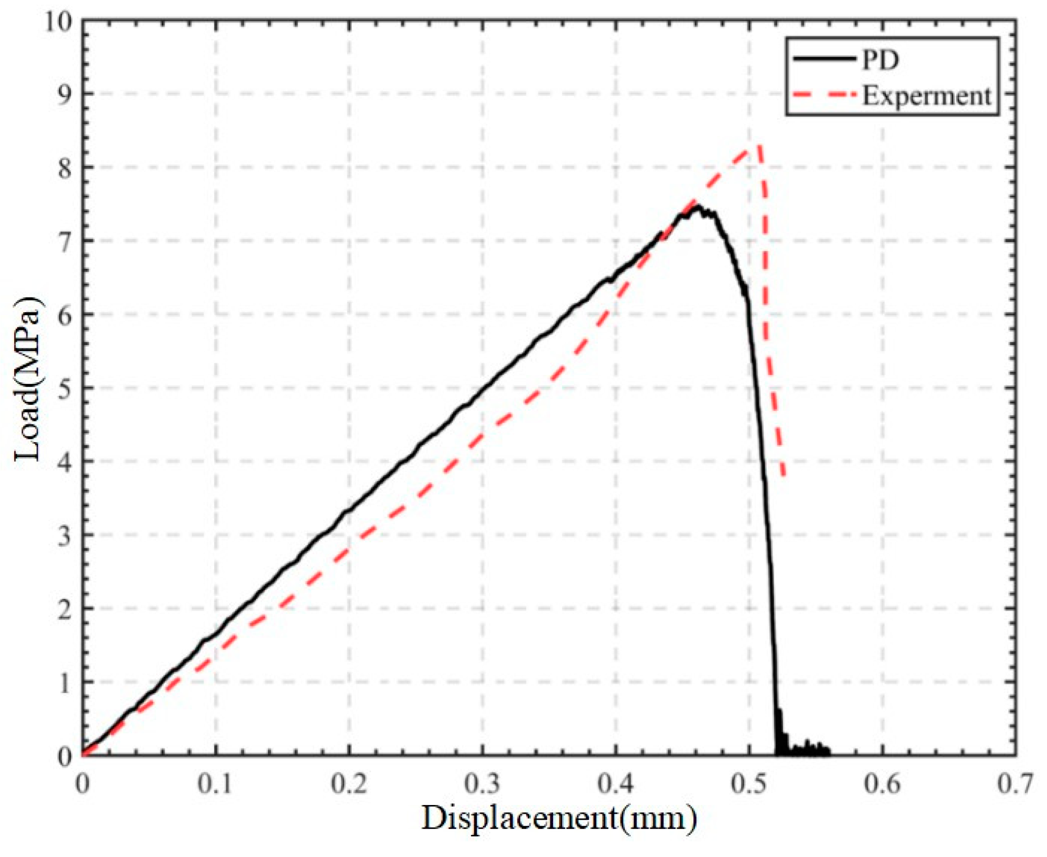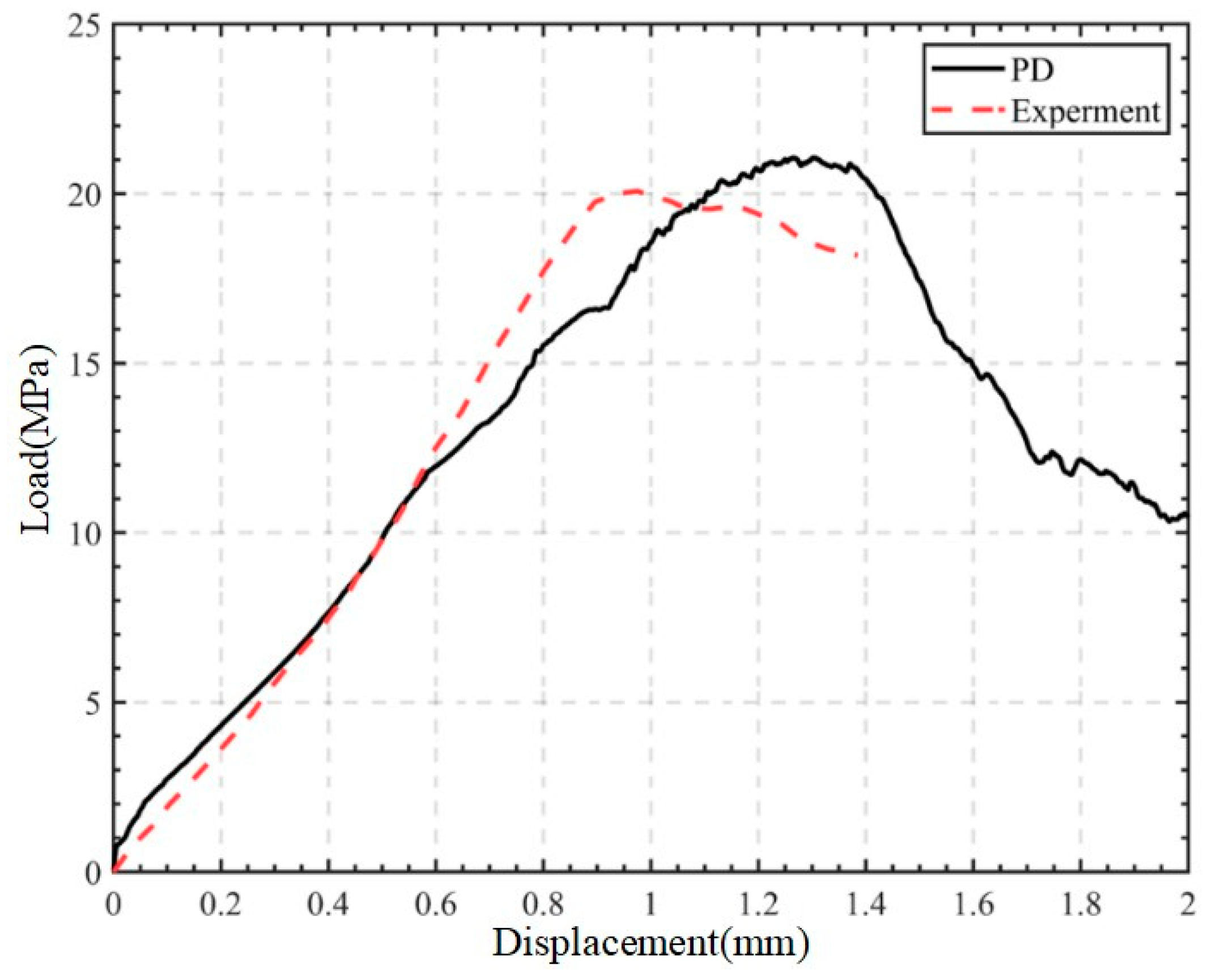 Figure 24 presents the load–displacement curves obtained from four specimens under experimental testing and peridynamic (PD) simulation. In the experimental curves, the load initially increases gradually with displacement during the early loading stage. Upon reaching the first peak load, a slight decline occurs due to crack initiation in the specimens. However, the presence of fibers prevents complete failure, resulting in a subsequent minor load increase before stabilization within a plateau region where displacement continues to grow while load remains relatively constant.