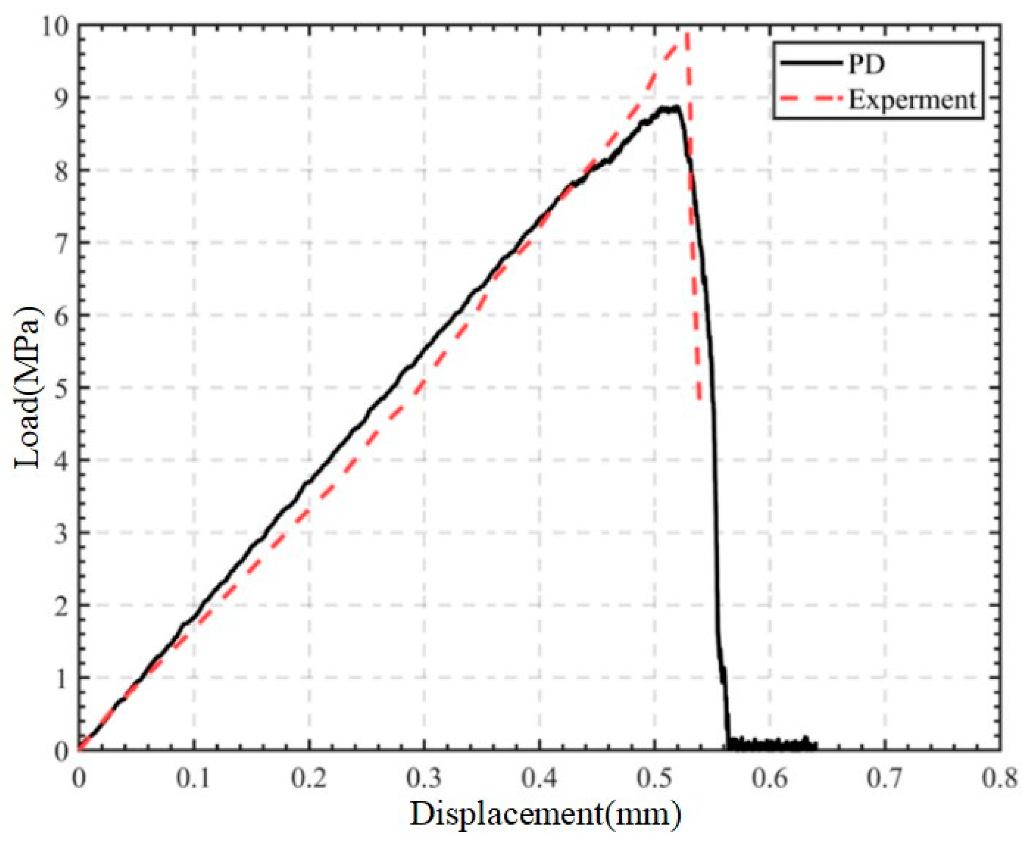 Figure 16 presents the load–displacement curve of specimen P-XOY-6. During the initial loading stage, a distinct linear relationship between displacement and load is observed, with load increasing proportionally with displacement. However, upon reaching peak load, rapid crack propagation occurs, leading to a sudden loss of bearing capacity. This behavior suggests that under loading parallel to the printing direction, the steel fibers are predominantly aligned with the applied load, causing cracks to propagate along the fiber orientation. Consequently, the crack-bridging effect of the fibers is minimal, resulting in negligible enhancement of ductility for the 3D-printed concrete matrix. The simulated peak load value was approximately 7.42 MPa.