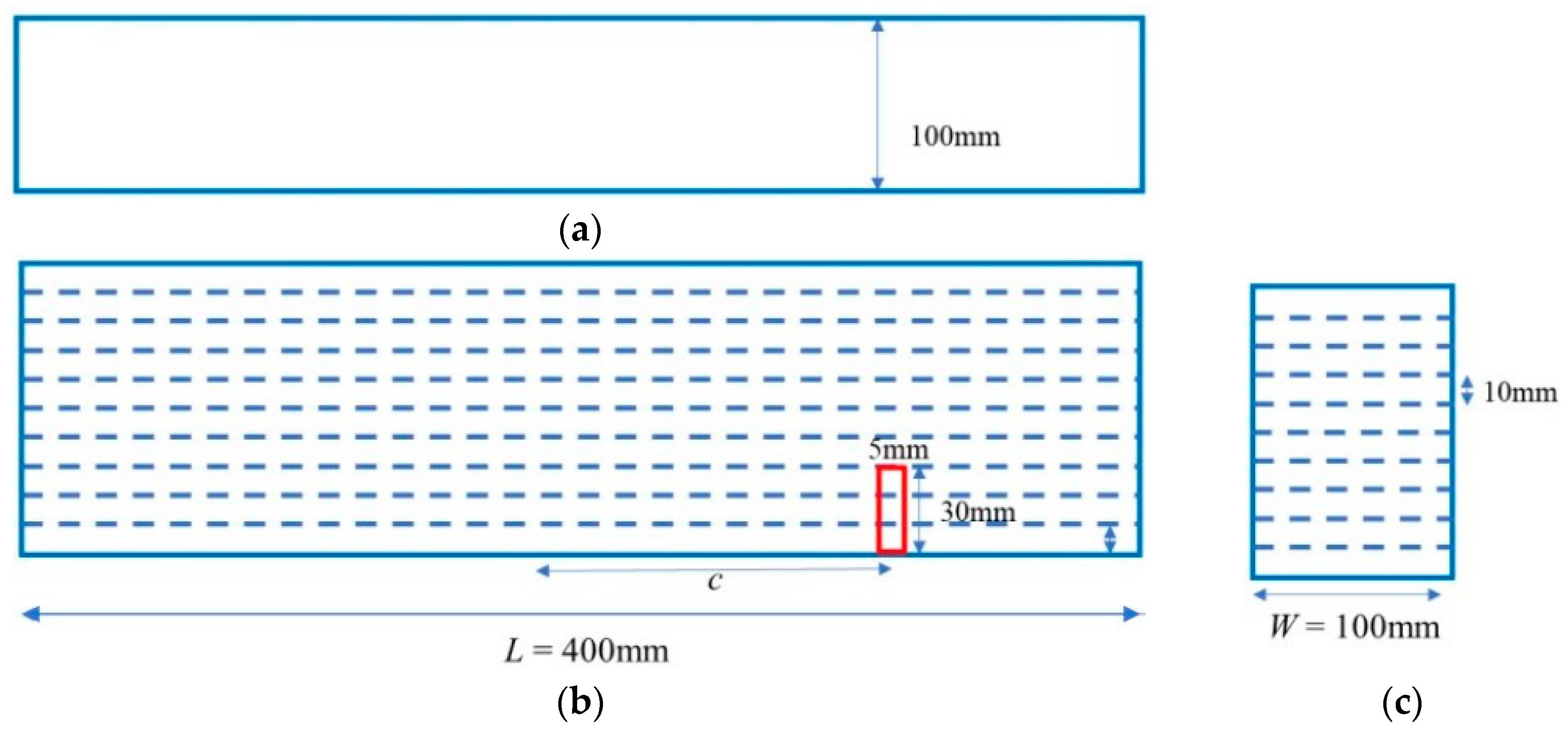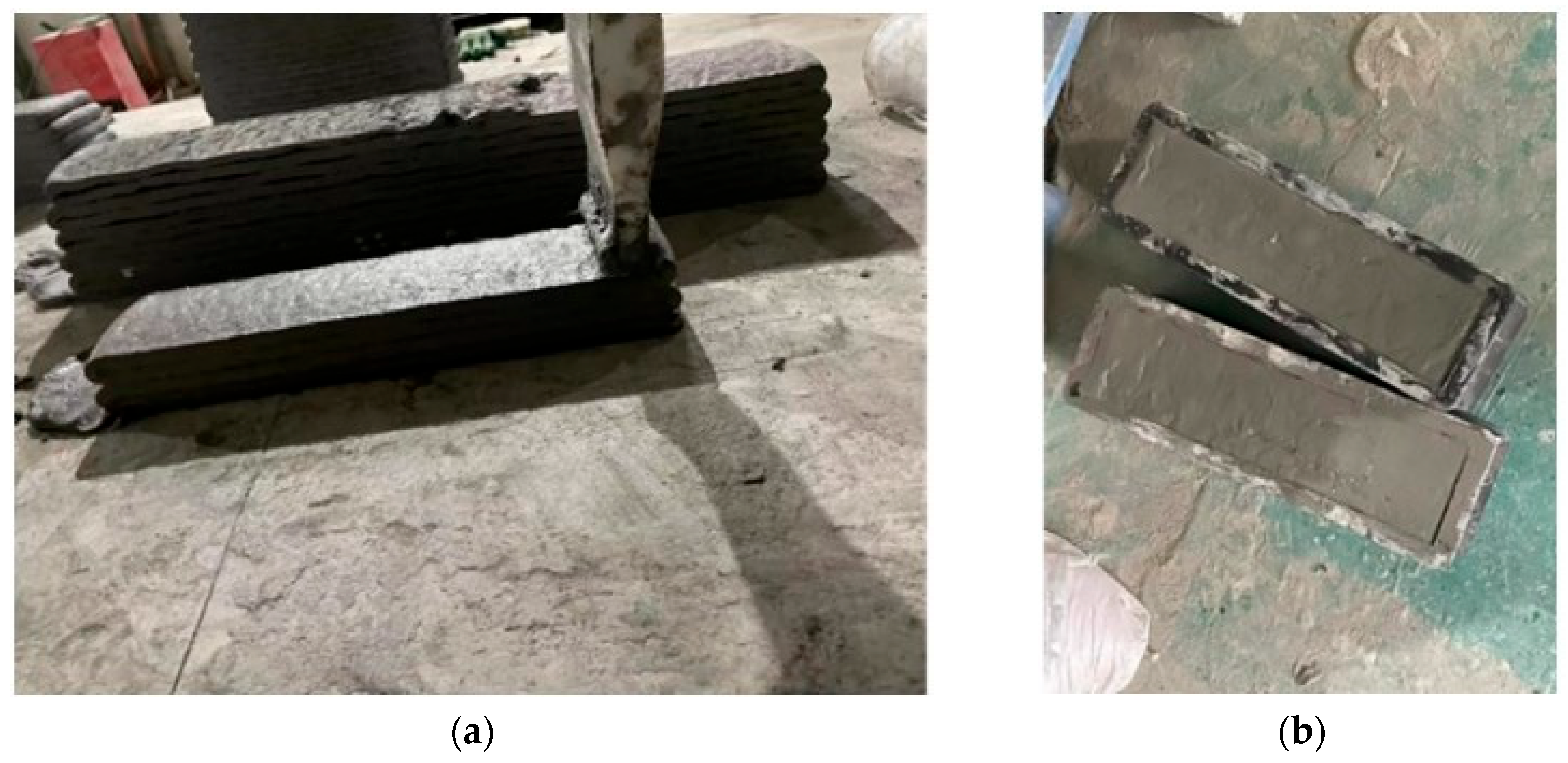 Figure 19. Two different c values were selected: 0 and L/4. For specimen identification purposes, we assigned numbering as follows: cast specimens with c = 0 are labeled Cast0, while those with c = L/4 are labeled Cast1; similarly, printed specimens with c = 0 are designated Print0, and those with c = L/4 are designated Print1. A wide rectangular 3D printing nozzle was used to extrude material at a constant speed, producing single-layer print strips with a width of 100 mm and a height of 10 mm. Ten alternating passes were made to complete each printed specimen, resulting in two fully fabricated 3D-printed test pieces. Additionally, two cast specimens of identical dimensions were prepared using molds as control samples. The printing process in progress is shown in