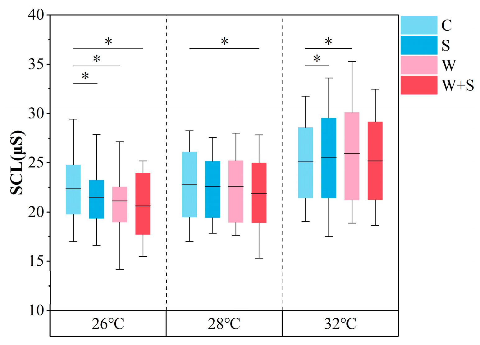 | 26 °C/28 °C/32 °C | C | control group without window view or sound |