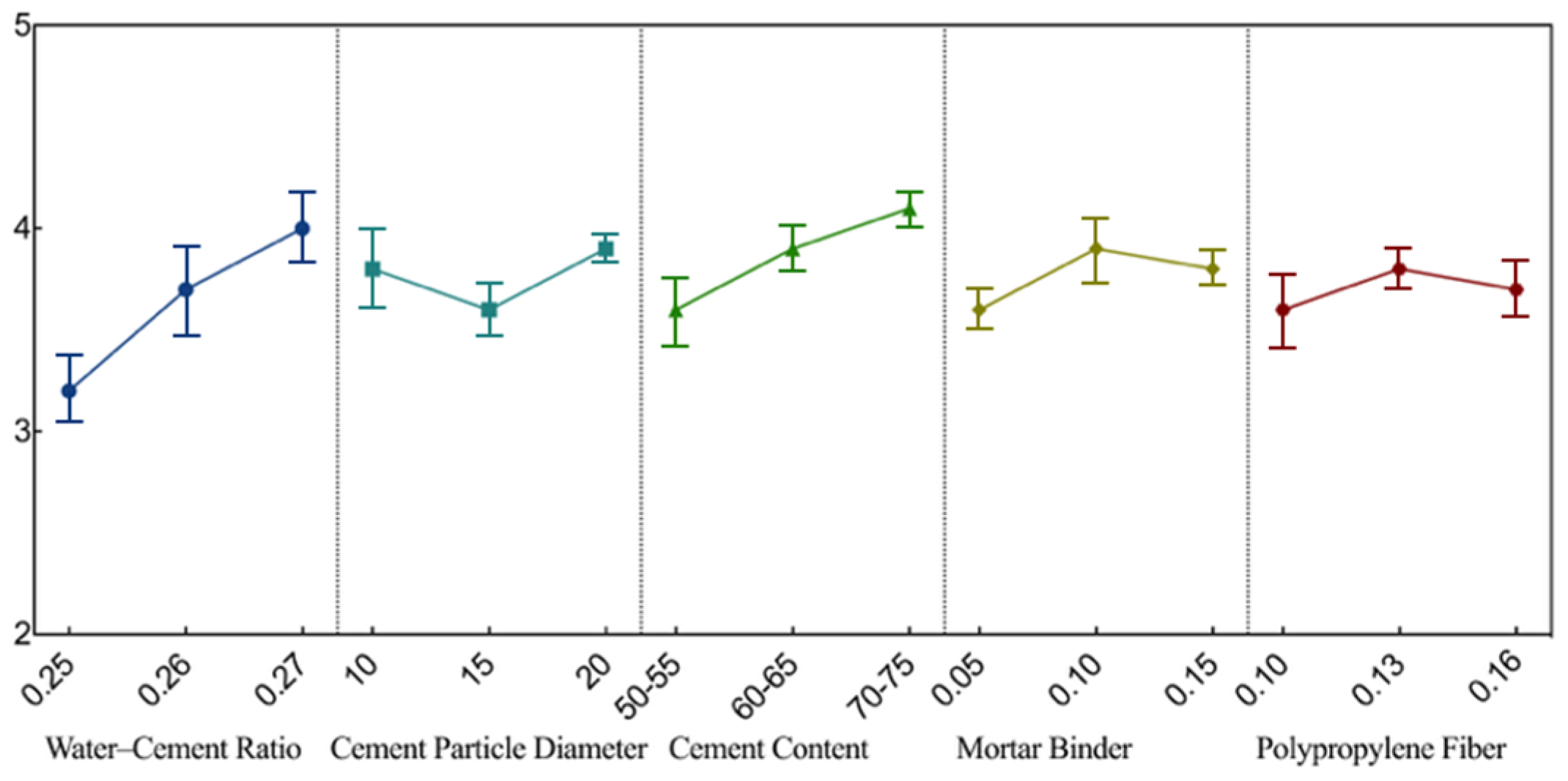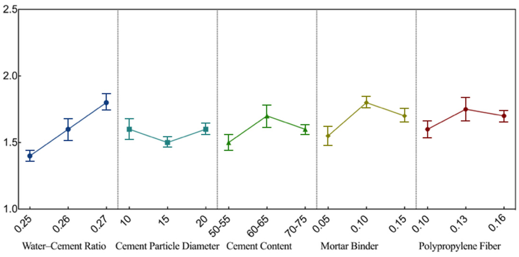Table 9), the water–cement ratio (w/c) is the dominant factor (R = 1.25). In line with recent reviews on porous ecological substrates, a moderate increase in (w/c) from 0.25 to 0.27 facilitates the formation of a robust ITZ between cement granules. This mechanism is visually supported by the strength trends in