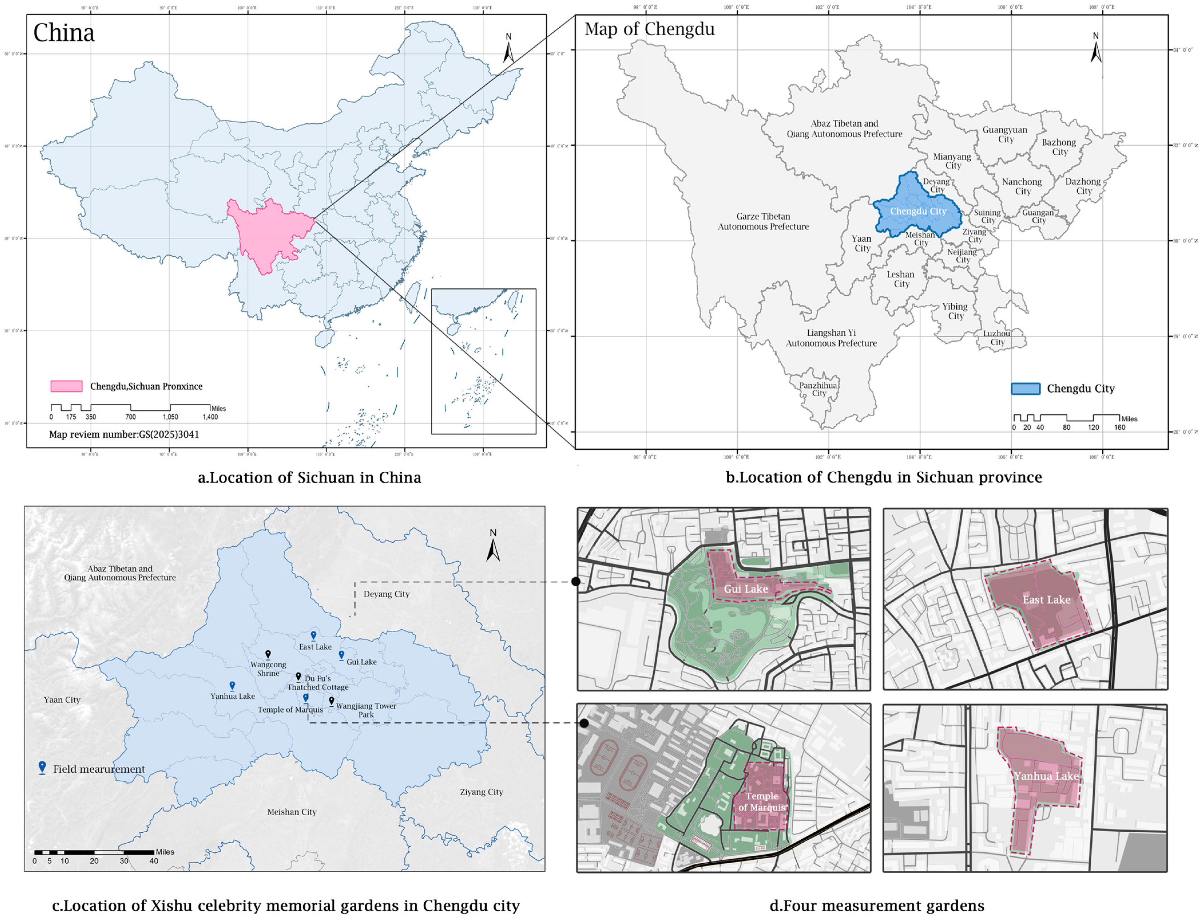 - Pei, Y.; Qi, C. Gardens of Western Sichuan; China Forestry Publishing House: Beijing, China, 2010. [Google Scholar]