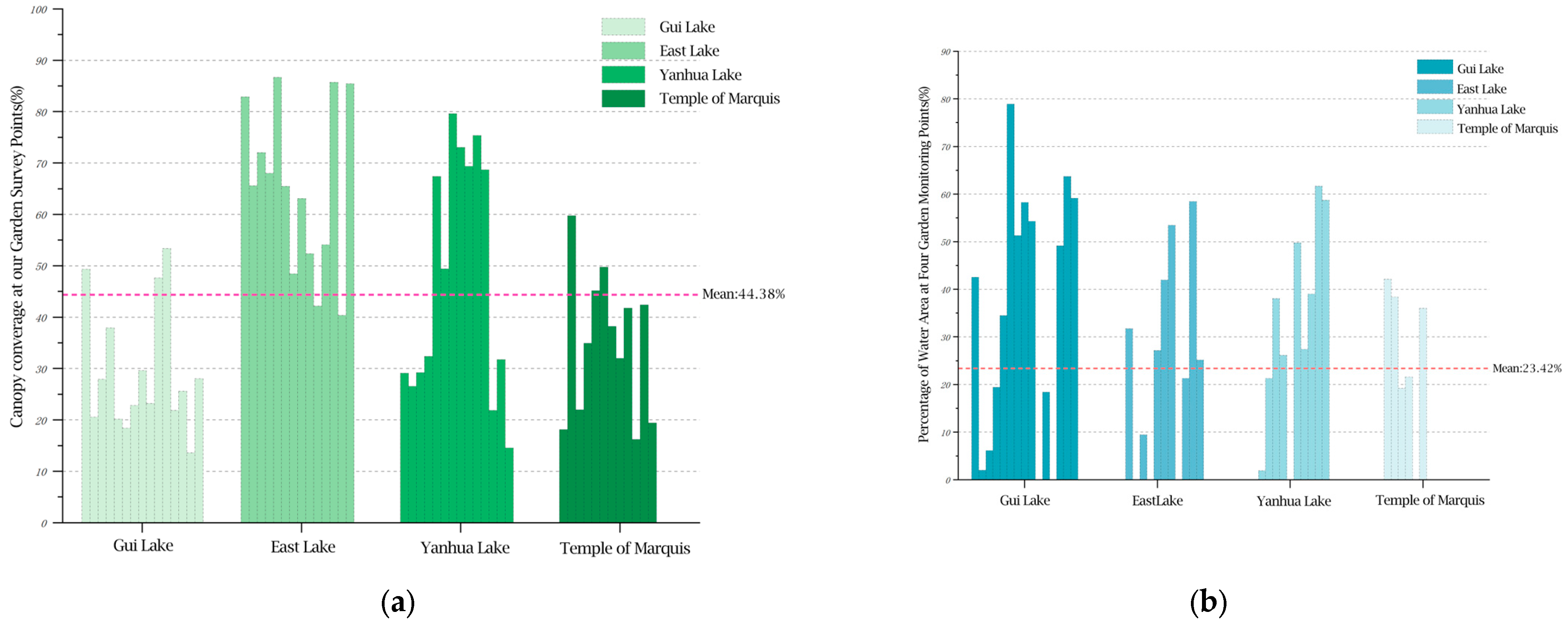 | Gardens | Canopy Coverage | Percentage of Water Area | SVF | ||