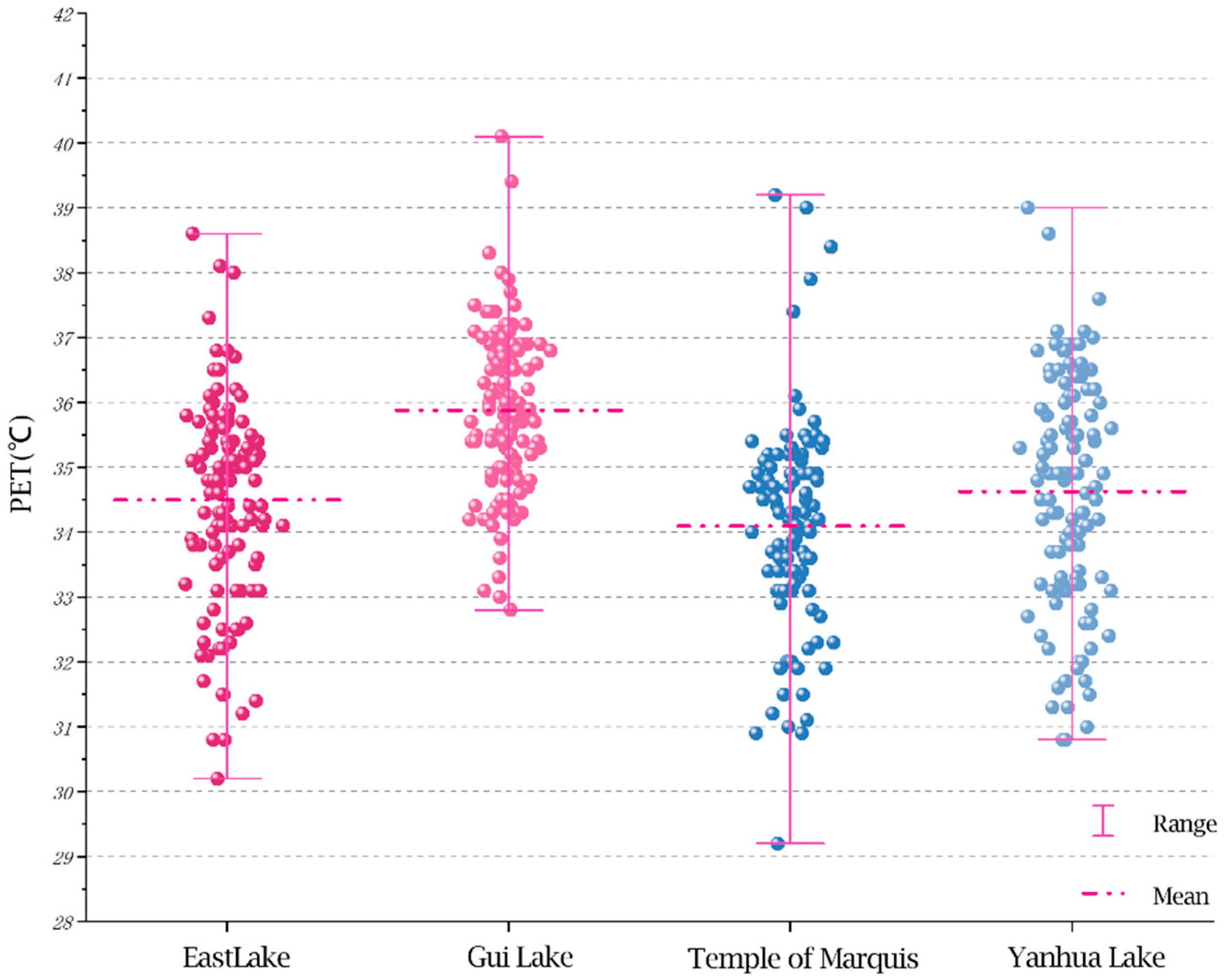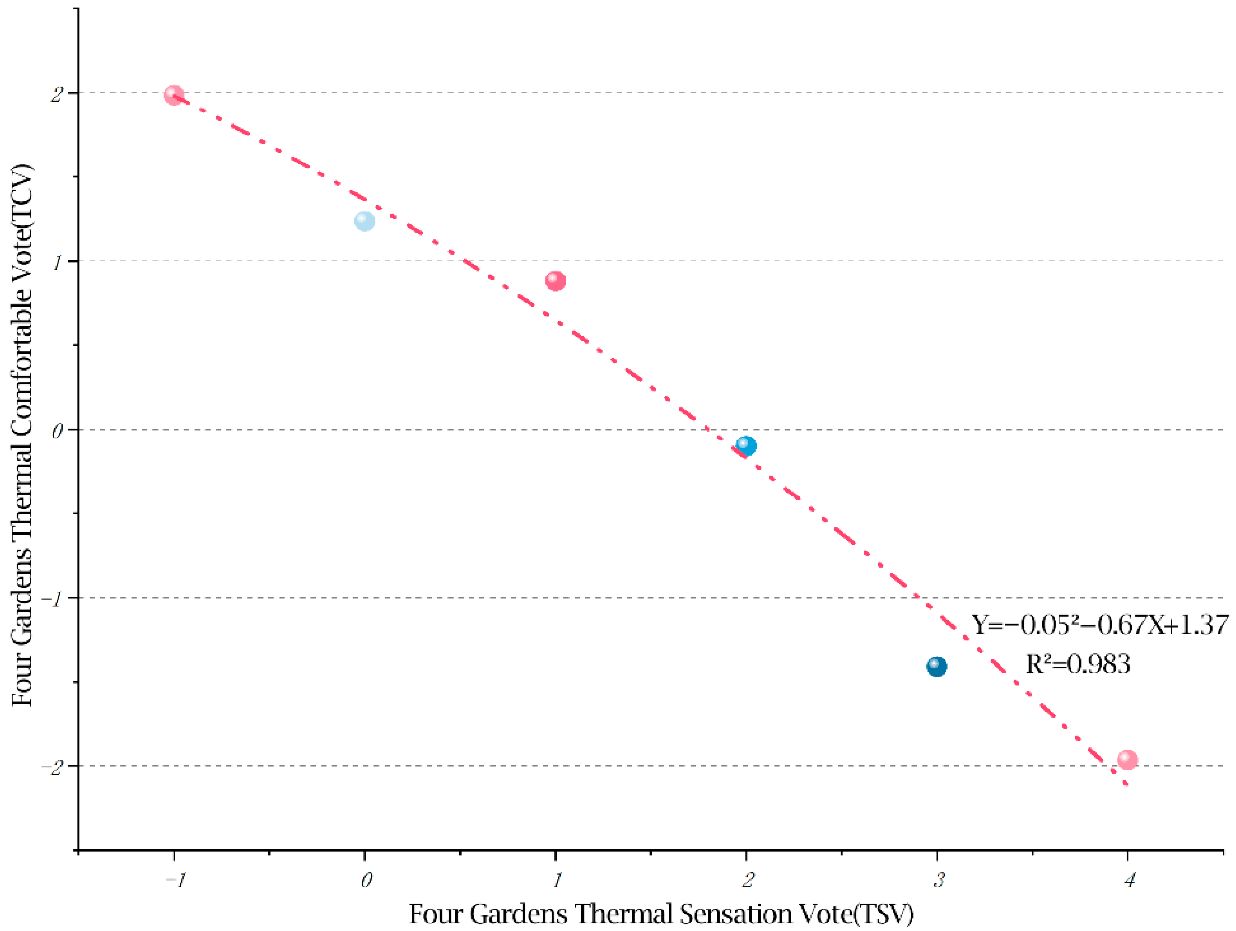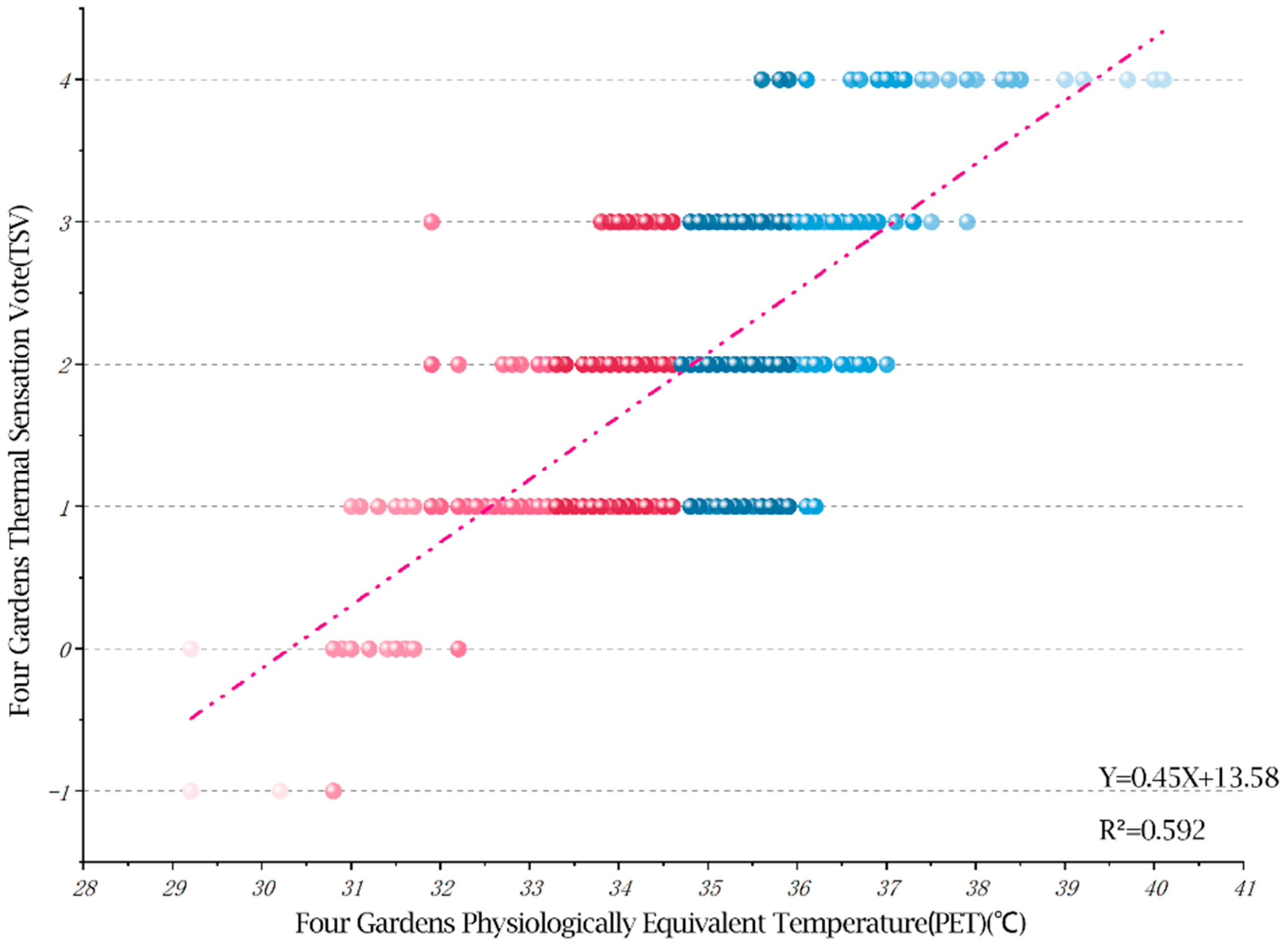 3.1.2. Analysis of PET and Its Correlation with Thermal Comfort and Thermal Sensation in Celebrity Memorial Gardens in Xishu Region