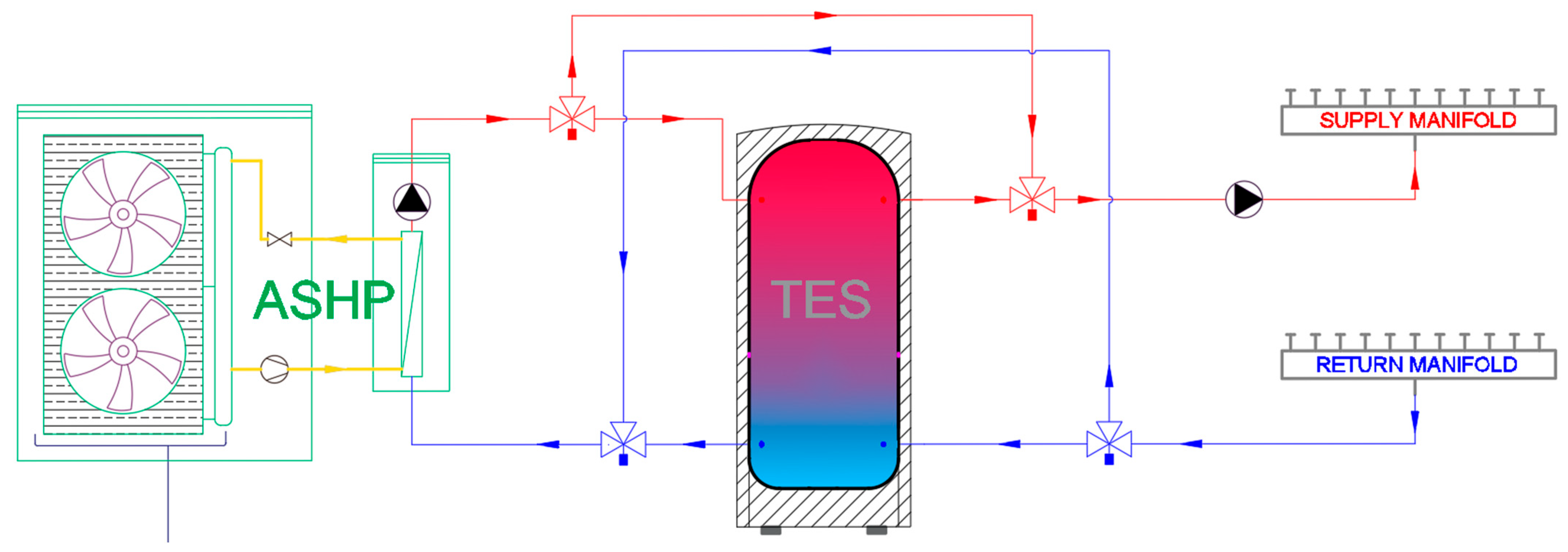 - Zhou, J.; Wu, W.; Bellamy, L.; Bishop, D. Thermal Energy Storage–Coupled Heat Pump Systems: Review of Configurations and Modelling Approaches. Renew. Sustain. Energy Rev. 2026, 226, 116226. [Google Scholar] [CrossRef]