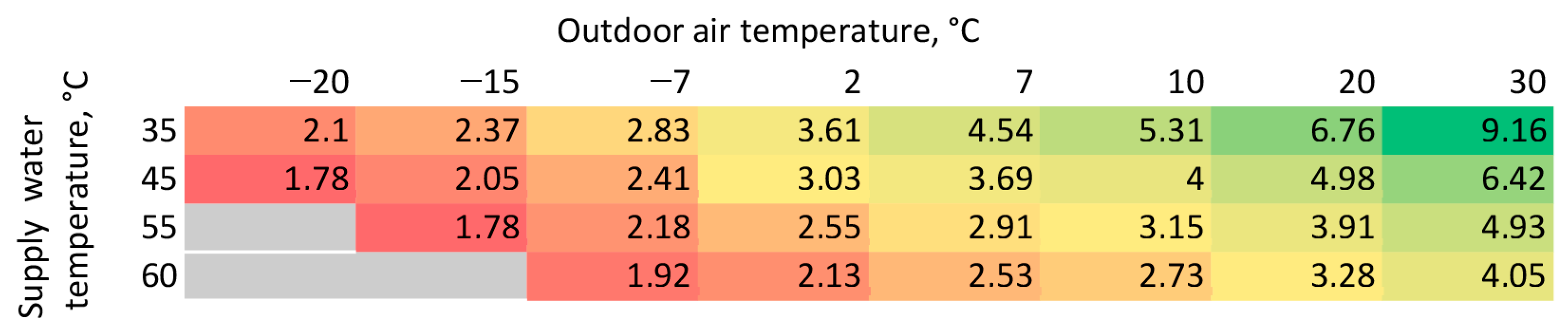 - determination of ASHP operating conditions and corresponding COP values;