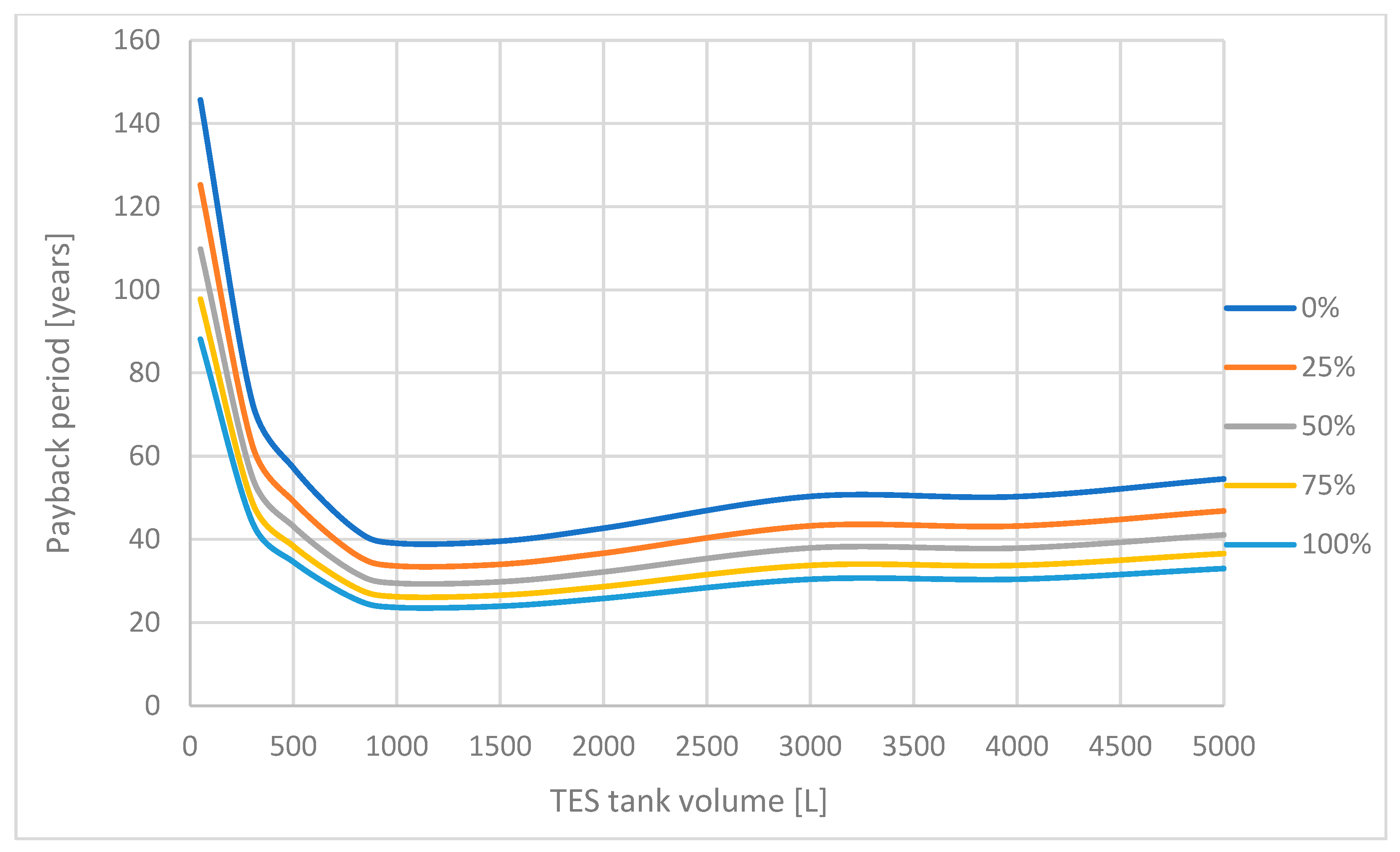 - Energetic saturation is observed above approximately 1000–1500 L storage volume.