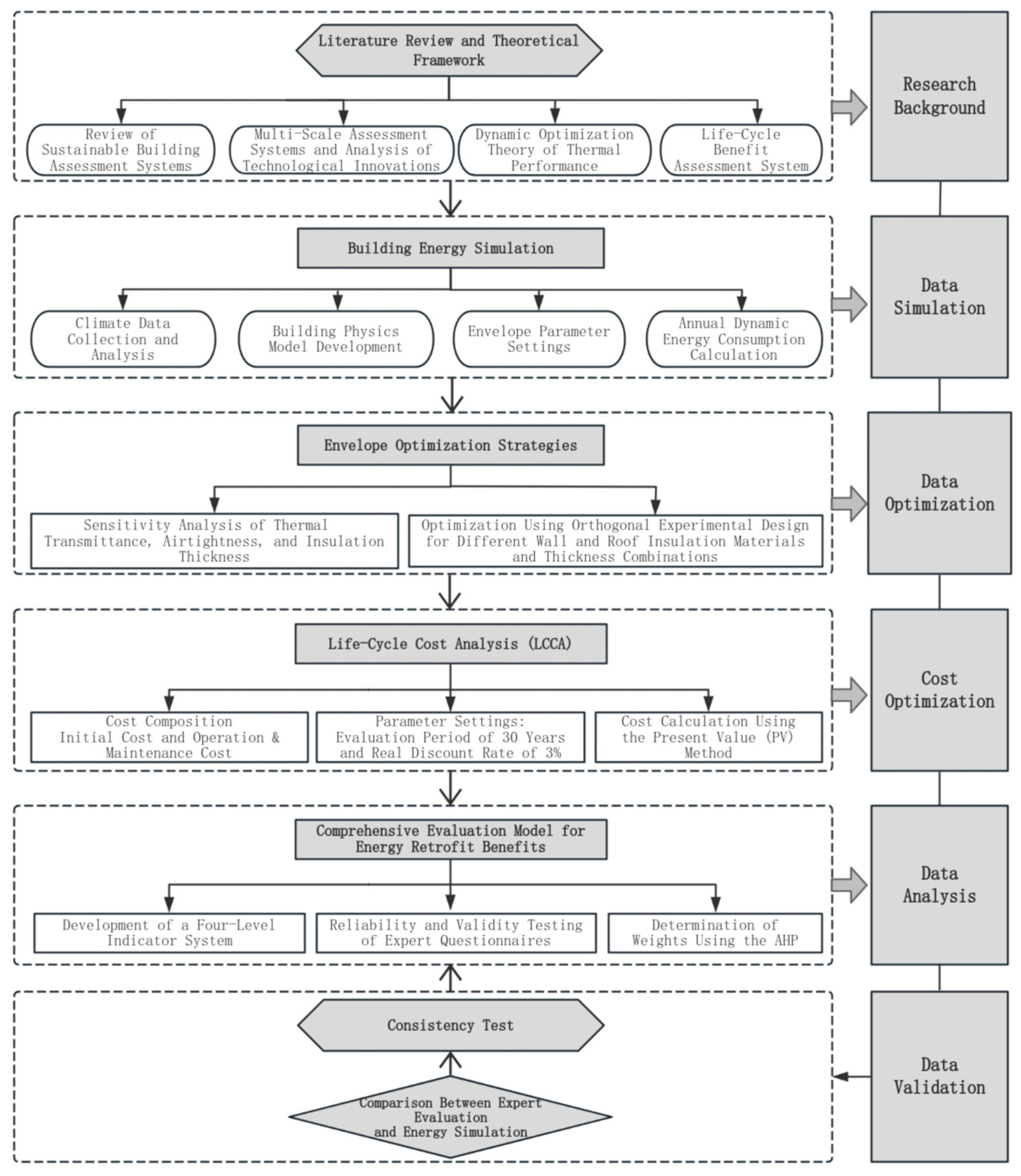 Therefore, there remains a critical need for a quantitative and climate-adaptive decision-support framework that integrates energy simulation, lifecycle evaluation, and expert-based weighting. To address this gap, this study develops a unified multi-dimensional framework combining the Fuzzy Delphi Method and Analytic Hierarchy Process (AHP) to systematically evaluate and prioritize envelope retrofit strategies for existing residential buildings in severe cold regions. By integrating expert judgment, dynamic simulation, and lifecycle economic assessment, the proposed approach enables a robust and comprehensive evaluation of retrofit performance and supports more effective decision-making under climate-specific constraints.