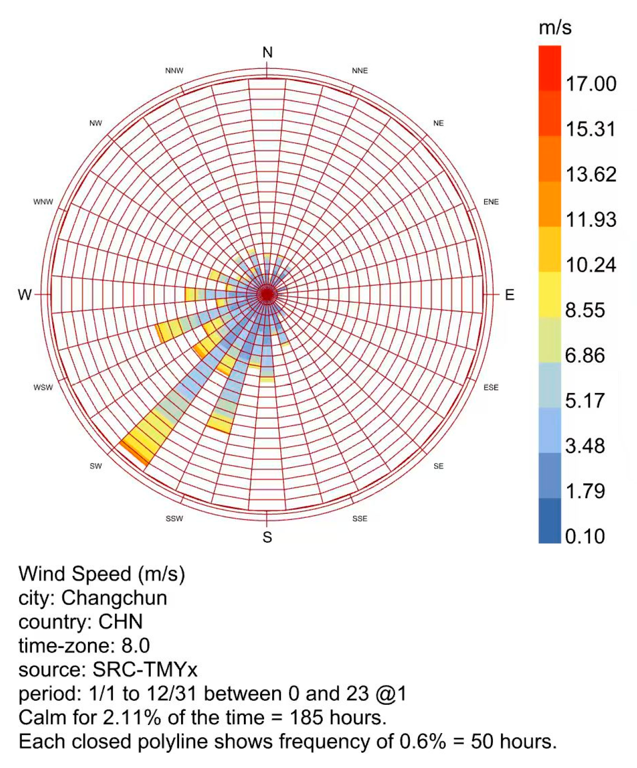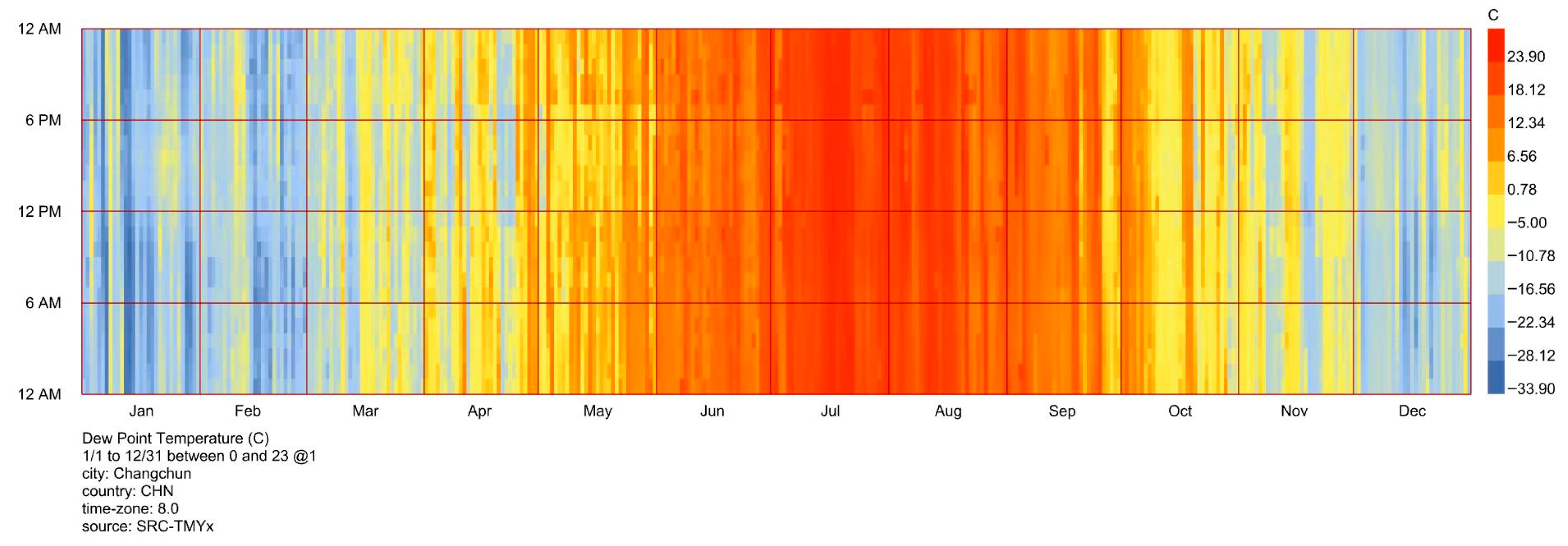 Simultaneously, the annual dew point pattern in Changchun is predominantly driven by seasonal forcing, with a relatively weak diurnal signal; the average hourly values range from approximately −33.9 °C in winter to 23.9 °C in summer, highlighting the critical need for designs accounting for prolonged, profound cold stress (