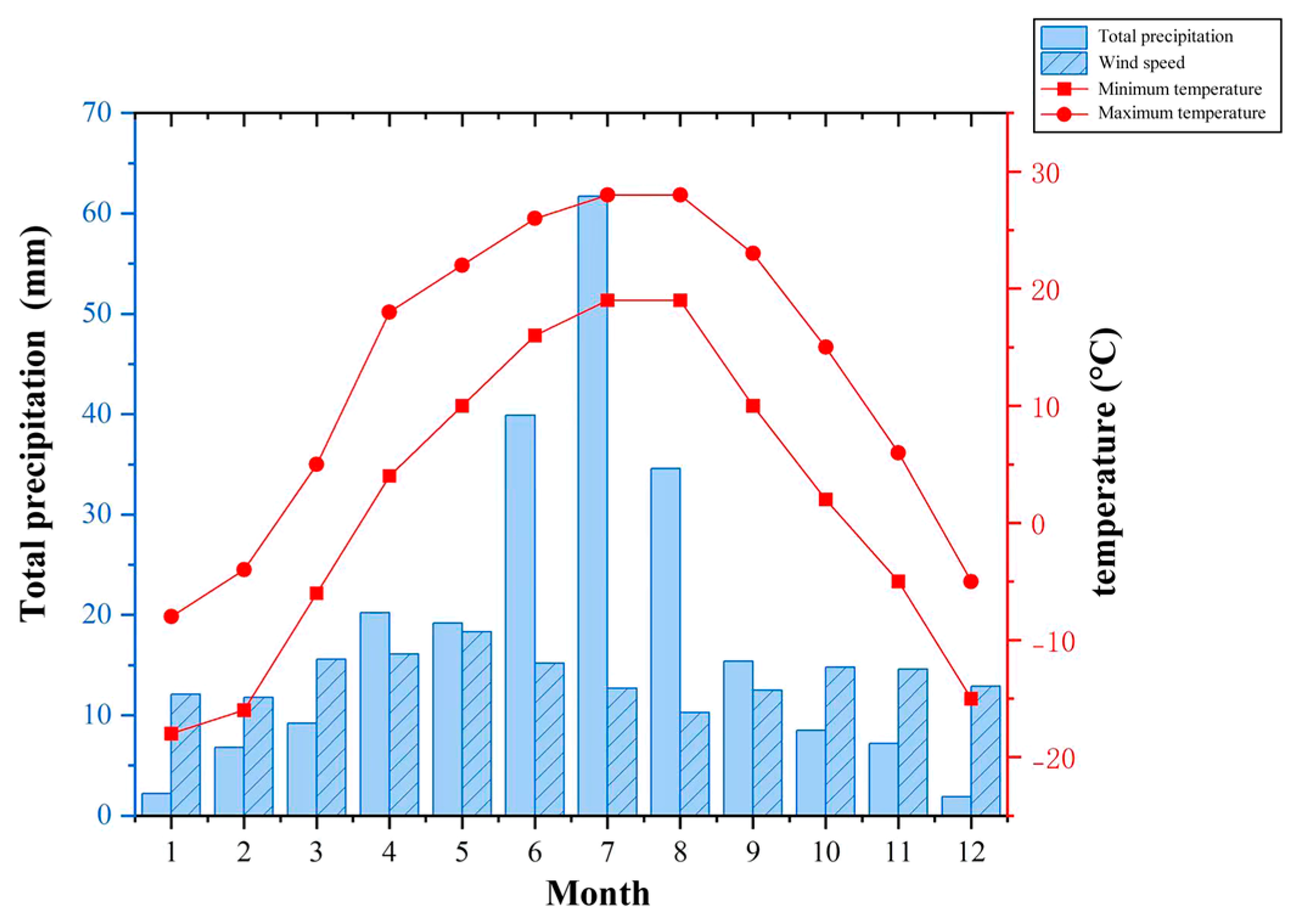 During winter (December–February), the climate is extremely cold, with minimum temperatures reaching −28 °C and maximum temperatures of only 9 °C. In spring (March–May), temperatures rise rapidly, with minimum temperatures increasing from −17 °C to 2 °C and maximum temperatures reaching 31 °C. Summer (June–August) is warm and humid, with maximum temperatures up to 34 °C and minimum temperatures around 9 °C. In autumn (September–November), temperatures decline sharply, with minimum temperatures dropping to −13 °C. The prevailing wind direction in spring is predominantly southwesterly, while northwesterly winds dominate in winter (