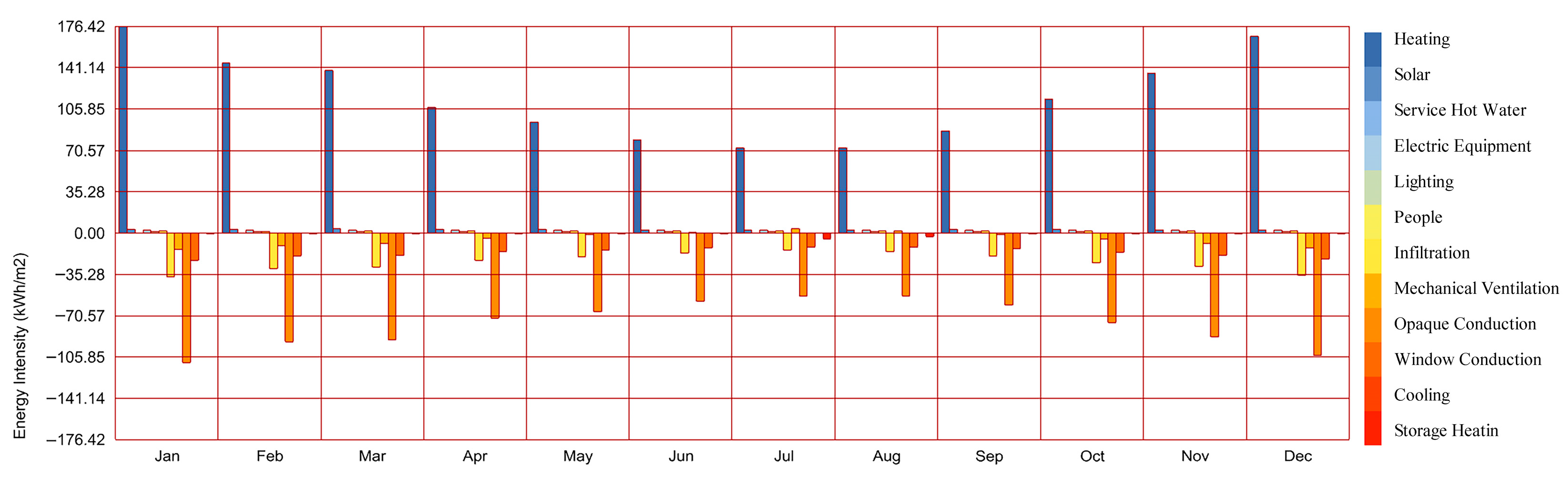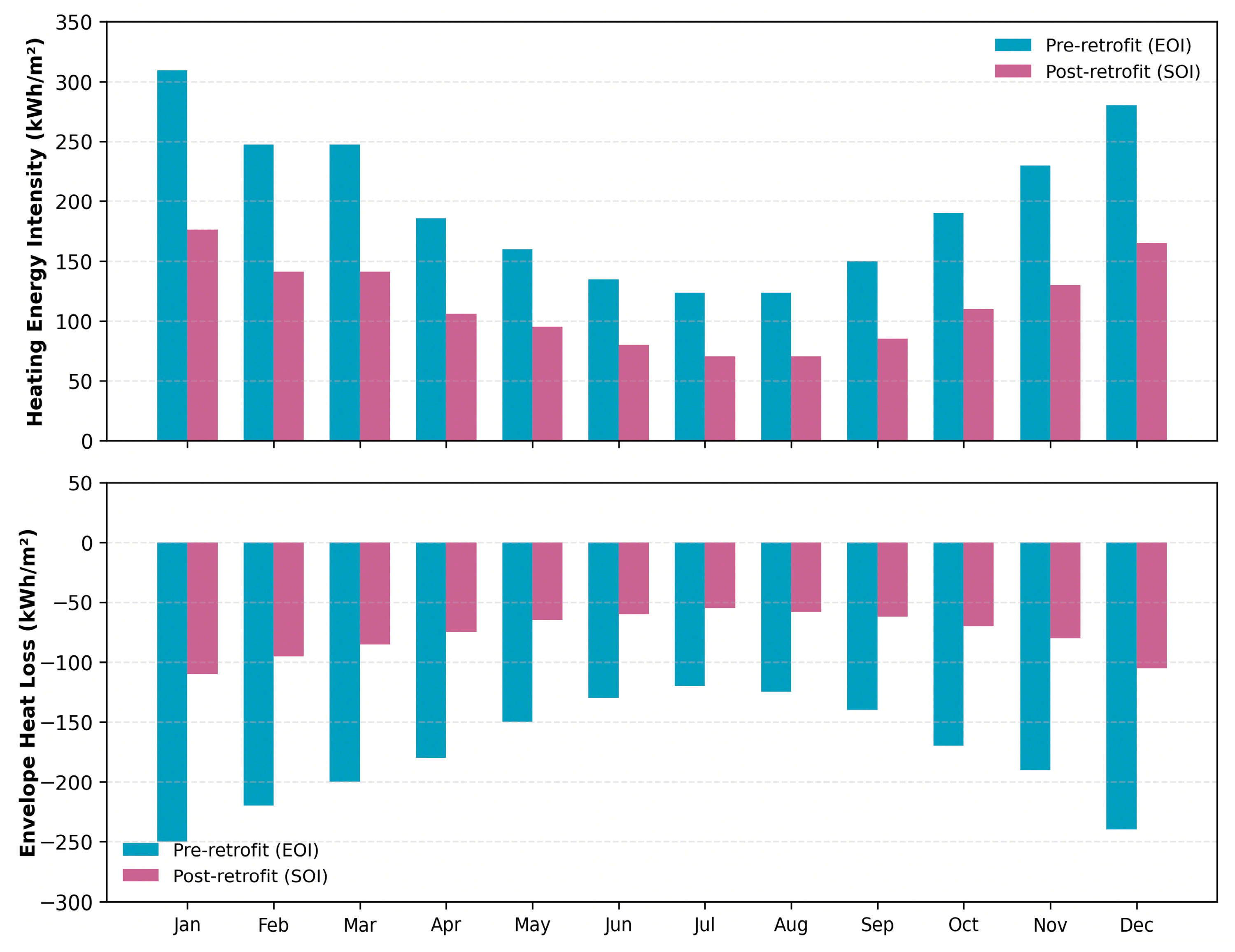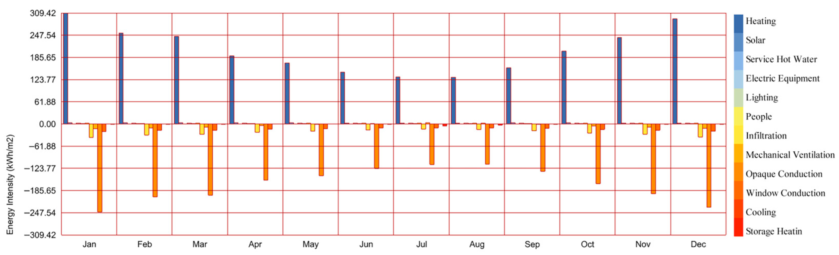 Figure 7. The results show that the case building operates under a clearly heating-dominated load pattern before retrofit. These results confirms that winter heating demand is the principal source of operational energy consumption and therefore provides the climatic and operational basis for prioritizing envelope thermal improvement over other retrofit measures.