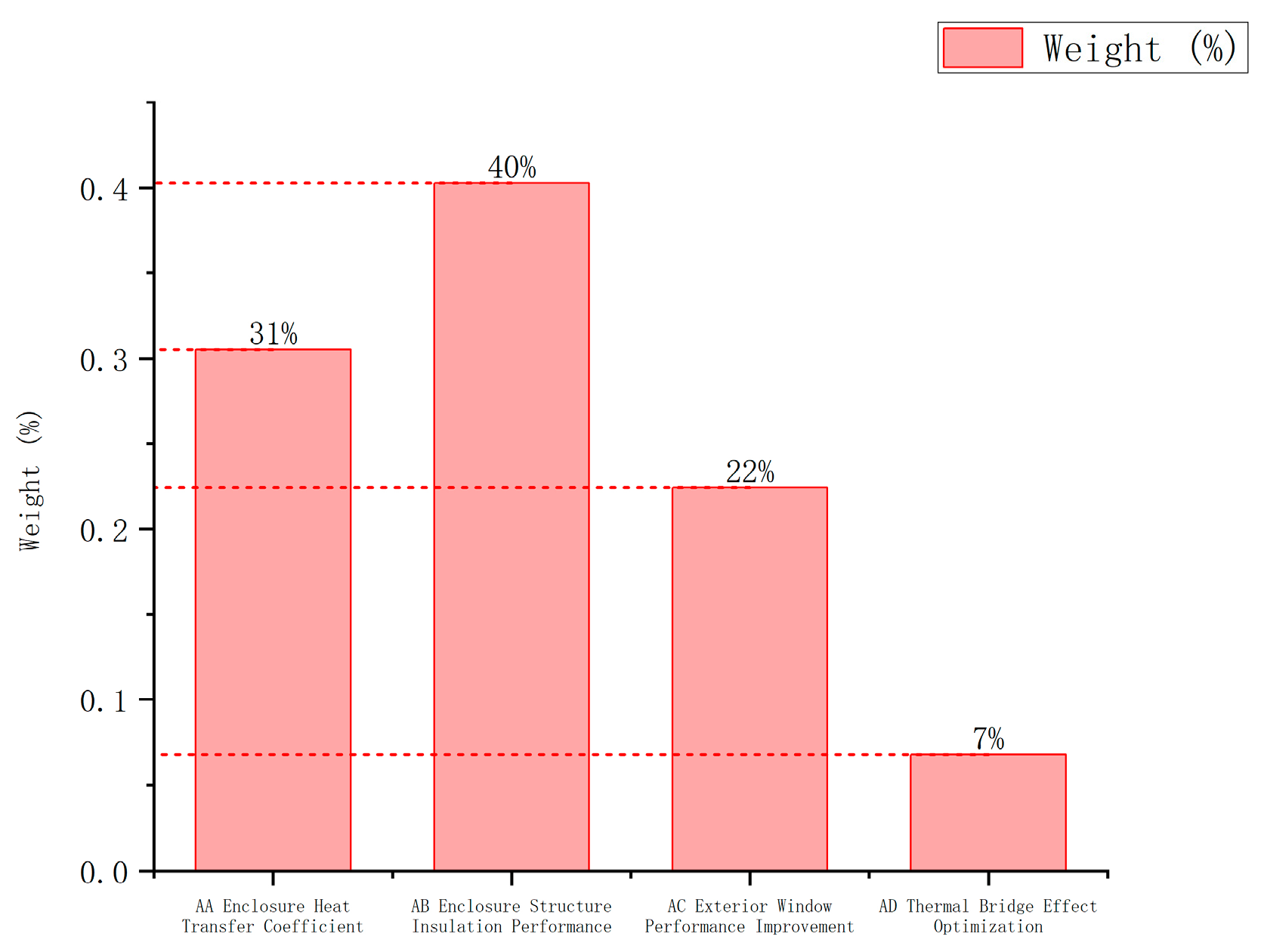 Table 1 lies in providing the physical baseline for the subsequent weighting and simulation analysis. The relatively high thermal transmittance values of the wall, roof, and windows indicate that the existing envelope has insufficient thermal resistance, meaning that excessive heat loss is not an assumed condition but an inherent deficiency of the case-study building.