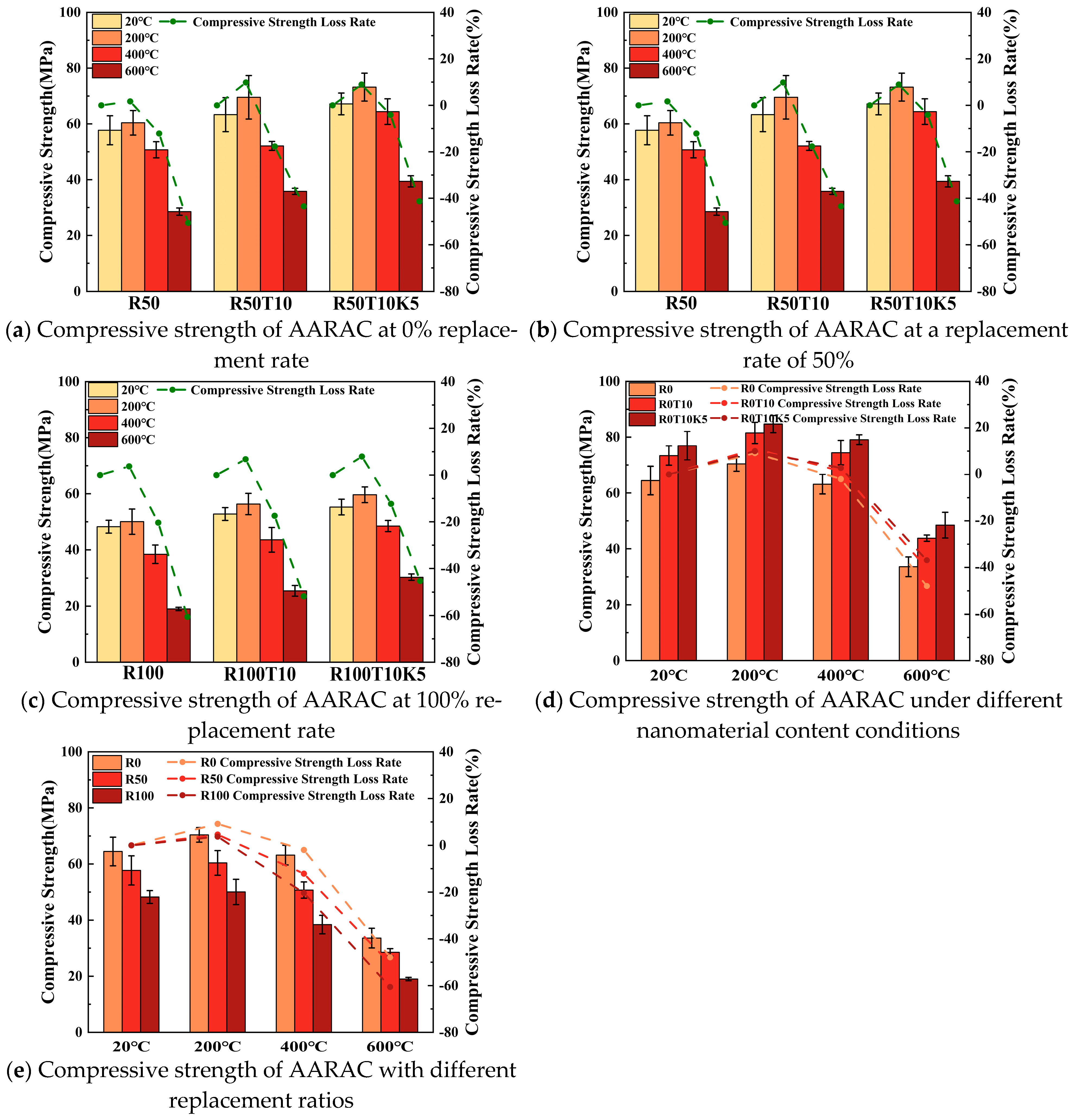 - An increase in the replacement rate of recycled coarse aggregates will significantly reduce the compressive strength of AARAC specimens at high temperatures. When the replacement rate increases from 0% to 100%, the compressive strength loss rate of AARAC without nanomaterial addition increases from 47.9% to 60.6% after exposure to 600 °C. The distribution of cracks in the specimens after compression becomes more dense, and the fragmentation during failure is more thorough.